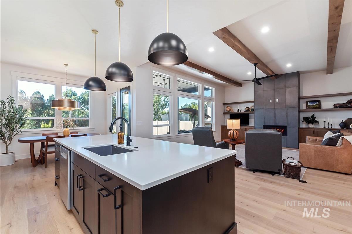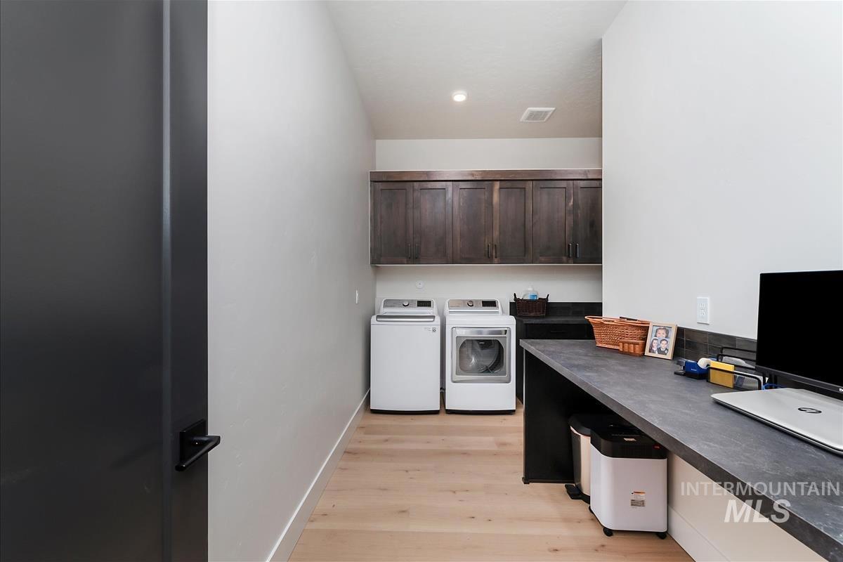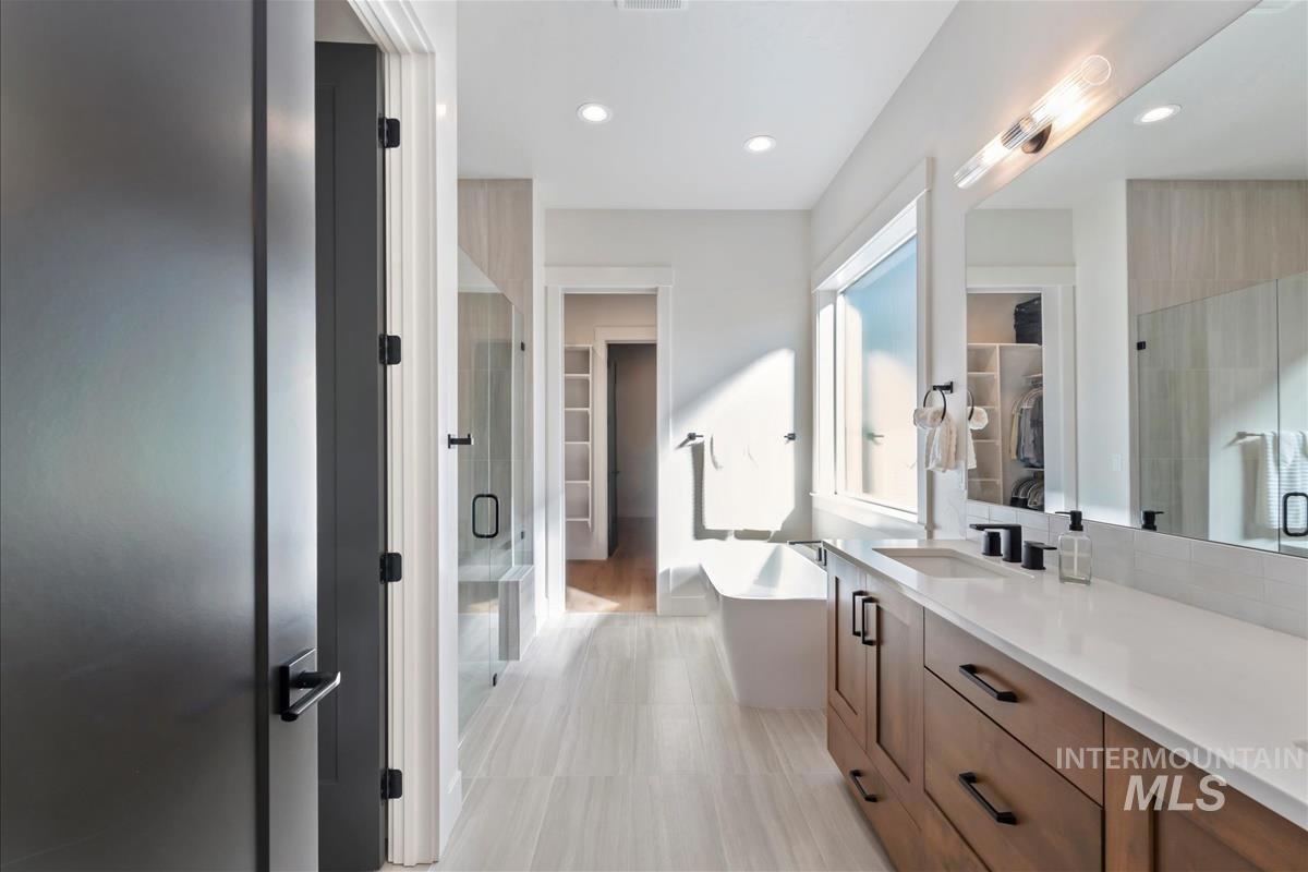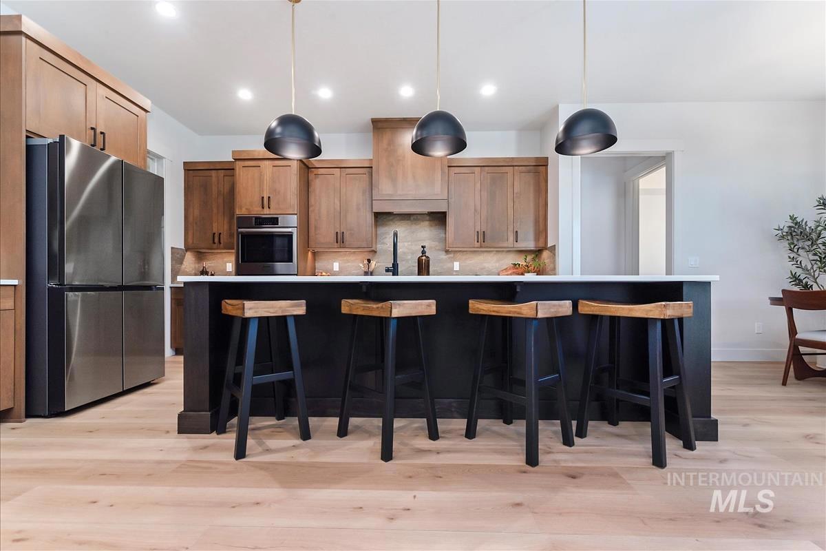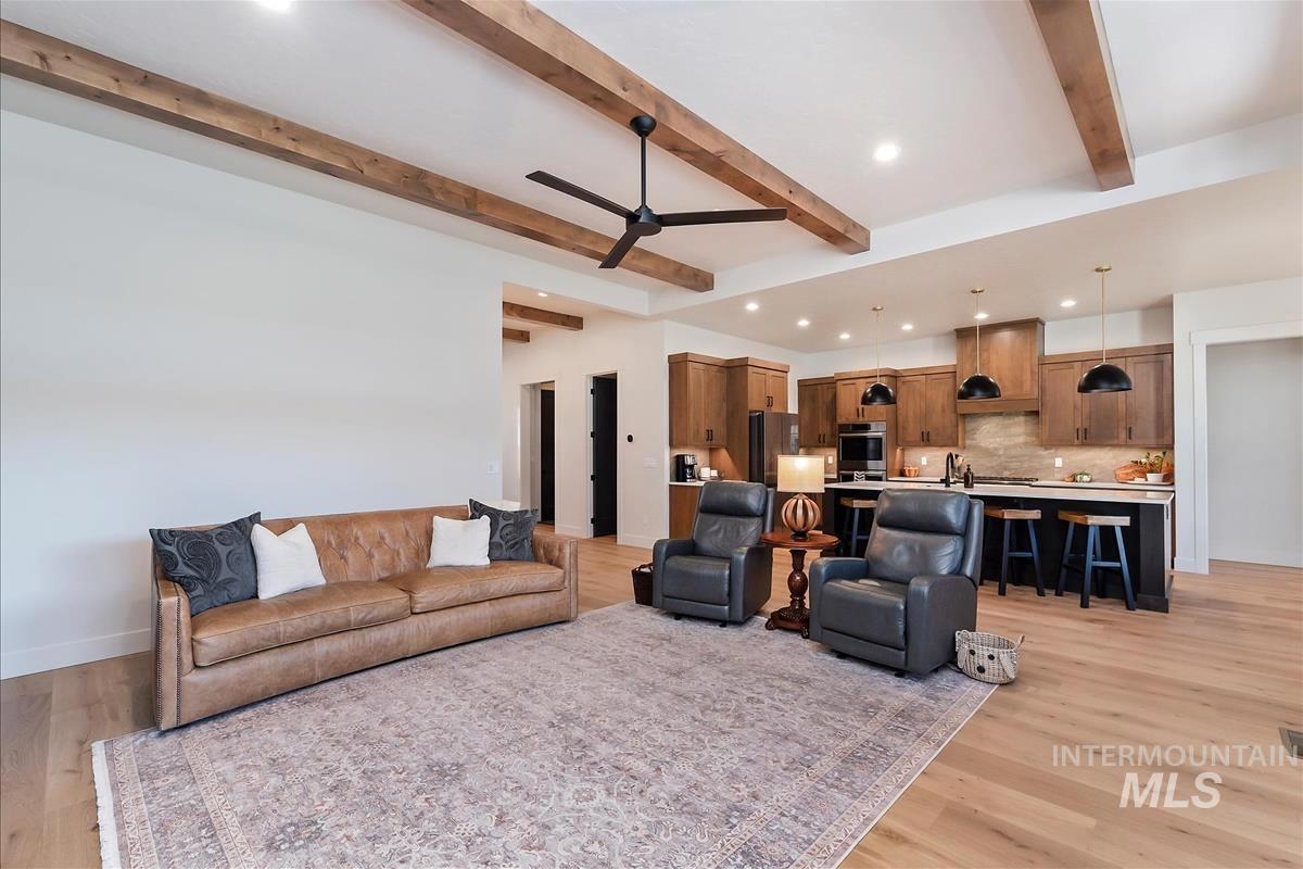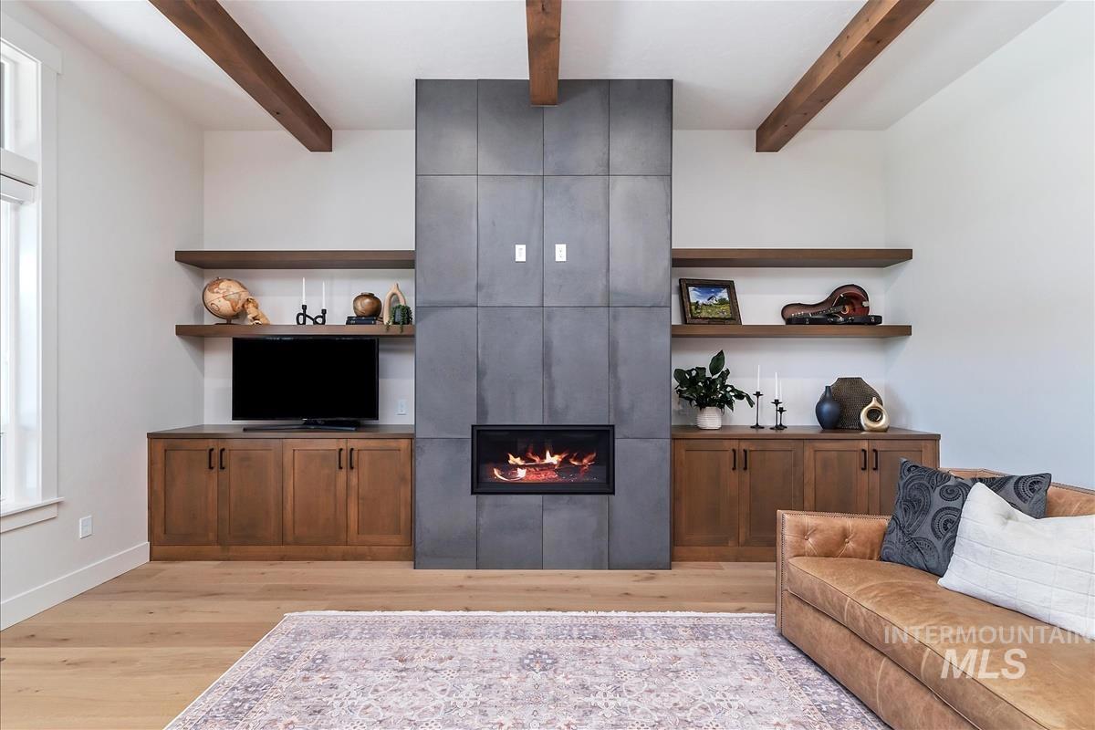 The home you’ve been dreaming about! The massive covered patio overlooks mature trees & open space – it feels like you’re looking at a forest! No back neighbors means peaceful living in your backyard! This home blends thoughtful design & loads of quality upgrades! Window tinting added to all South-facing windows. Floor outlets add convenience in Great Room & front bedroom/office. Extra soffit outlets for Christmas lights & gas stub for patio ceiling heaters. CAT5 data ports installed in the Great Room, laundry/office, primary & front bedroom. The entryway & garage benefit from privacy obscure glass. Luxury LVP extends through the main living spaces & large mudbench off the garage entry. Upgraded wood cabinet boxes with soft close doors/drawers, quartz countertops, double ovens, built-in gas cooktop & oversized pantry with countertop & extra outlets. A barn door enhances the usability of the front bedroom, creating flexibility for work or guests. Every detail in this home balance everyday function with elevated finishes.