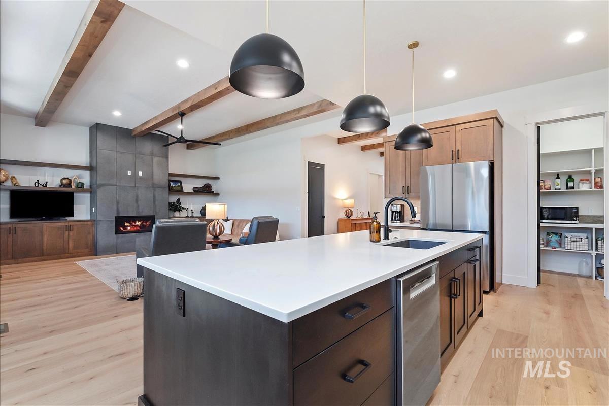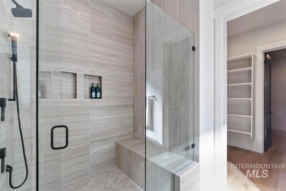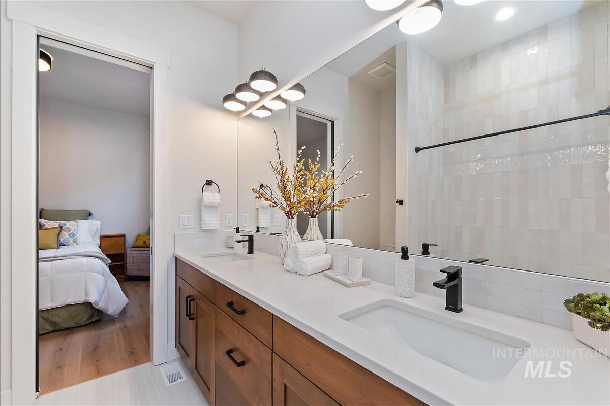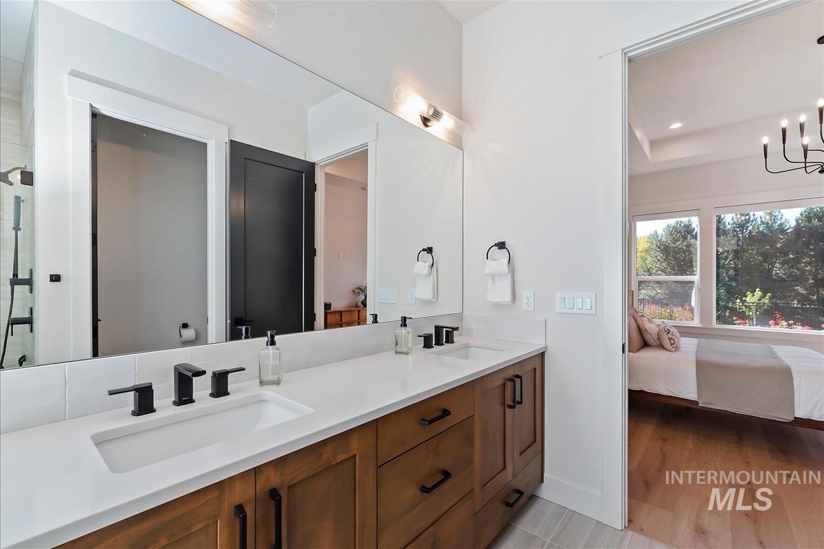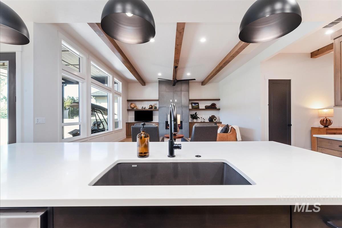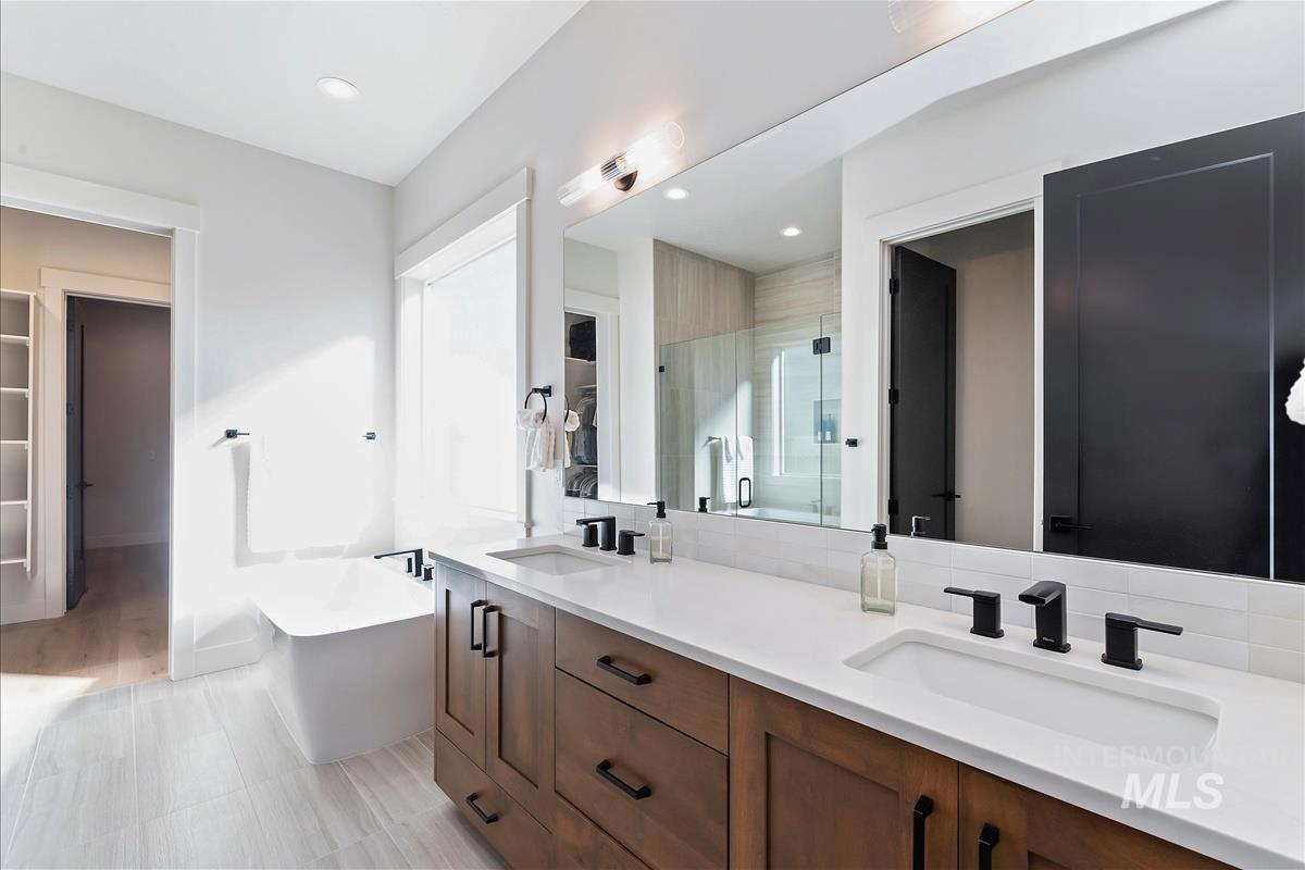 The home you’ve been dreaming about! The massive covered patio overlooks mature trees & open space – it feels like you’re looking at a forest! No back neighbors means peaceful living in your backyard! This home blends thoughtful design & loads of quality upgrades! Window tinting added to all South-facing windows. Floor outlets add convenience in Great Room & front bedroom/office. Extra soffit outlets for Christmas lights & gas stub for patio ceiling heaters. CAT5 data ports installed in the Great Room, laundry/office, primary & front bedroom. The entryway & garage benefit from privacy obscure glass. Luxury LVP extends through the main living spaces & large mudbench off the garage entry. Upgraded wood cabinet boxes with soft close doors/drawers, quartz countertops, double ovens, built-in gas cooktop & oversized pantry with countertop & extra outlets. A barn door enhances the usability of the front bedroom, creating flexibility for work or guests. Every detail in this home balance everyday function with elevated finishes.