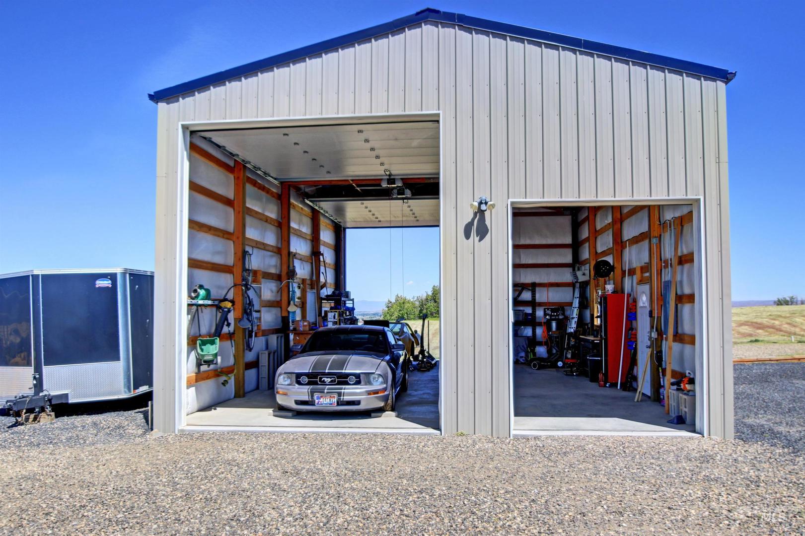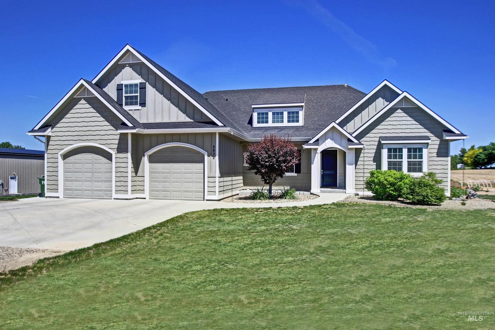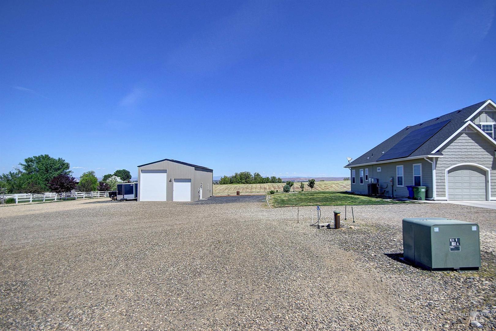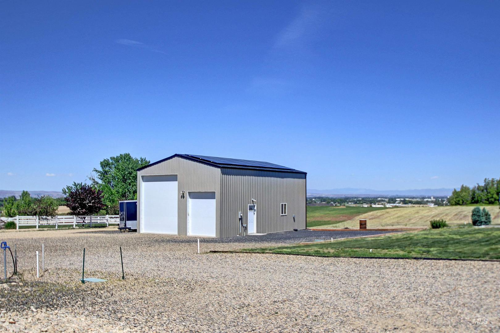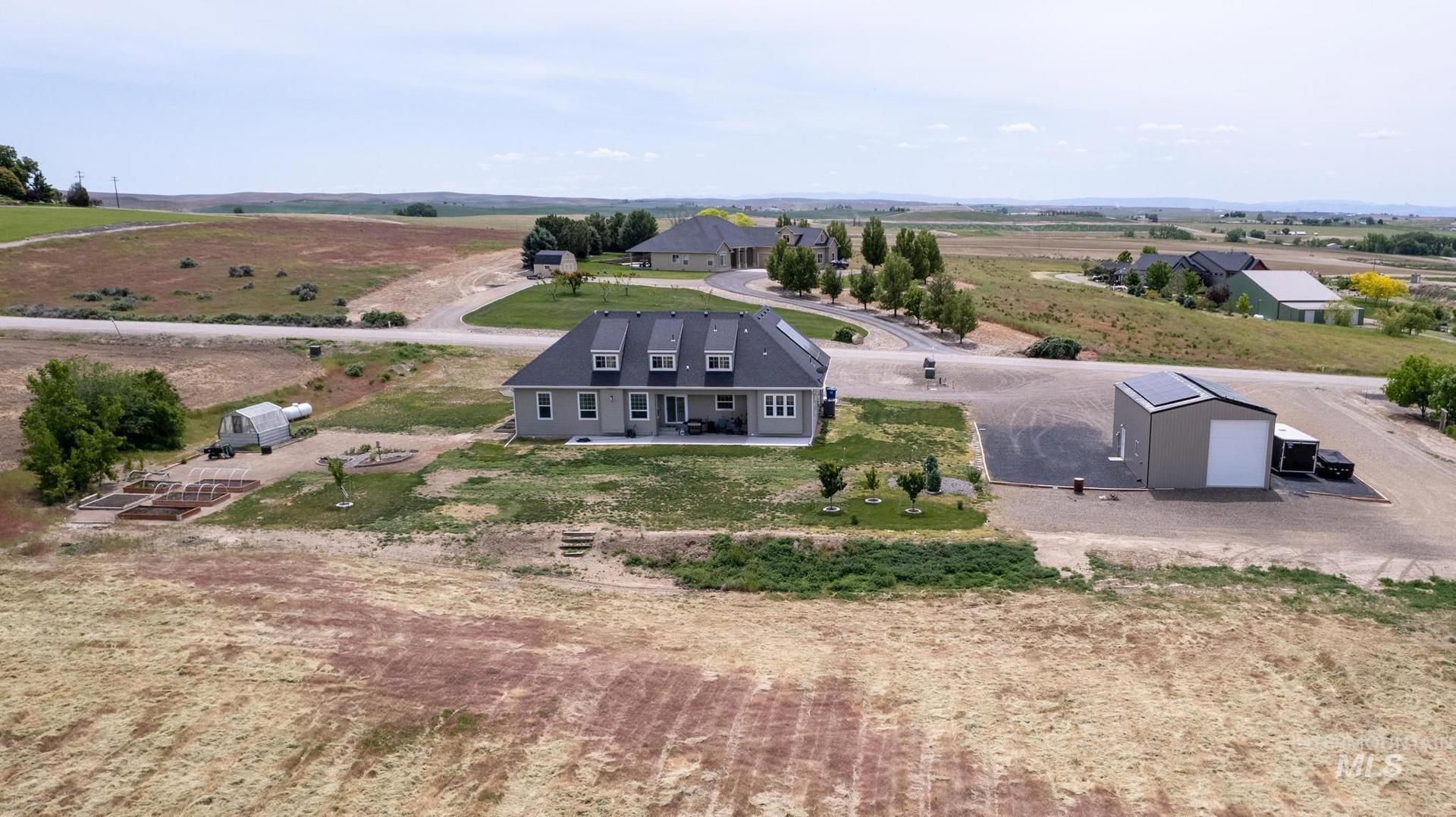 Beautiful home with views of the entire valley! Newer remodeled kitchen w/custom soft-close cabinetry, lighting, double oven, granite counters & island. Walk-in pantry & beautiful easy care LVP flooring flow to a large Family Rm built for entertaining w/cozy fireplace & expansive windows. Extensive millwork & HVAC appx 2 years old. Main level includes office w/closet, 2 great sized bedrooms w/ceiling fans & luxurious Primary boasts new carpet, fully tiled walk-in shower, dual vanity & private water closet. Upstairs find HUGE Bonus & 3 additional bedrms+2nd laundry hookup in storage closet. N facing backyard w/fruit trees, greenhouse w/concrete floor & raised garden beds. Fully insulated 1000sqft, 40x25 shop w/pull through RV/boat doors. Sep power w/220 outlet, RV 30 Amp plug, 2 electric heaters, surrounded by parking. Finished garage w/tons of storage options. 3.55 acres taxed as AG. Possible 1,500 sqft ADU could be built. Pvt well & septic. Solar panels for low ID Power bill. No HOA/CCRs!