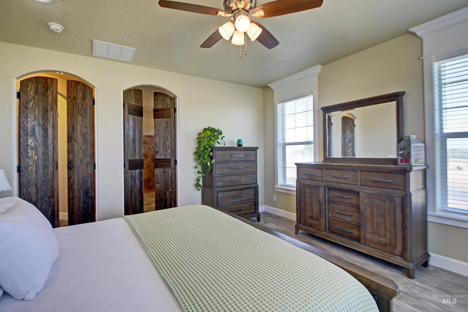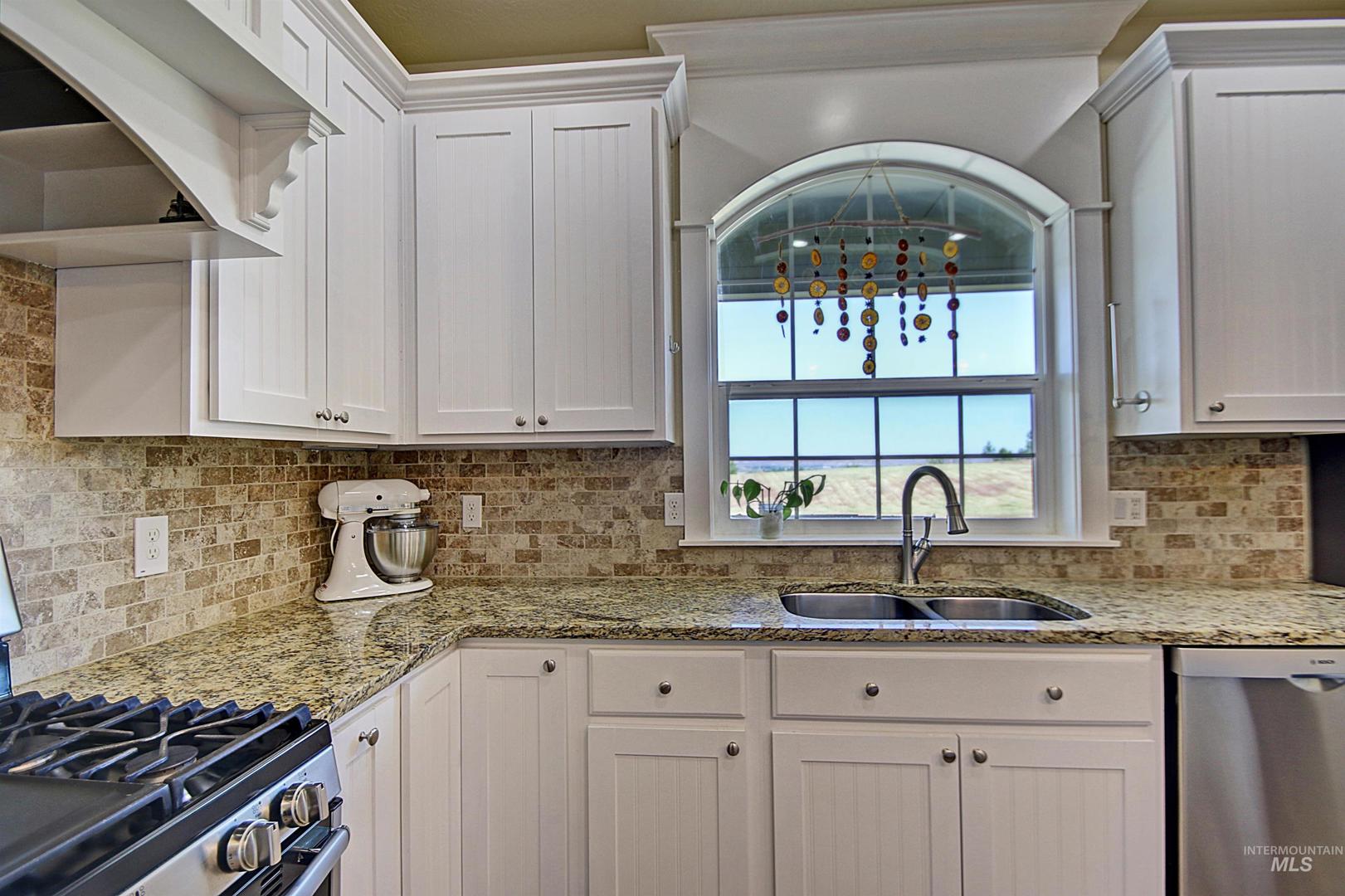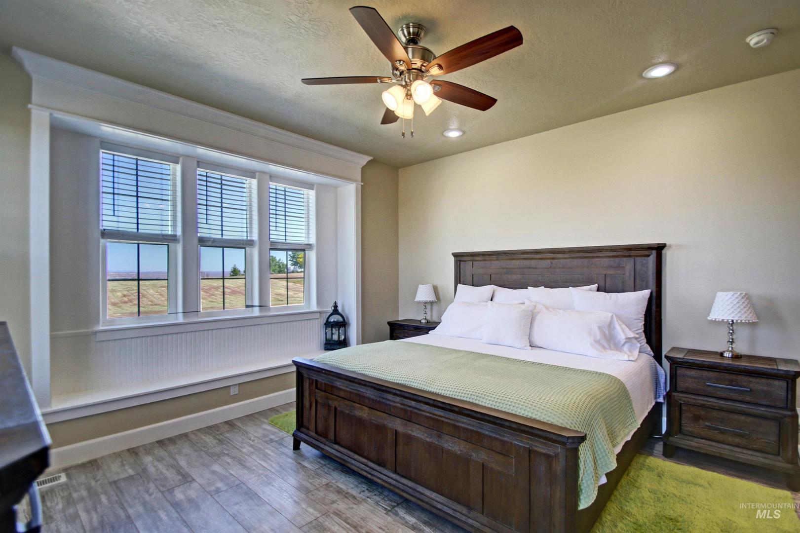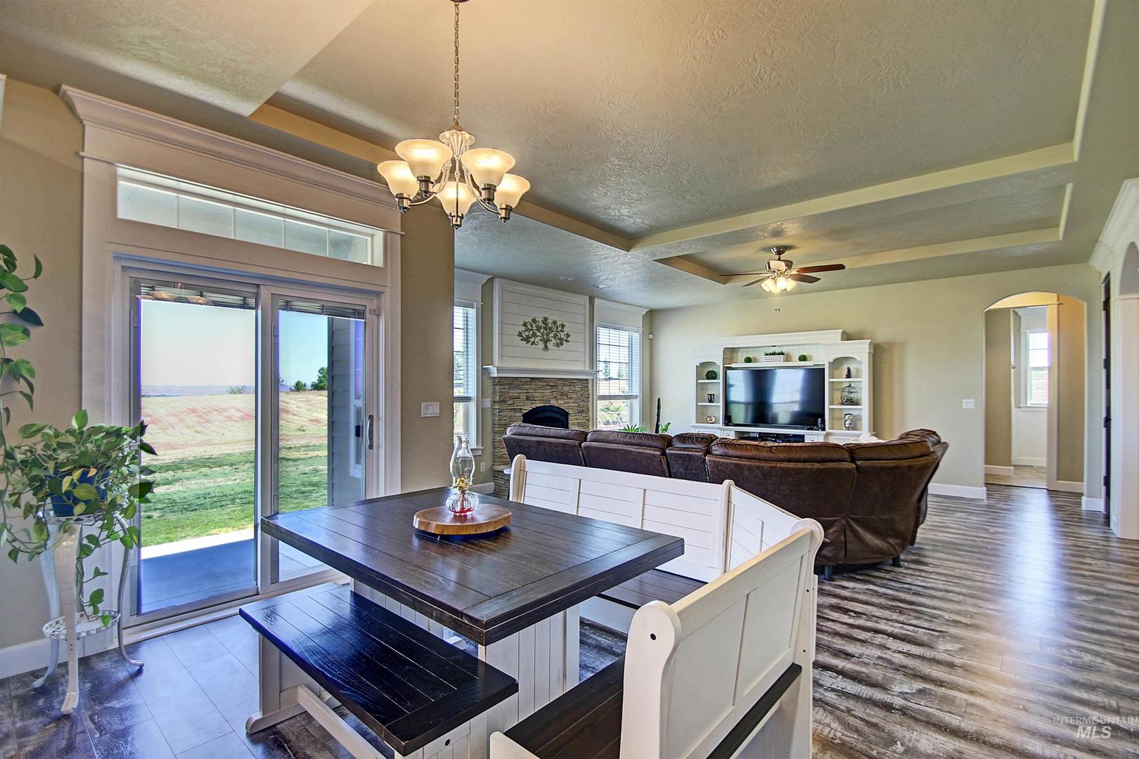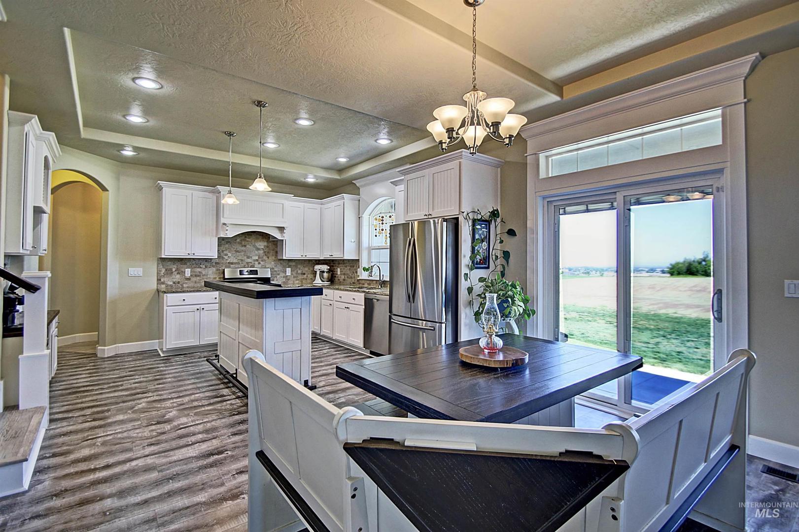 Beautiful home with views of the entire valley! Newer remodeled kitchen w/custom soft-close cabinetry, lighting, double oven, granite counters & island. Walk-in pantry & beautiful easy care LVP flooring flow to a large Family Rm built for entertaining w/cozy fireplace & expansive windows. Extensive millwork & HVAC appx 2 years old. Main level includes office w/closet, 2 great sized bedrooms w/ceiling fans & luxurious Primary boasts new carpet, fully tiled walk-in shower, dual vanity & private water closet. Upstairs find HUGE Bonus & 3 additional bedrms+2nd laundry hookup in storage closet. N facing backyard w/fruit trees, greenhouse w/concrete floor & raised garden beds. Fully insulated 1000sqft, 40x25 shop w/pull through RV/boat doors. Sep power w/220 outlet, RV 30 Amp plug, 2 electric heaters, surrounded by parking. Finished garage w/tons of storage options. 3.55 acres taxed as AG. Possible 1,500 sqft ADU could be built. Pvt well & septic. Solar panels for low ID Power bill. No HOA/CCRs!
