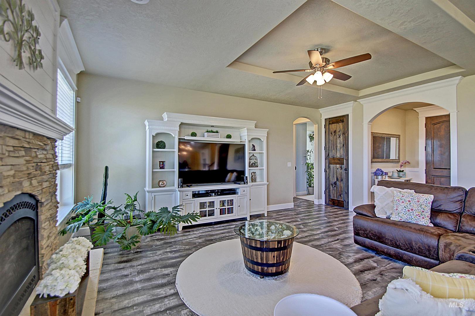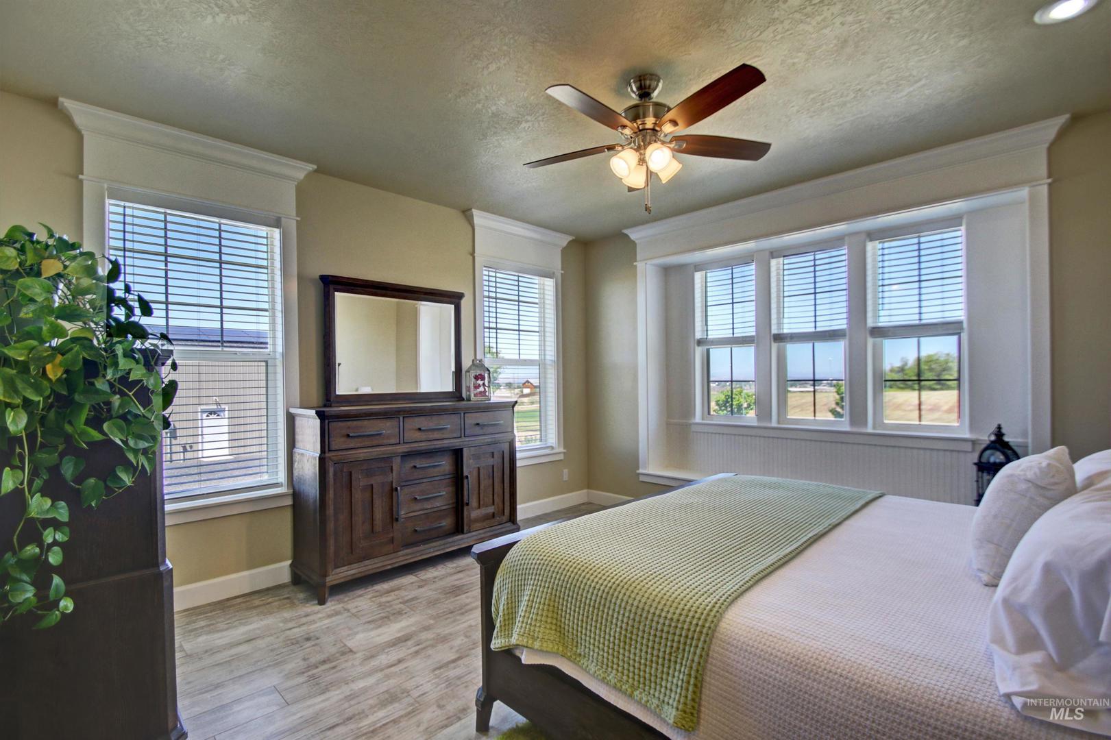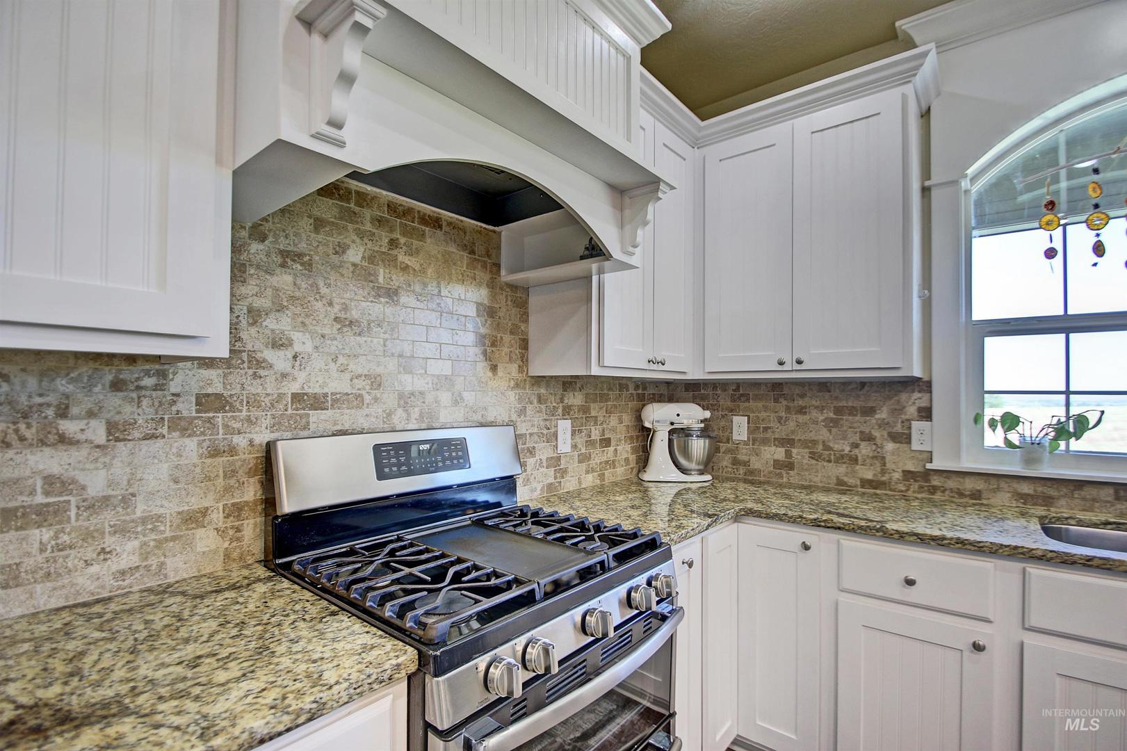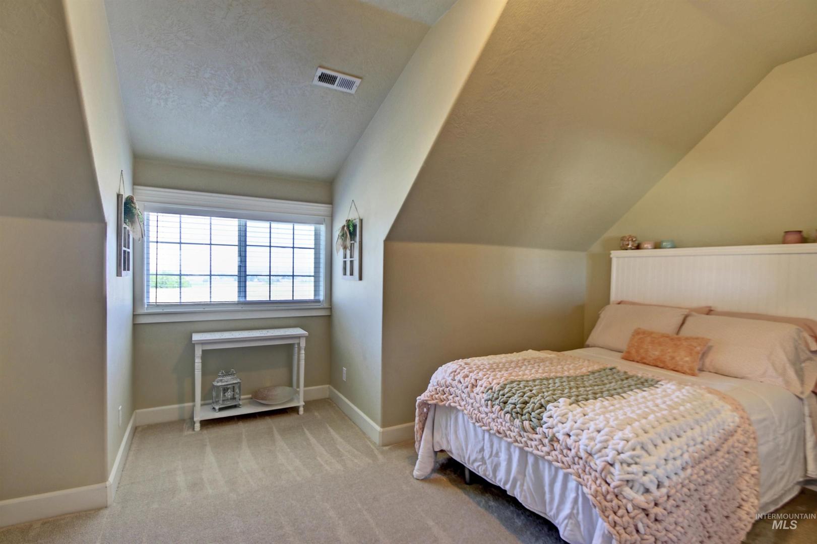 Beautiful home with views of the entire valley! Newer remodeled kitchen w/custom soft-close cabinetry, lighting, double oven, granite counters & island. Walk-in pantry & beautiful easy care LVP flooring flow to a large Family Rm built for entertaining w/cozy fireplace & expansive windows. Extensive millwork & HVAC appx 2 years old. Main level includes office w/closet, 2 great sized bedrooms w/ceiling fans & luxurious Primary boasts new carpet, fully tiled walk-in shower, dual vanity & private water closet. Upstairs find HUGE Bonus & 3 additional bedrms+2nd laundry hookup in storage closet. N facing backyard w/fruit trees, greenhouse w/concrete floor & raised garden beds. Fully insulated 1000sqft, 40x25 shop w/pull through RV/boat doors. Sep power w/220 outlet, RV 30 Amp plug, 2 electric heaters, surrounded by parking. Finished garage w/tons of storage options. 3.55 acres taxed as AG. Possible 1,500 sqft ADU could be built. Pvt well & septic. Solar panels for low ID Power bill. No HOA/CCRs!