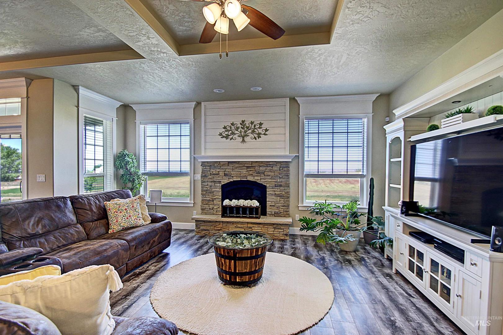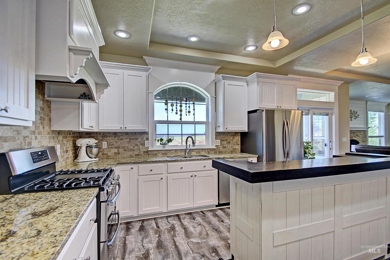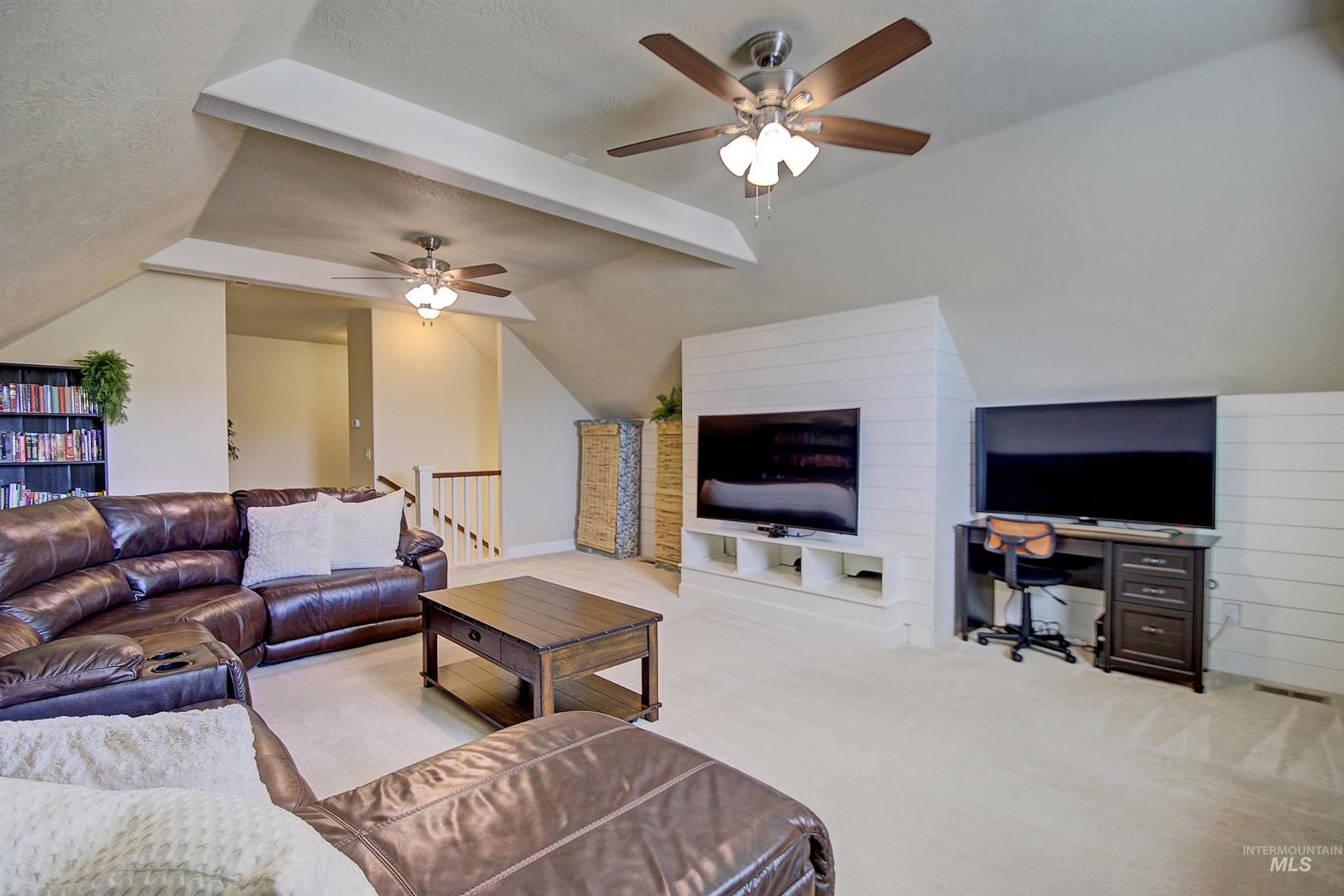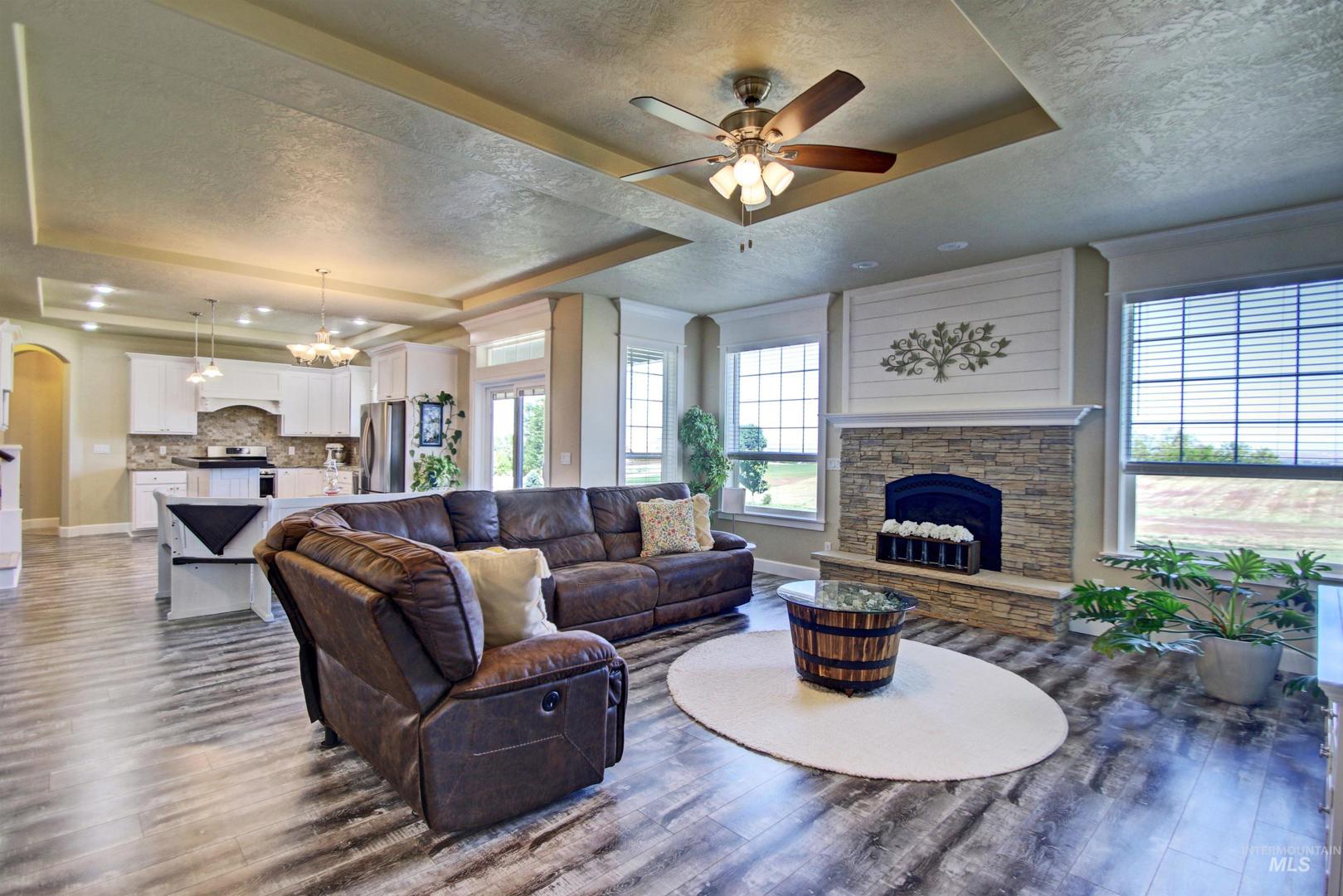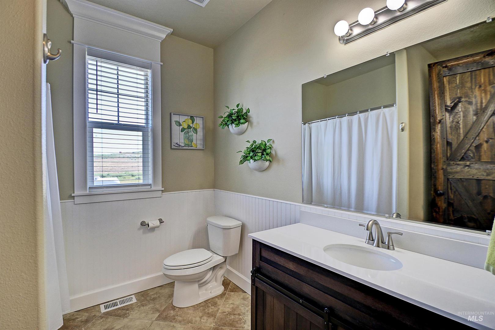 Beautiful home with views of the entire valley! Newer remodeled kitchen w/custom soft-close cabinetry, lighting, double oven, granite counters & island. Walk-in pantry & beautiful easy care LVP flooring flow to a large Family Rm built for entertaining w/cozy fireplace & expansive windows. Extensive millwork & HVAC appx 2 years old. Main level includes office w/closet, 2 great sized bedrooms w/ceiling fans & luxurious Primary boasts new carpet, fully tiled walk-in shower, dual vanity & private water closet. Upstairs find HUGE Bonus & 3 additional bedrms+2nd laundry hookup in storage closet. N facing backyard w/fruit trees, greenhouse w/concrete floor & raised garden beds. Fully insulated 1000sqft, 40x25 shop w/pull through RV/boat doors. Sep power w/220 outlet, RV 30 Amp plug, 2 electric heaters, surrounded by parking. Finished garage w/tons of storage options. 3.55 acres taxed as AG. Possible 1,500 sqft ADU could be built. Pvt well & septic. Solar panels for low ID Power bill. No HOA/CCRs!