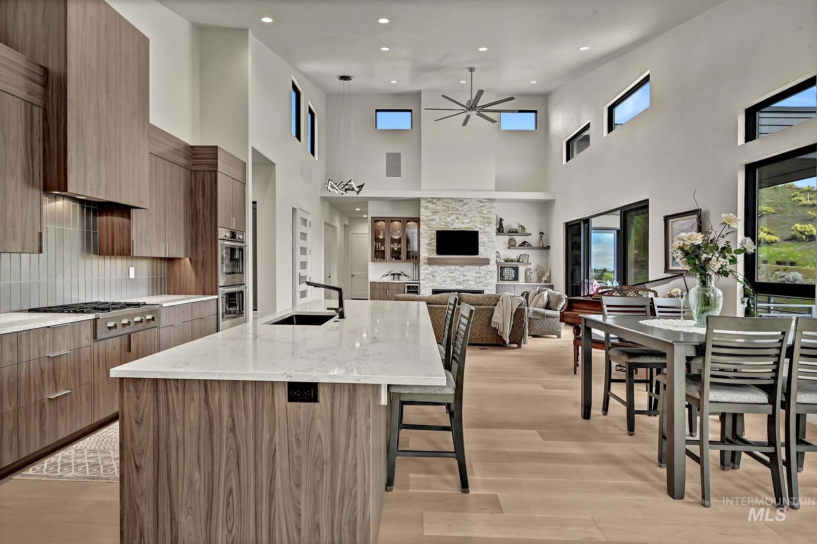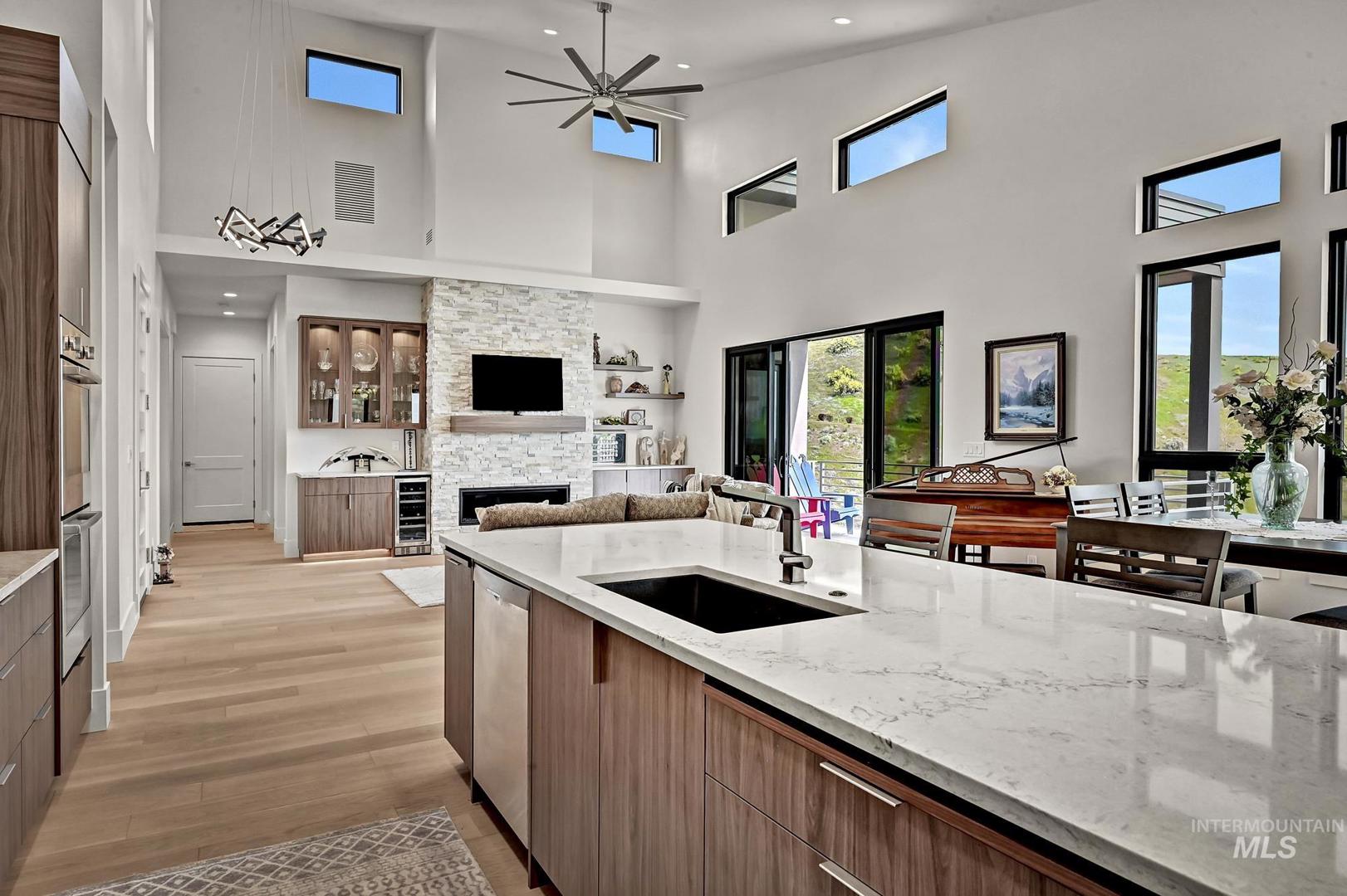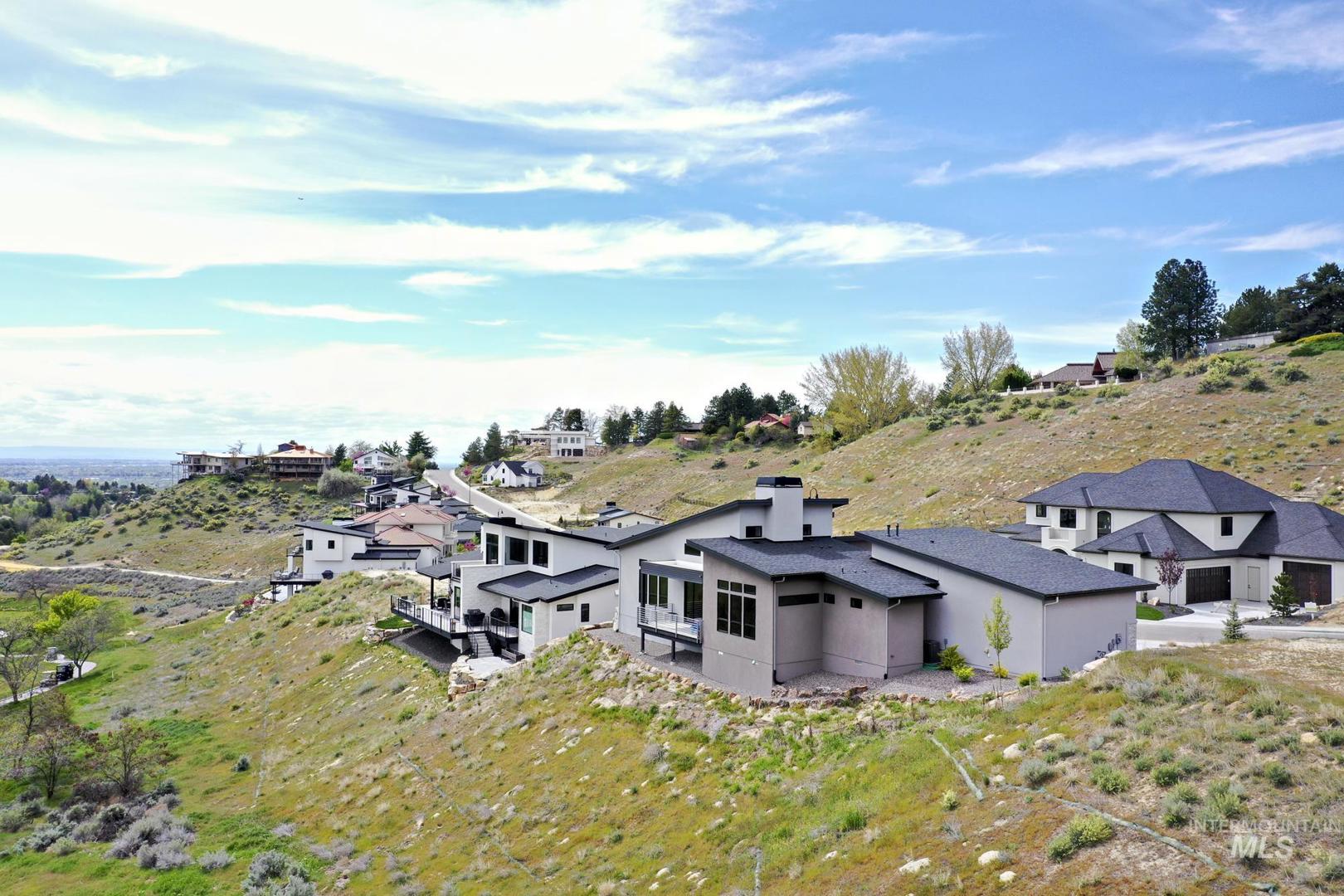 Views for miles! Gaze out at the Owyhee Mountains, the foothills, and a striking skyline from this gorgeous single-level home perched above Crane Creek Golf Course (private membership) where this location offers a rare chance to be moments from downtown, and steps from the foothills trail system. This almost-new Conner Construction build delivers flexibility for executives, downsizers, or as a lock-and-leave second home. A spacious center island anchors the open layout, with vaulted ceilings stretching across the living areas. Savor double ovens, a gas cooktop, custom cabinets, and a versatile pantry roomy enough for storage, prep, and hiding appliances. A cozy office and two secondary bedrooms provide options for guests or flexible use, while the primary suite brings spa vibes with a curbless shower and a California Closet system, & can be customized. You’ll love the separate laundry room, extra-wide 3`x8` interior doors, and 3-car garage—all in a modern package. A gas backup generator offers peace of mind.