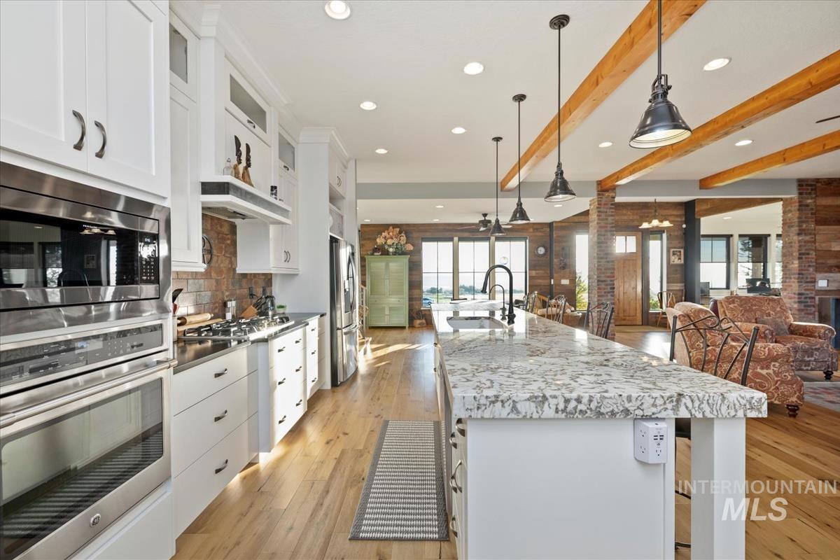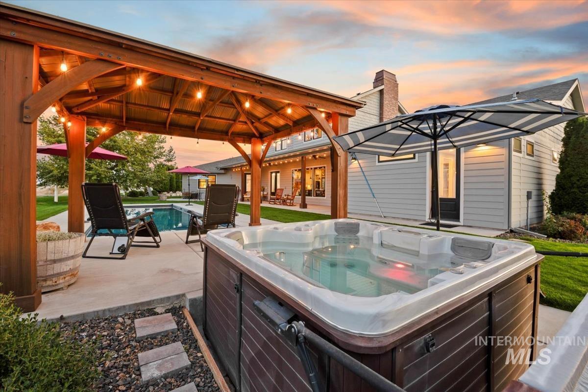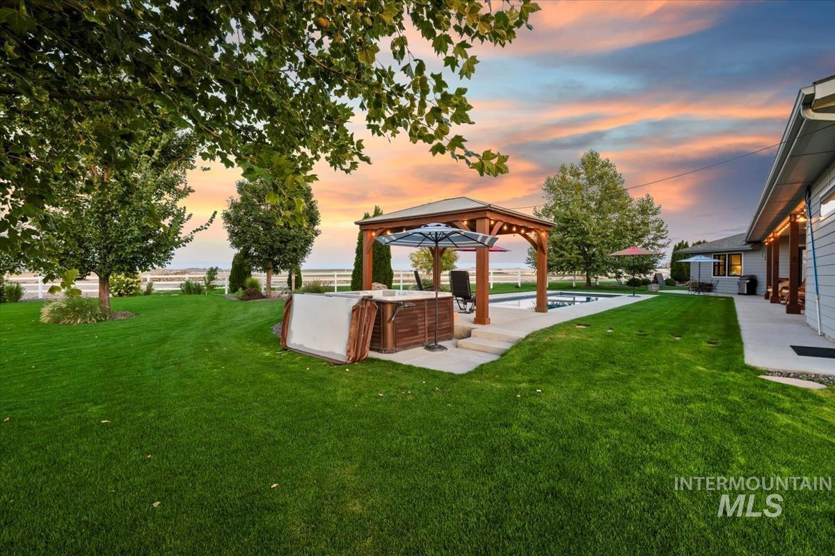 Resort like living on this sprawling 1.37 acre Caldwell estate! Immerse yourself in expansive views of the Snake River valley with some of the best sunsets around. This custom home features a wonderful open concept floorplan with tons of natural light and a beautiful blend of rustic and modern finishes. Entertain family and friends in your gourmet kitchen with an enormous island, gas (propane) cooking, granite, butcher block & soapstone counters and coffee/drink & snack bar. Retreat to your main floor primary suite with a fully tiled shower, luxurious soaking tub, radiant floor heat and valley views. Main floor guest bedroom includes a built in Murphy bed and its own outdoor access. Upstairs features a living area, built in Murphy bed, 4 built in bunk beds and private bath making this the perfect space for guests. Stunning outdoor living with fully covered patio, easy to maintain in-ground pool, hot tub, impeccably maintained mature tress and landscaping make you feel like you`re living on a resort every day. Attached 3 car garage and RV Parking. 2 tankless water heaters, humidifier, attic fan, closed crawlspace with a fan and so much more. Pool & hot tub equipment/chemicals all included. This is a must see to appreciate all this has to offer! **Mortgage savings be available for buyers of this listing.