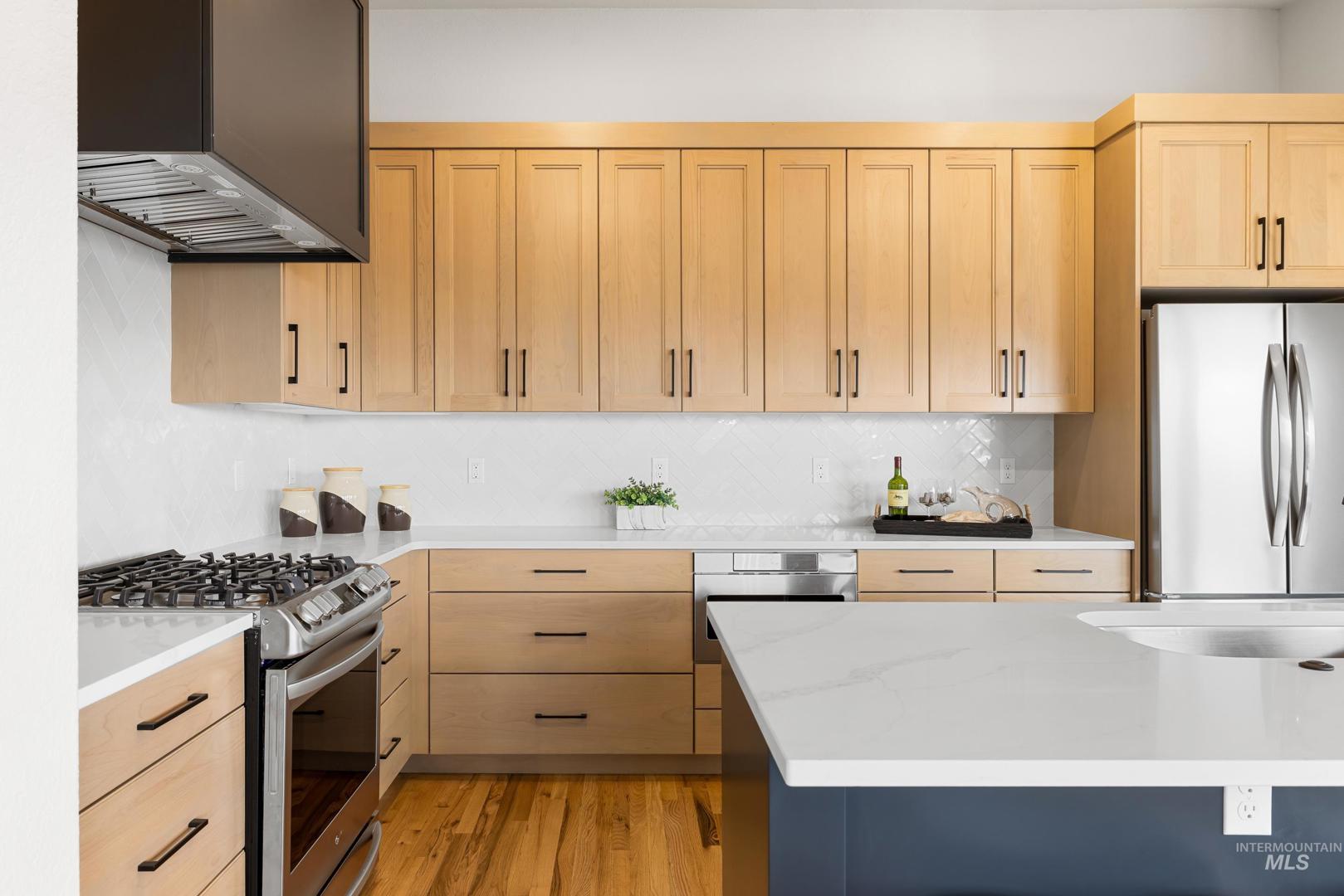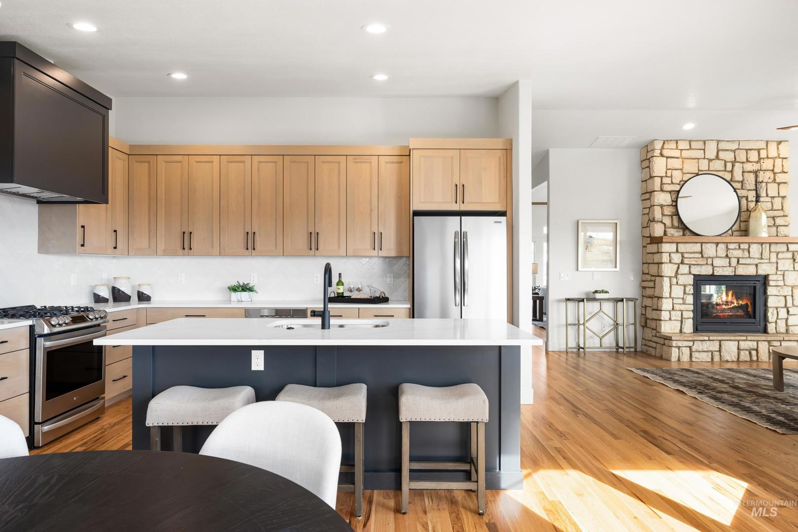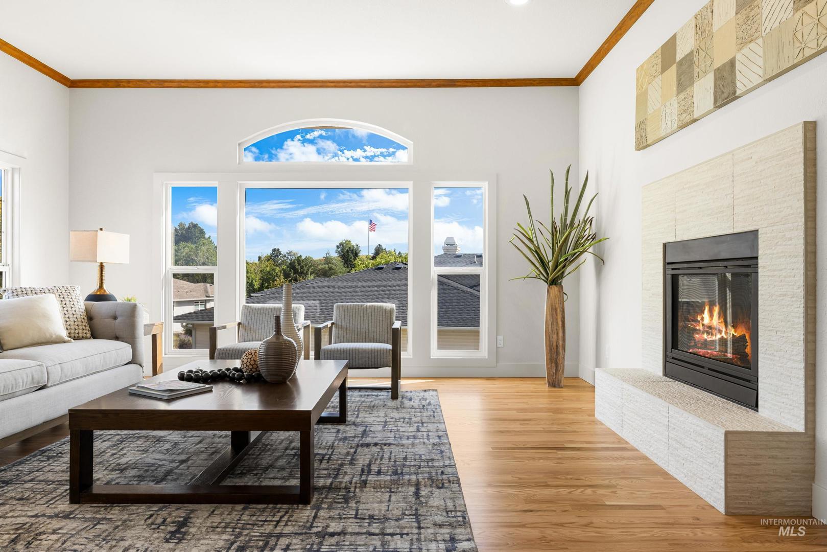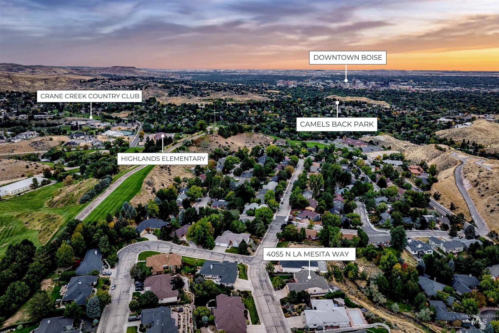 Experience multi-generational living with unobstructed city & foothills views. Tucked into El PeLar, this fully renovated home blends modern updates with North Boise charm. The main level offers formal and casual gathering spaces with vaulted ceilings, separated by a striking floor-to-ceiling stone fireplace. The reimagined kitchen features new cabinetry, quartz countertops, premium appliances, and a dining area with stunning Boise views. Hardwood floors & clean designer finishes flow throughout, creating a fresh, inviting atmosphere. The expansive primary suite opens to the upper deck and includes a walk-in closet and ensuite with dual vanities, a walk-in shower, and a soaker tub. Two additional bedrooms, a full bath, a home office, and a generous laundry with 3-car garage access complete the main level, thoughtfully designed to adapt to every stage of life. The daylight basement is bright and flexible, offering 2 oversized bedrooms, a full bath, a kitchenette, and a versatile living area ideal for guests, a rec room, or multi-generational living. Outdoor living shines with an upper deck showcasing foothill and city views and a covered patio below with space for an outdoor kitchen or hot tub. Minutes from trailheads, Crane Creek Country Club, Hyde Park, Downtown Boise, and top-rated schools, this home fosters a lifestyle centered on recreation, connection, and retreat.