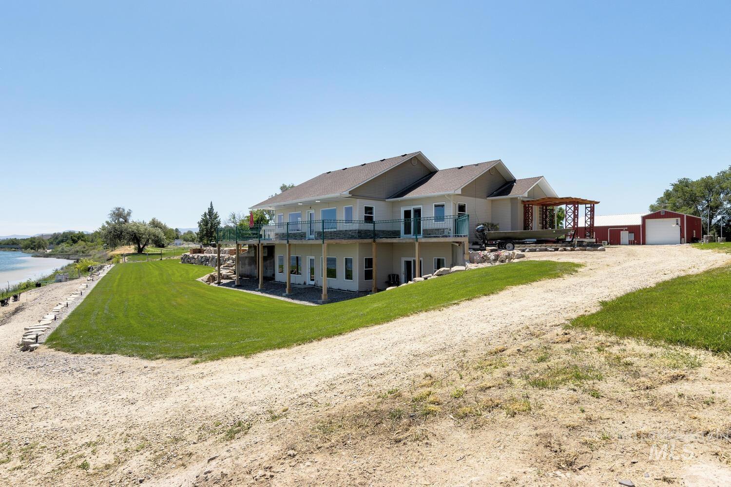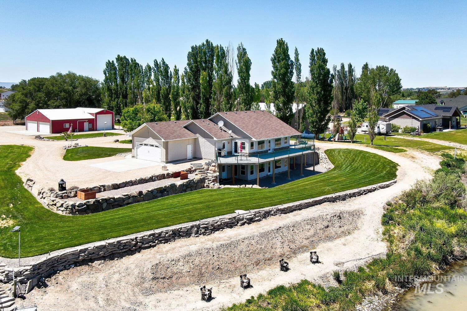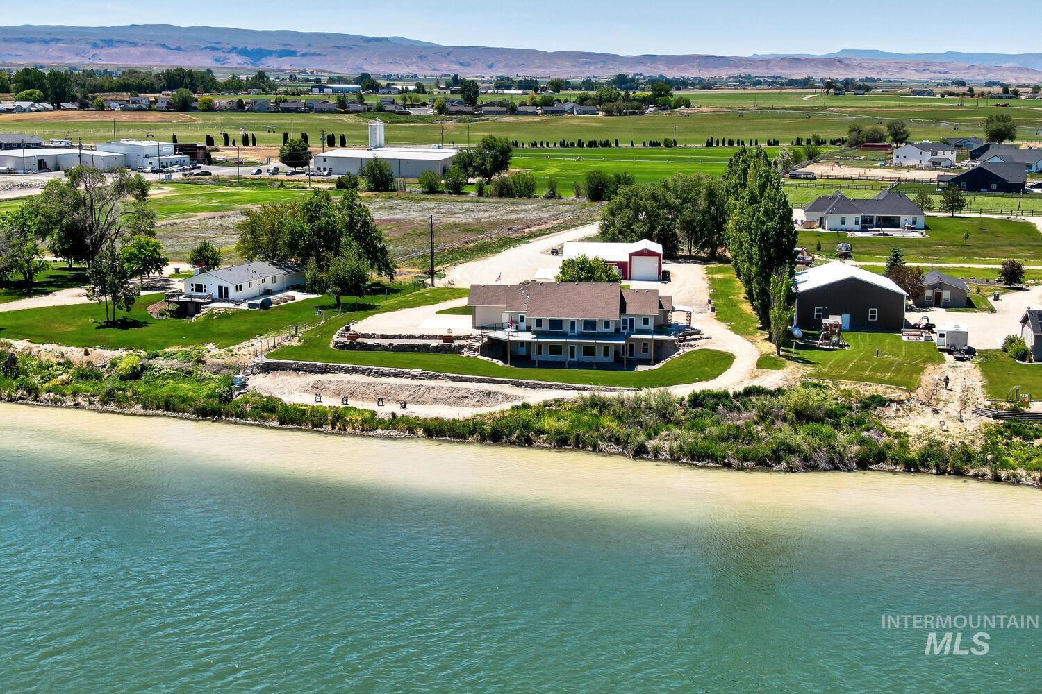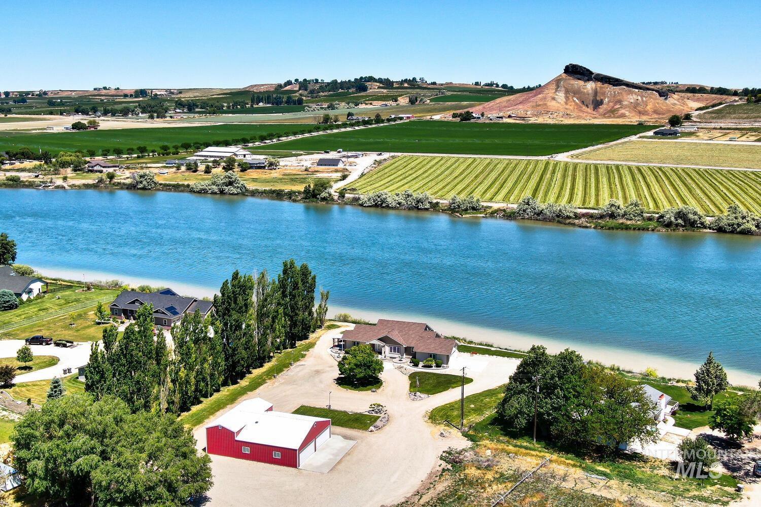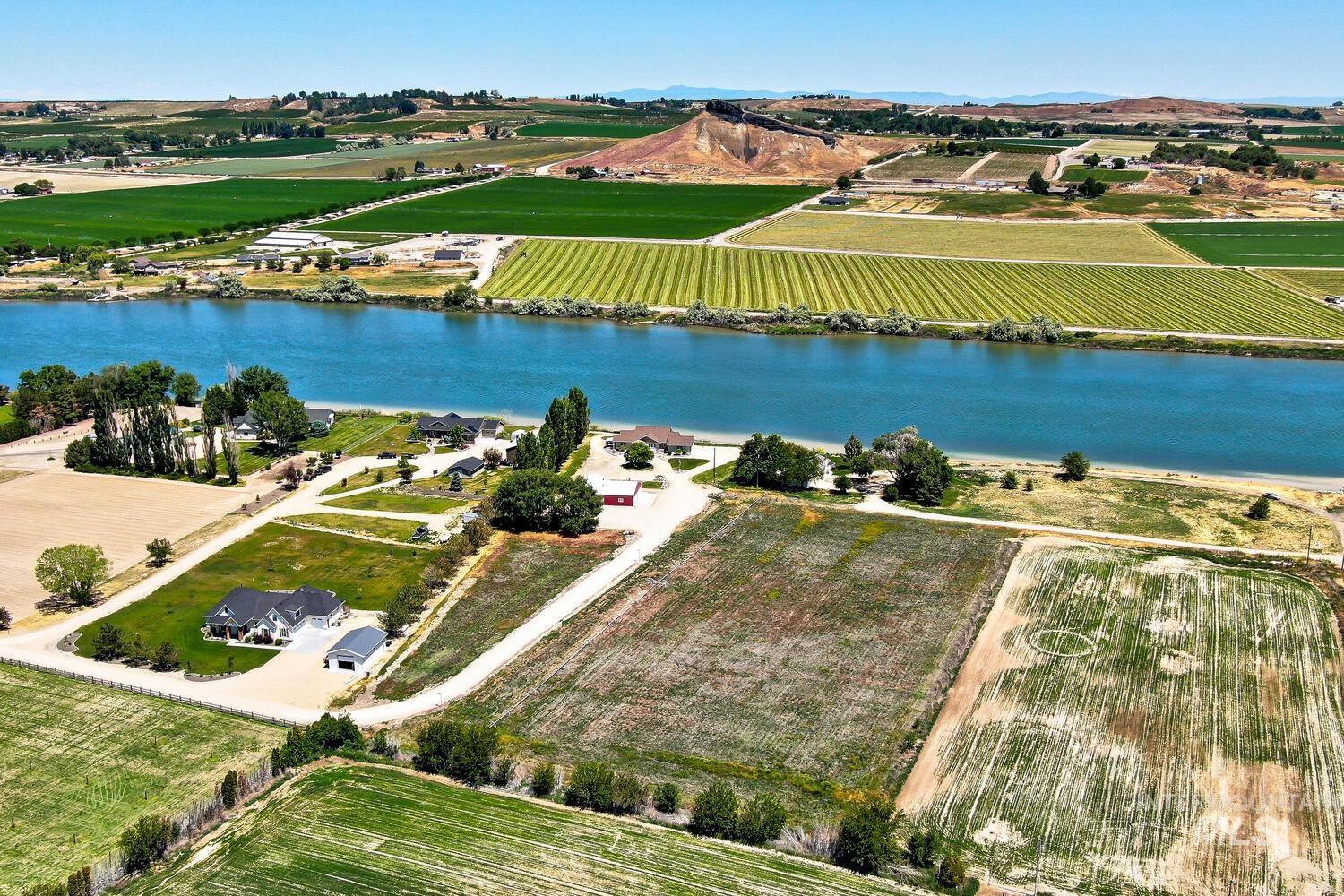 This stunning riverfront property is privately located on 5.95 acres in Marsing with 213 feet of riverfront access and direct views of Lizard Butte. Fully irrigated and meticulously maintained this property offers a large beautiful custom home built in 2000 that dotes a 1200 sqft deck and covered patio out the walk-out basement. Brazilian wood floors throughout the open living room, master and second bedroom conveniently located on the main floor. The bottom story has 2 bedrooms/bathrooms, a large living room, additional laundry and is plumbed to support a full separate kitchen - easily two separate living spaces if desired. The roughly 2500 sqft shop is heated & cooled, insulated including spray foam and drywalled. It has a full bathroom, office, laundry hook-ups and massive RV bay with clean-out, water and 220 power. No HOA or CCR`s bring animals and park your toys. Dock can be installed as well as boat launch. Lot can be split with one building permit for second home. 72 Hour Bump clause in place.