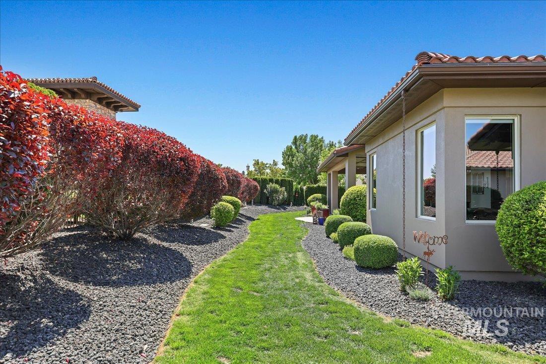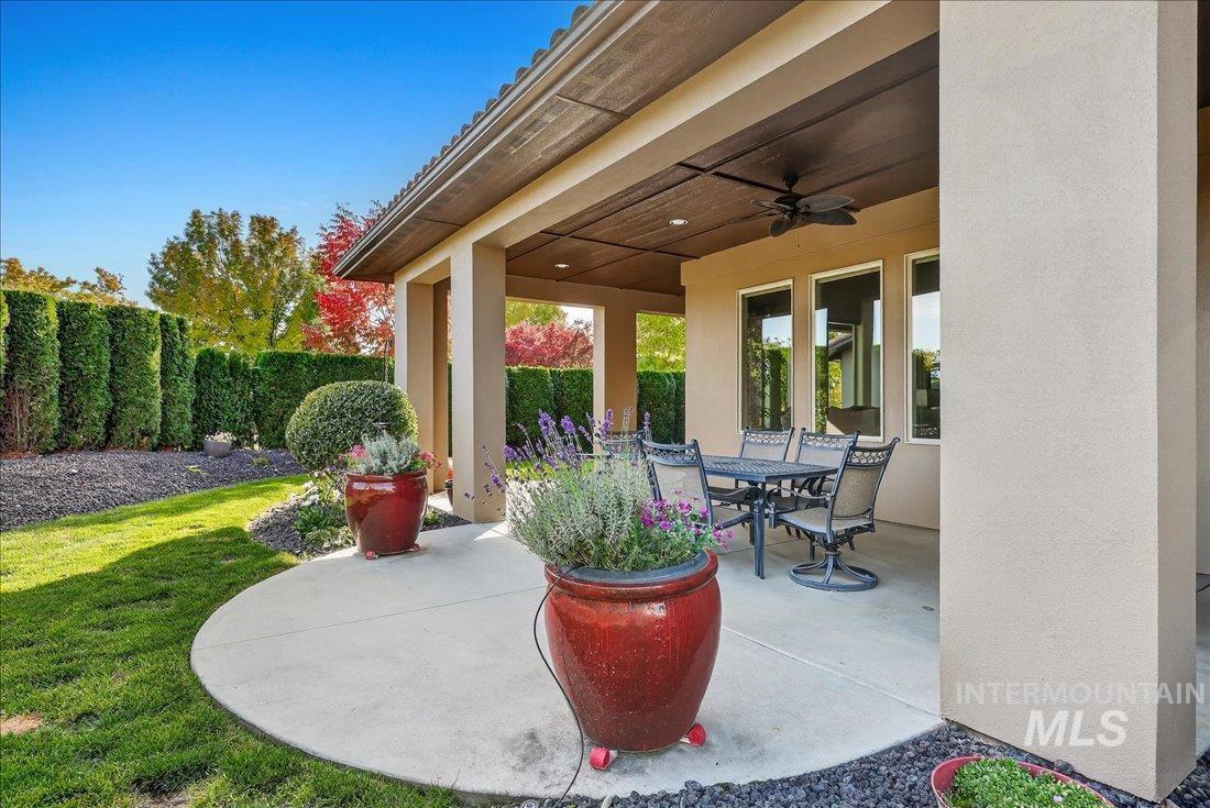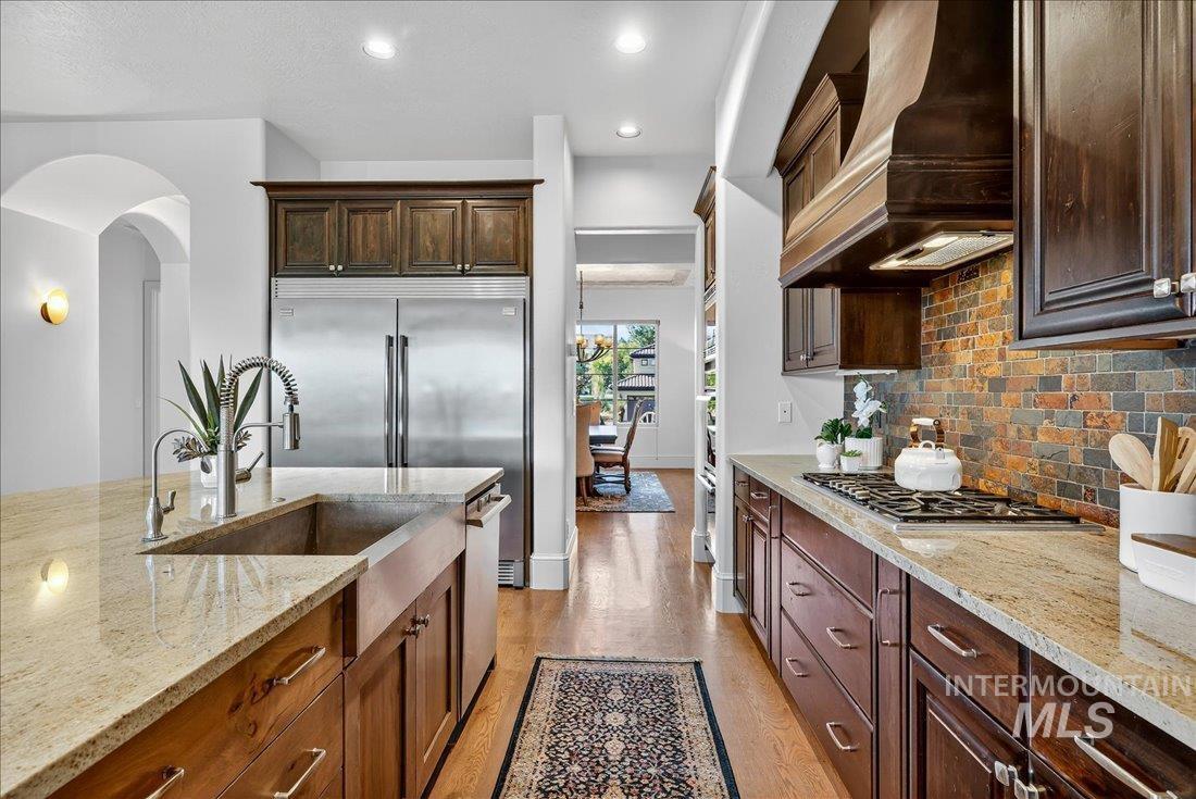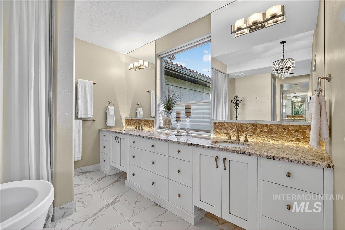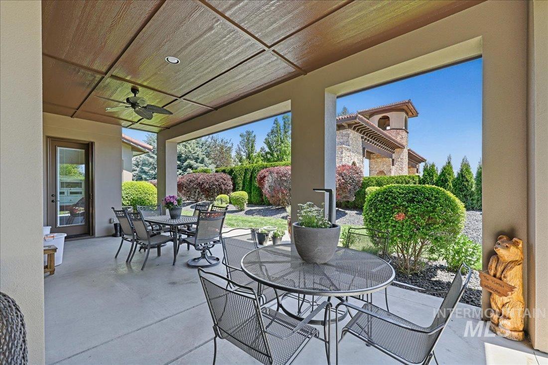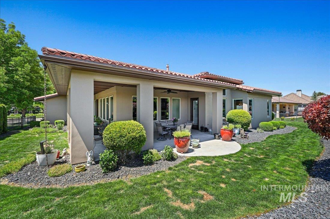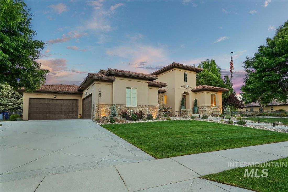 Wake up to breathtaking, east facing views of Bogus Basin in this stunning home located in Eagle’s prestigious Corrente Bello community. Designed with timeless craftsmanship and modern sophistication, this light filled residence seamlessly blends elegance and comfort. At the heart of the home is a gourmet kitchen outfitted with Thermador appliances, a massive 65" built in refrigerator/freezer, double pantries, and an oversized island perfect for entertaining. The open concept layout flows effortlessly into the living and dining areas, bathed in natural light and ideal for both intimate gatherings and larger get togethers. The main level primary suite is a private haven, featuring a spa inspired bath with a soaker tub, walk through dual head shower, and a spacious walk in closet with convenient access to the utility room. Two additional bedrooms share a Jack-and-Jill bathroom, while an upstairs bonus room with a half bath offers ultimate flexibility. Thoughtful upgrades throughout include central vacuum, water softener, reverse osmosis system, new exterior paint, epoxy coated garage floors, and an expansive 4 car garage and built in storage. Step outside to a wrap around patio, private hot tub, and beautifully landscaped low maintenance yard. Corner lot with no rear neighbors! Community amenities include a pool, cabana, tot lot, bocce court & walking paths!