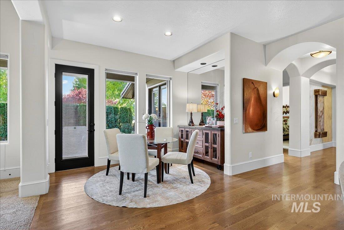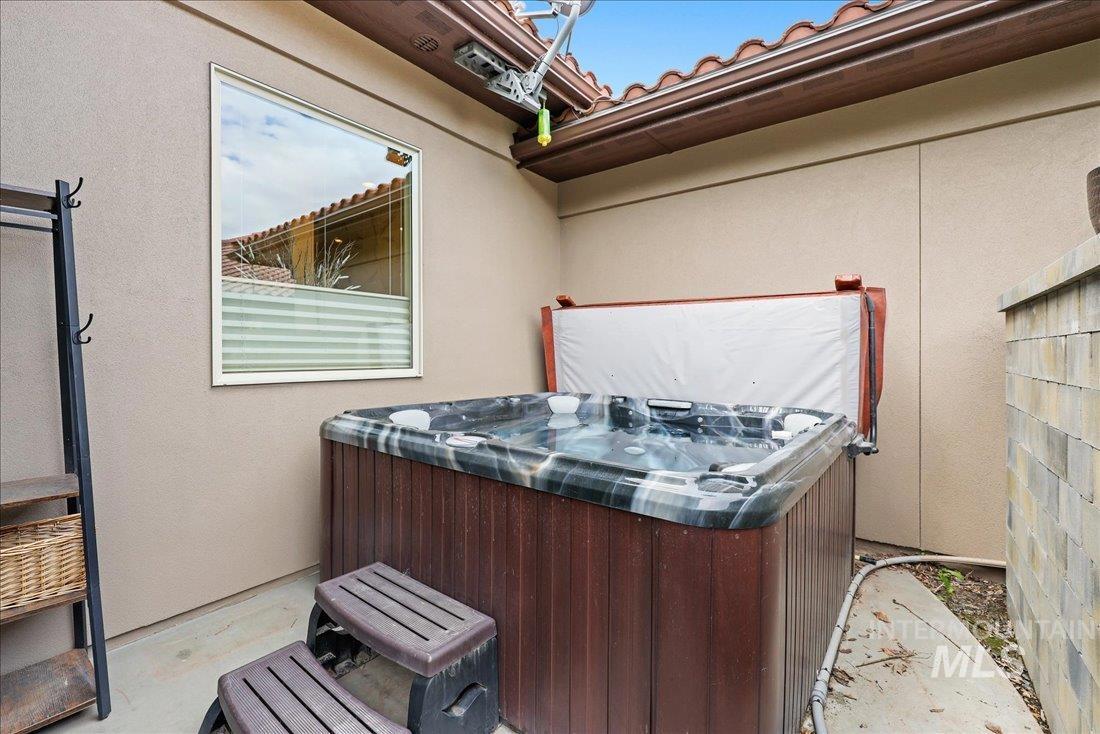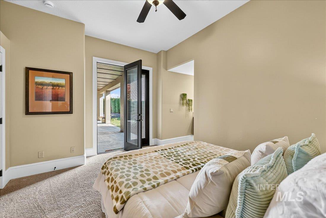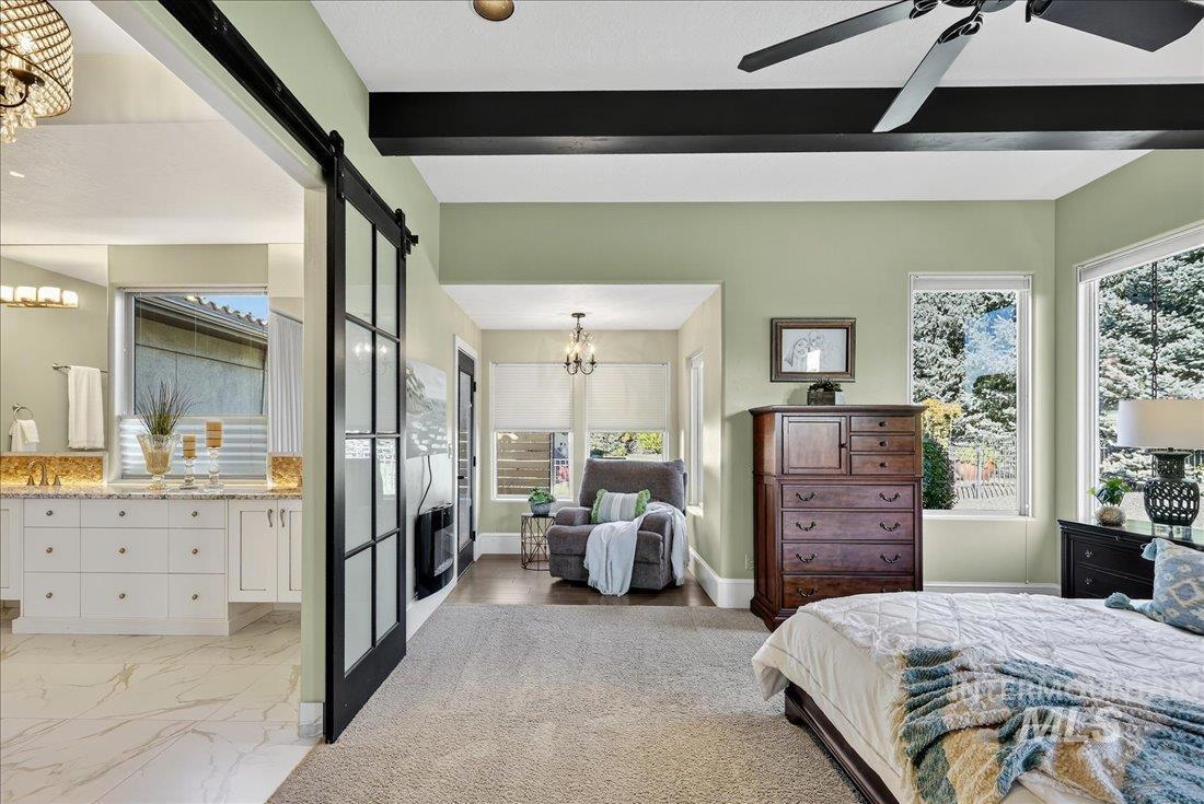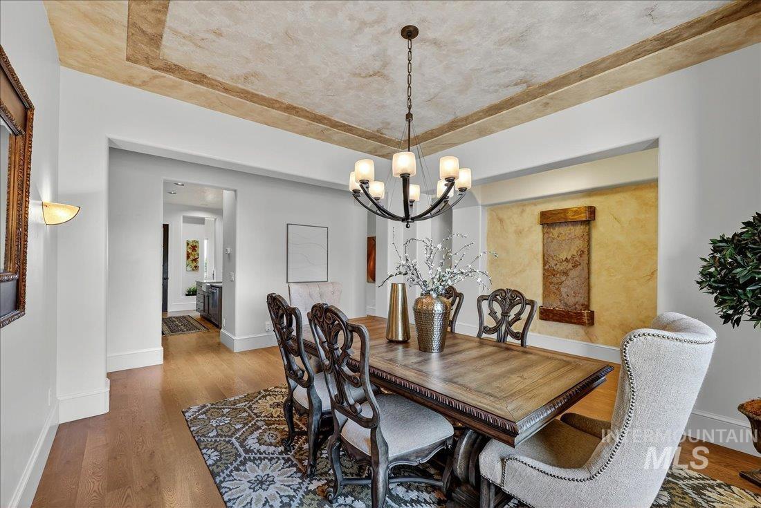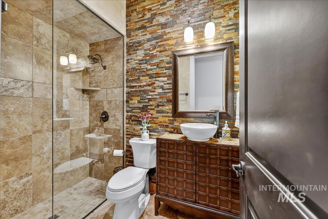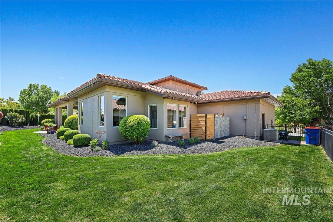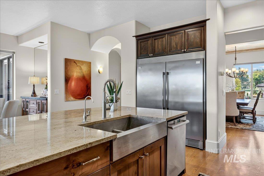 Wake up to breathtaking, east facing views of Bogus Basin in this stunning home located in Eagle’s prestigious Corrente Bello community. Designed with timeless craftsmanship and modern sophistication, this light filled residence seamlessly blends elegance and comfort. At the heart of the home is a gourmet kitchen outfitted with Thermador appliances, a massive 65" built in refrigerator/freezer, double pantries, and an oversized island perfect for entertaining. The open concept layout flows effortlessly into the living and dining areas, bathed in natural light and ideal for both intimate gatherings and larger get togethers. The main level primary suite is a private haven, featuring a spa inspired bath with a soaker tub, walk through dual head shower, and a spacious walk in closet with convenient access to the utility room. Two additional bedrooms share a Jack-and-Jill bathroom, while an upstairs bonus room with a half bath offers ultimate flexibility. Thoughtful upgrades throughout include central vacuum, water softener, reverse osmosis system, new exterior paint, epoxy coated garage floors, and an expansive 4 car garage and built in storage. Step outside to a wrap around patio, private hot tub, and beautifully landscaped low maintenance yard. Corner lot with no rear neighbors! Community amenities include a pool, cabana, tot lot, bocce court & walking paths!