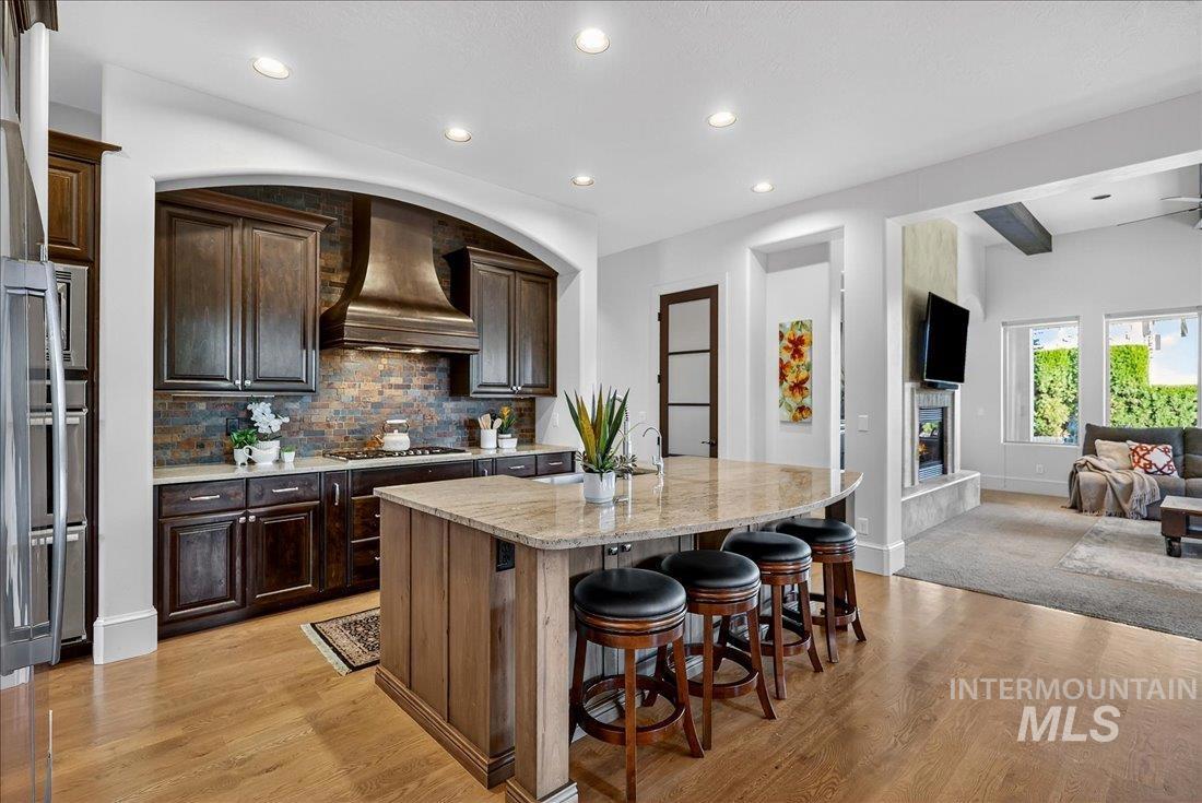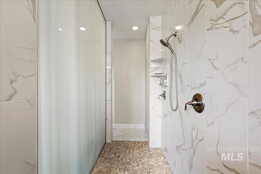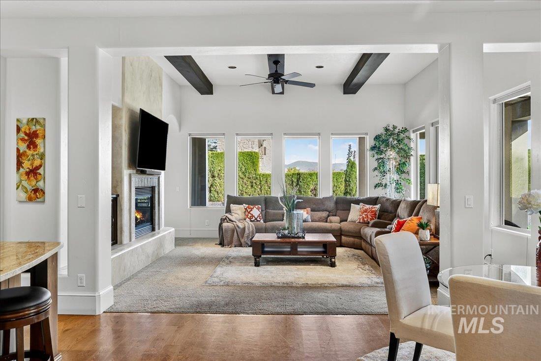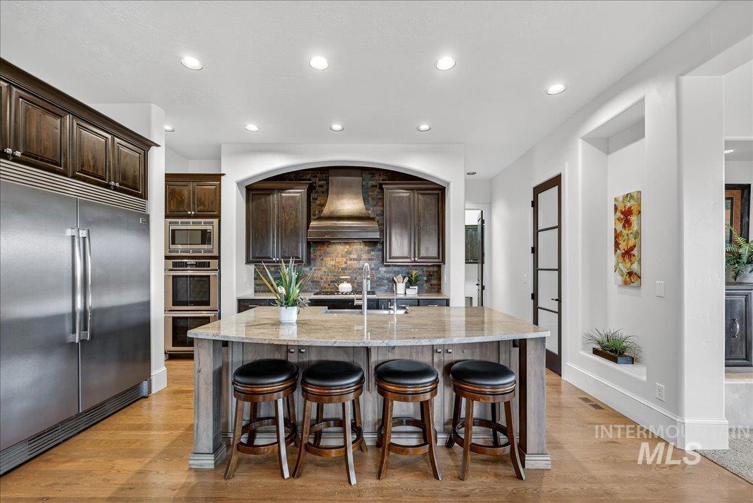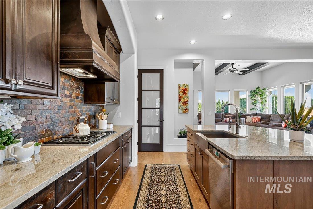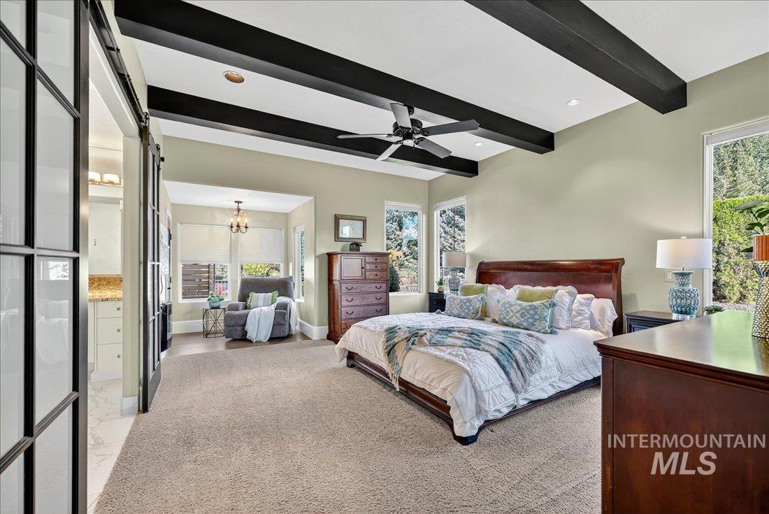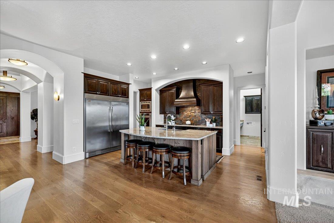 Wake up to breathtaking, east facing views of Bogus Basin in this stunning home located in Eagle’s prestigious Corrente Bello community. Designed with timeless craftsmanship and modern sophistication, this light filled residence seamlessly blends elegance and comfort. At the heart of the home is a gourmet kitchen outfitted with Thermador appliances, a massive 65" built in refrigerator/freezer, double pantries, and an oversized island perfect for entertaining. The open concept layout flows effortlessly into the living and dining areas, bathed in natural light and ideal for both intimate gatherings and larger get togethers. The main level primary suite is a private haven, featuring a spa inspired bath with a soaker tub, walk through dual head shower, and a spacious walk in closet with convenient access to the utility room. Two additional bedrooms share a Jack-and-Jill bathroom, while an upstairs bonus room with a half bath offers ultimate flexibility. Thoughtful upgrades throughout include central vacuum, water softener, reverse osmosis system, new exterior paint, epoxy coated garage floors, and an expansive 4 car garage and built in storage. Step outside to a wrap around patio, private hot tub, and beautifully landscaped low maintenance yard. Corner lot with no rear neighbors! Community amenities include a pool, cabana, tot lot, bocce court & walking paths!