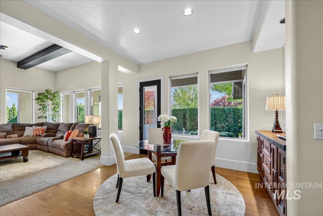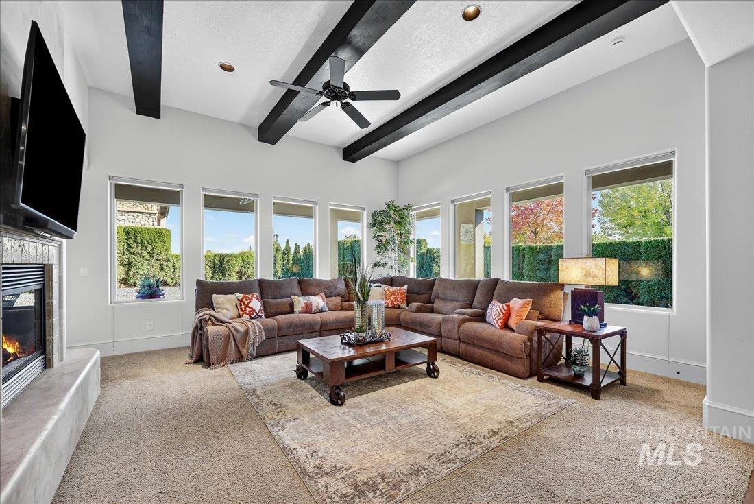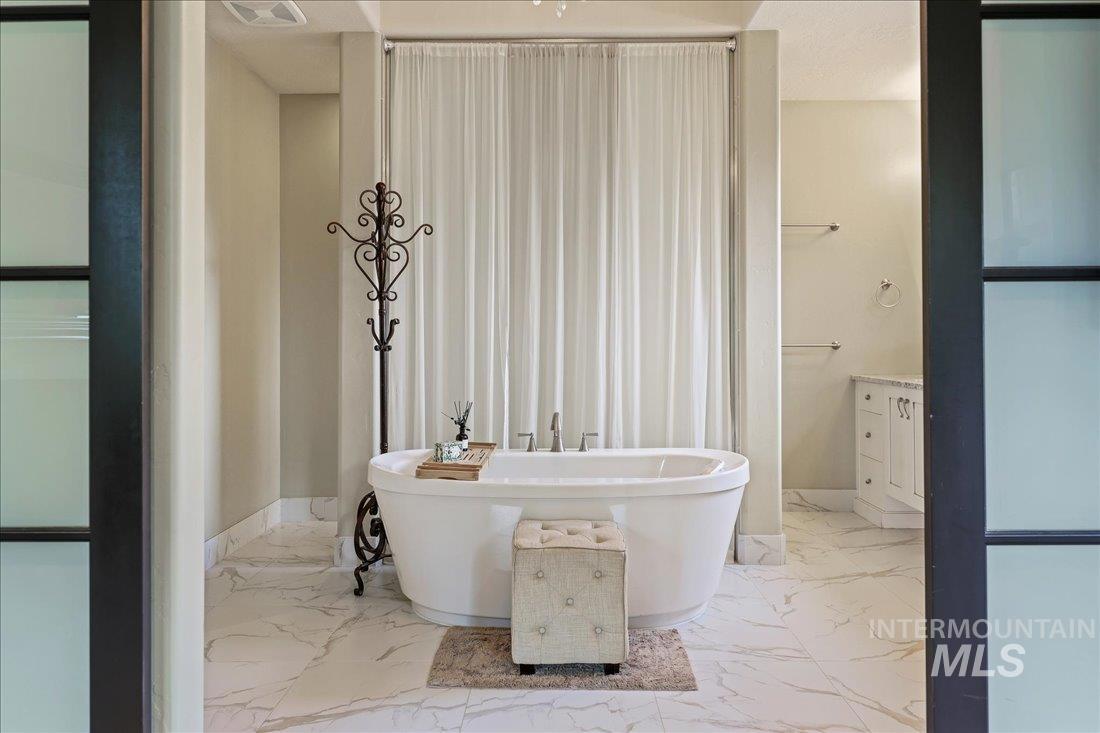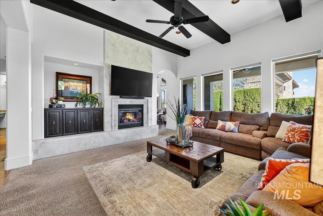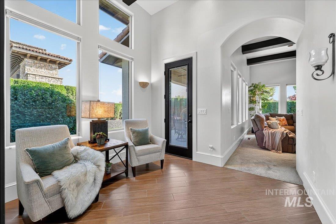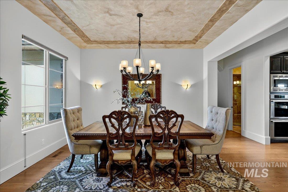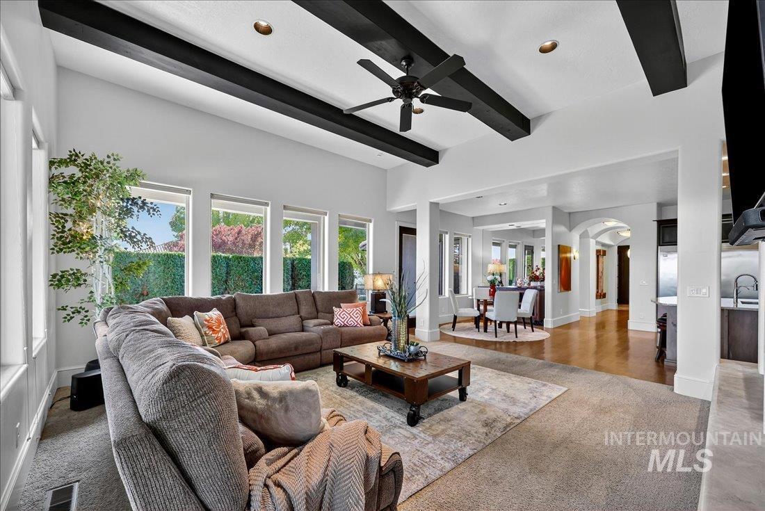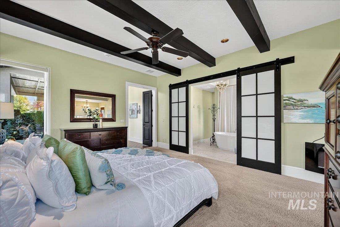 Wake up to breathtaking, east facing views of Bogus Basin in this stunning home located in Eagle’s prestigious Corrente Bello community. Designed with timeless craftsmanship and modern sophistication, this light filled residence seamlessly blends elegance and comfort. At the heart of the home is a gourmet kitchen outfitted with Thermador appliances, a massive 65" built in refrigerator/freezer, double pantries, and an oversized island perfect for entertaining. The open concept layout flows effortlessly into the living and dining areas, bathed in natural light and ideal for both intimate gatherings and larger get togethers. The main level primary suite is a private haven, featuring a spa inspired bath with a soaker tub, walk through dual head shower, and a spacious walk in closet with convenient access to the utility room. Two additional bedrooms share a Jack-and-Jill bathroom, while an upstairs bonus room with a half bath offers ultimate flexibility. Thoughtful upgrades throughout include central vacuum, water softener, reverse osmosis system, new exterior paint, epoxy coated garage floors, and an expansive 4 car garage and built in storage. Step outside to a wrap around patio, private hot tub, and beautifully landscaped low maintenance yard. Corner lot with no rear neighbors! Community amenities include a pool, cabana, tot lot, bocce court & walking paths!