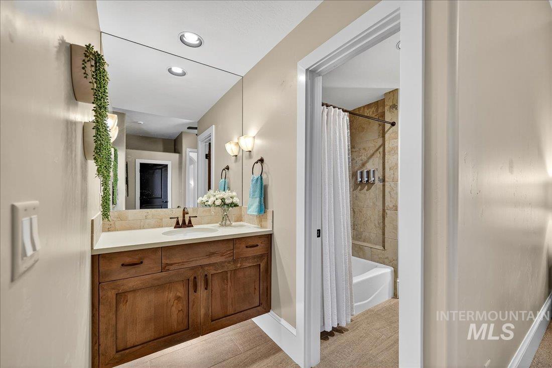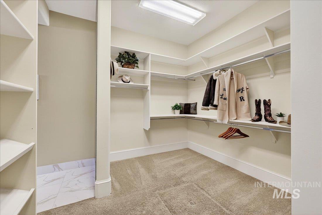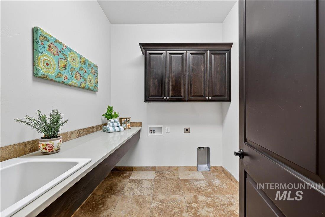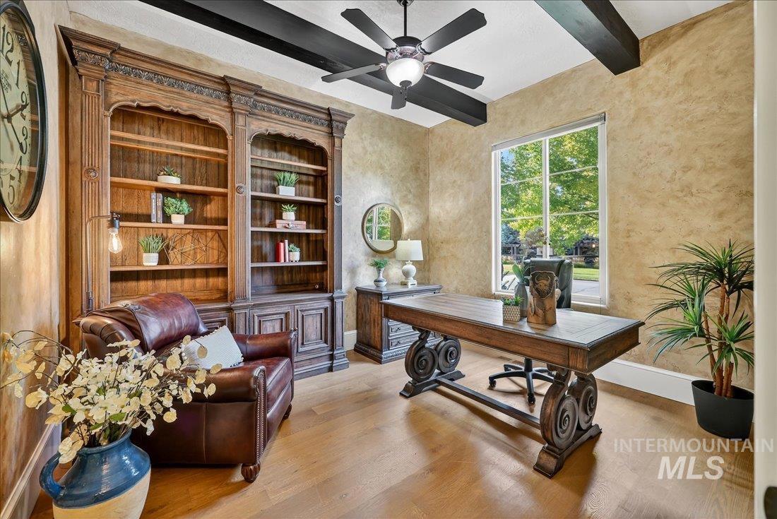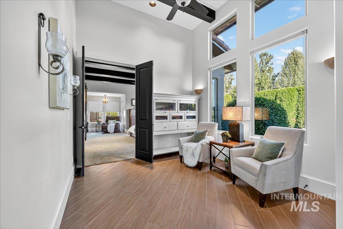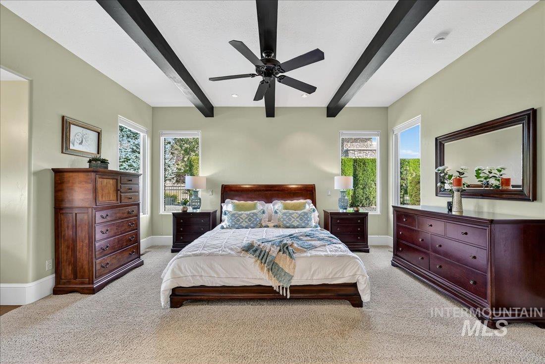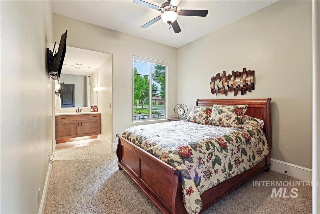 Wake up to breathtaking, east facing views of Bogus Basin in this stunning home located in Eagle’s prestigious Corrente Bello community. Designed with timeless craftsmanship and modern sophistication, this light filled residence seamlessly blends elegance and comfort. At the heart of the home is a gourmet kitchen outfitted with Thermador appliances, a massive 65" built in refrigerator/freezer, double pantries, and an oversized island perfect for entertaining. The open concept layout flows effortlessly into the living and dining areas, bathed in natural light and ideal for both intimate gatherings and larger get togethers. The main level primary suite is a private haven, featuring a spa inspired bath with a soaker tub, walk through dual head shower, and a spacious walk in closet with convenient access to the utility room. Two additional bedrooms share a Jack-and-Jill bathroom, while an upstairs bonus room with a half bath offers ultimate flexibility. Thoughtful upgrades throughout include central vacuum, water softener, reverse osmosis system, new exterior paint, epoxy coated garage floors, and an expansive 4 car garage and built in storage. Step outside to a wrap around patio, private hot tub, and beautifully landscaped low maintenance yard. Corner lot with no rear neighbors! Community amenities include a pool, cabana, tot lot, bocce court & walking paths!