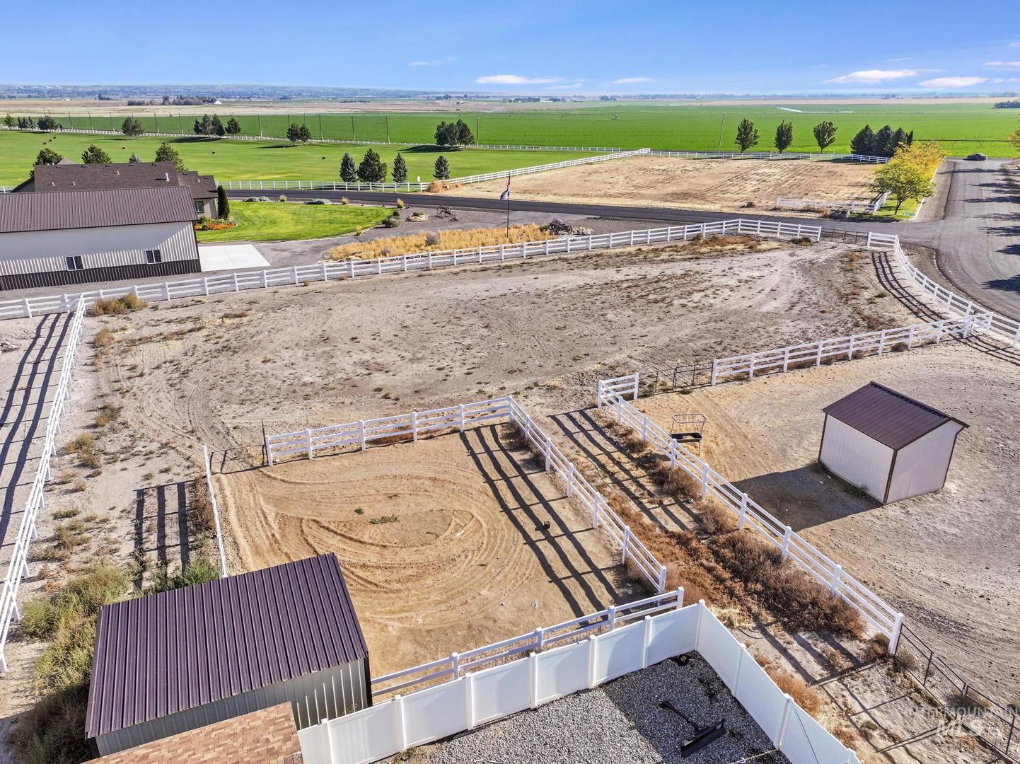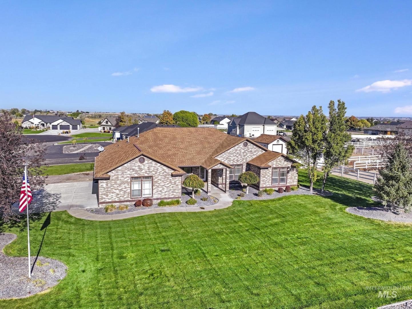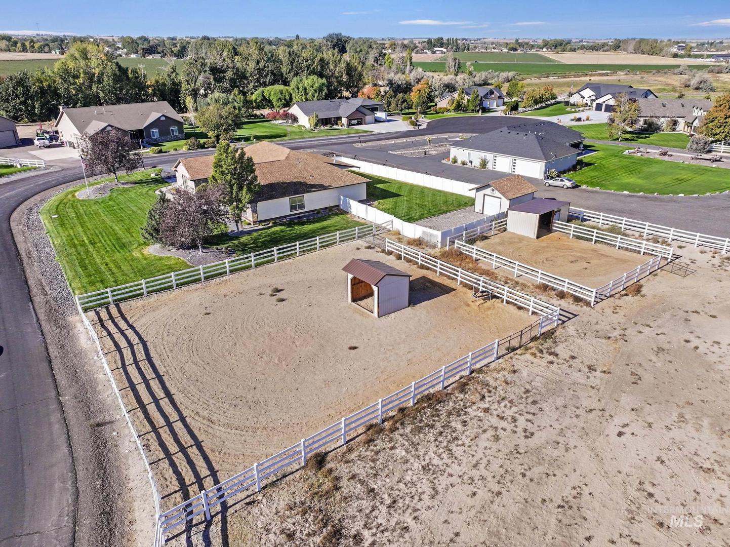 Perfectly set up for country living, this property is truly animal-friendly and ready for your horses or 4H projects-plus its located minutes from the golf course. Multiple fenced corral areas, loafing sheds, and a tack room create an ideal setup for livestock or hobby animals, while a workshop with a garage door & concrete floor adds valuable storage and workspace. The home itself is a sprawling single-level ranch with over 2,653 sq. ft. of beautifully designed space. Step inside to a welcoming entry that opens to a cozy family room—perfect for an office or den—with a charming barn door for privacy. The formal dining area flows easily into the spacious living room featuring a gas fireplace and large windows that fill the space with natural light. The kitchen is a showpiece, with granite counters, custom cabinetry, a gas stove, large island, breakfast bar peninsula, pantry, and an eat-in dining area. The split-bedroom layout offers a primary suite with dual vanities and a jetted corner tub, plus this home offers a second primary suite for guests or in-laws. Two additional bedrooms, another full guest bath, and a well-appointed laundry room add comfort and function. Enjoy the private covered patio and fenced backyard—perfect for outdoor entertaining—and the attached 3-car garage that completes this exceptional property.