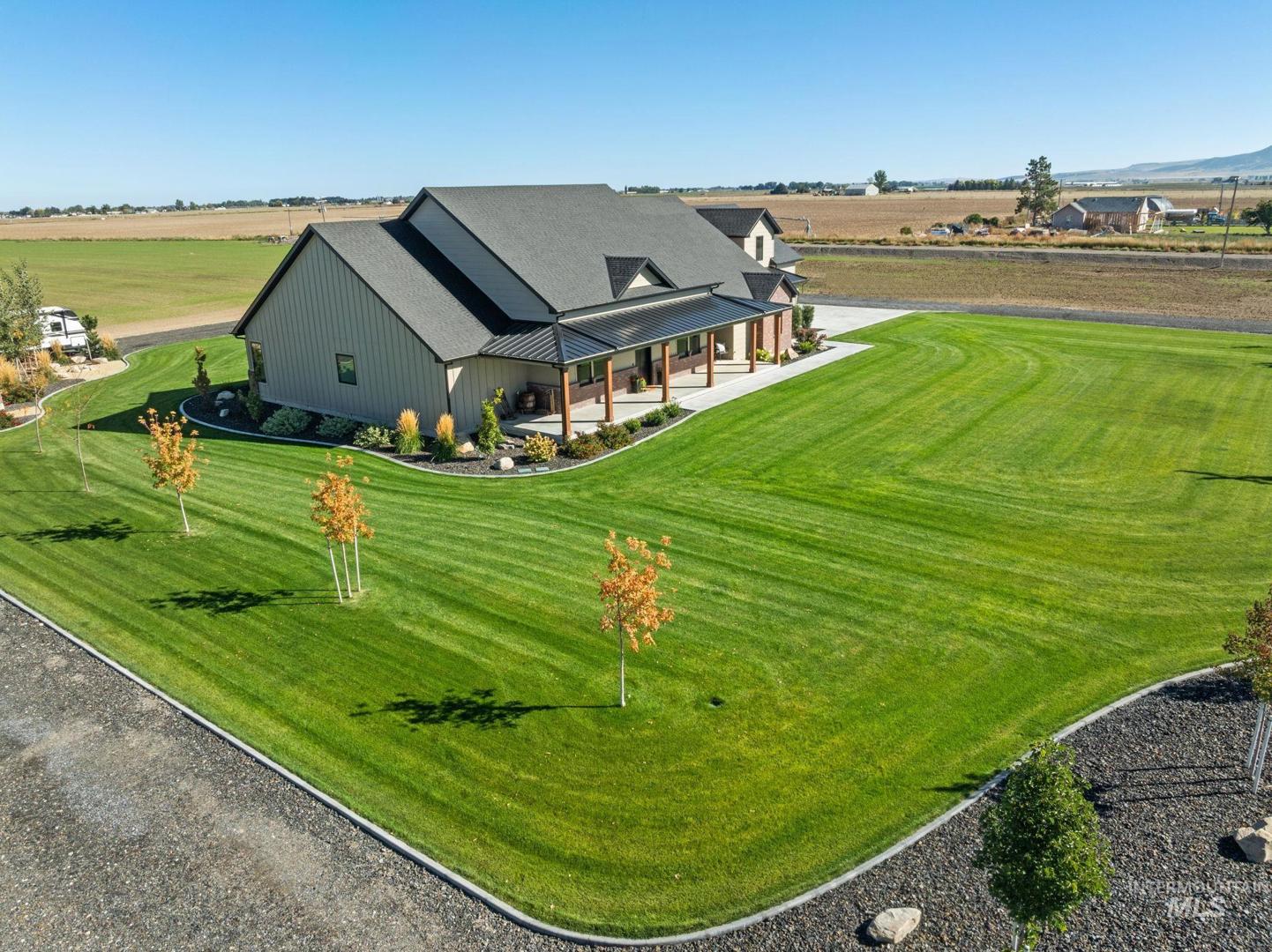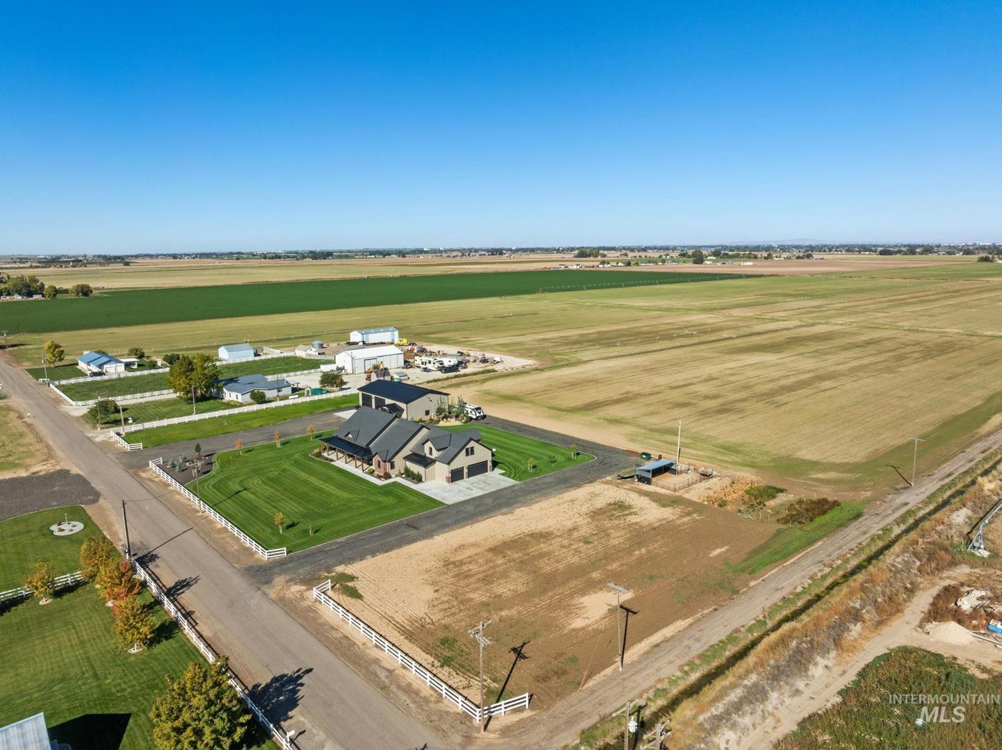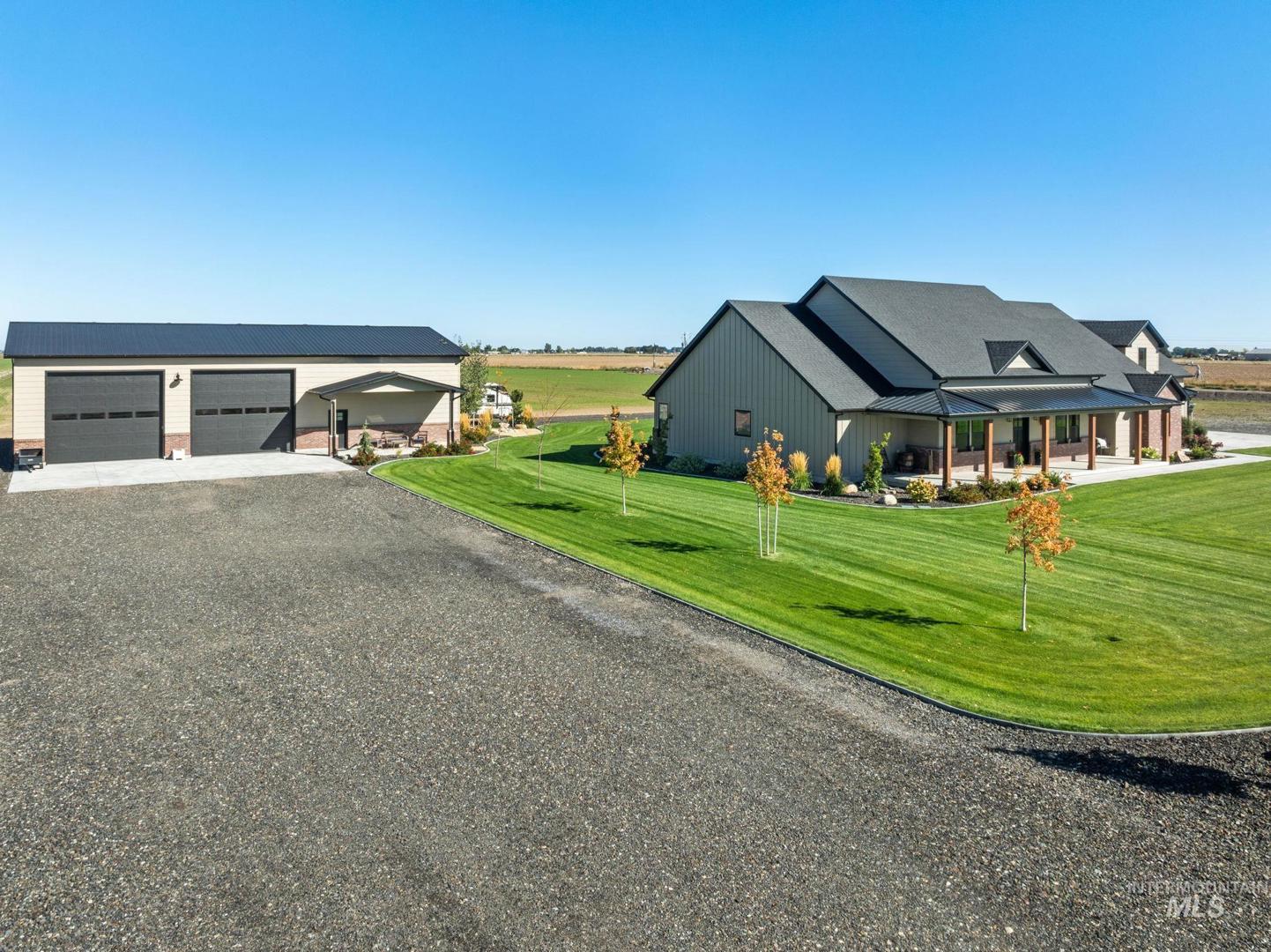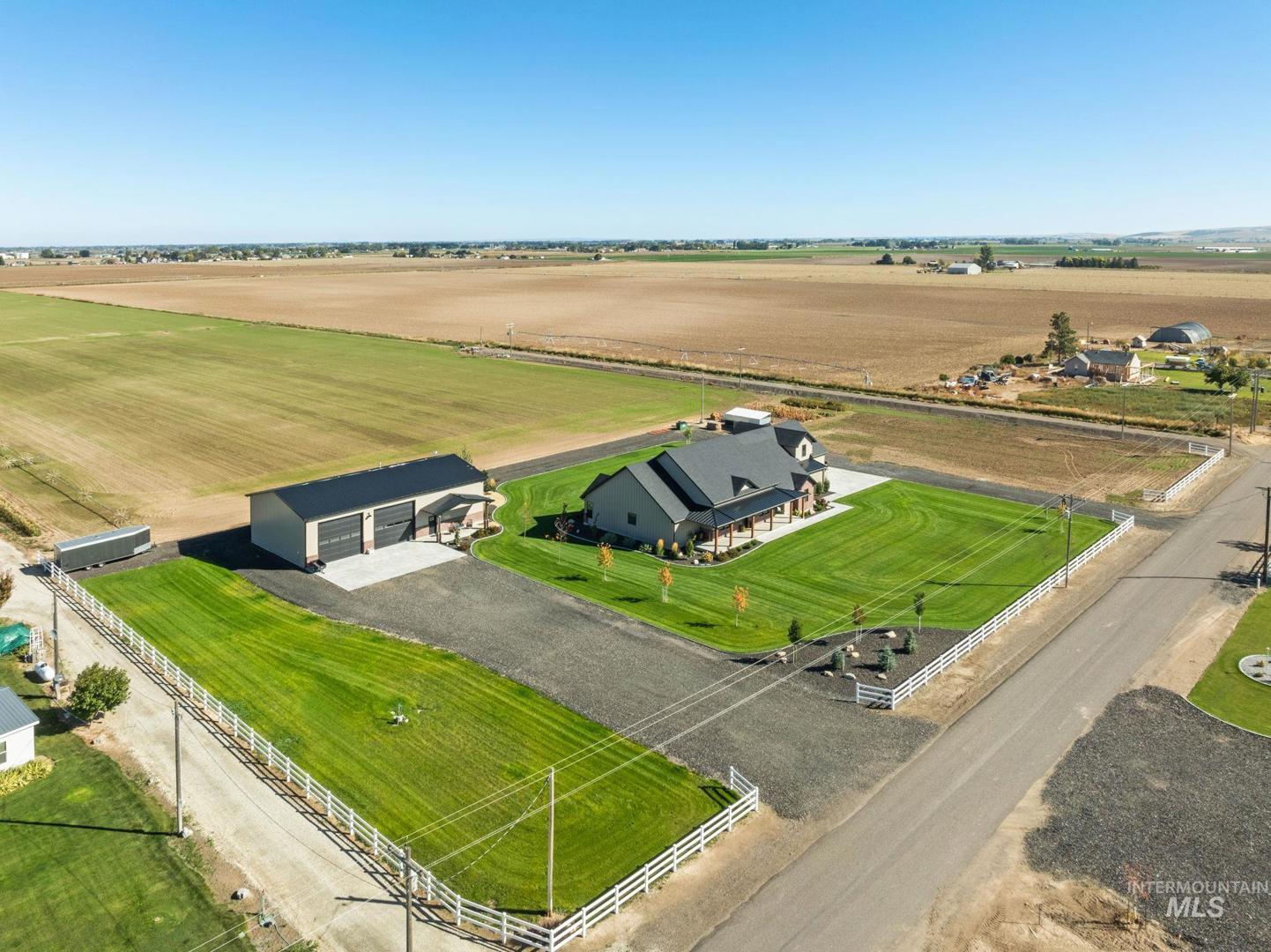 Modern Country Luxury on 3 acres! This custom home blends high-end finishes with open, inviting spaces for effortless family living. The gourmet kitchen features quartzite countertops, a 6-burner propane range with grill, dual ovens, pot filler, spacious butler’s pantry, and all kitchen appliances included. With a formal dining room and open layout, it’s perfect for gatherings and home cooking. The living room showcases 10-ft ceilings, custom built-ins, and a striking floor-to-ceiling stone fireplace that anchors the home. The primary suite with vaulted ceiling offers dual vanities, a tiled walk-in shower, soaker tub, and generous closet with built-in safe room. A versatile craft or office space adds flexibility for work or hobbies. Outdoors, unwind on the covered patio with hot tub, gather by the firepit, or tend the garden surrounded by open country views. The landscaped yard features curbing, vinyl fencing, sprinklers, Burley irrigation shares, and an RV hook-up. The insulated and heated 70`×40` shop provides space for projects, storage, and a man room with A/C, kitchenette, and half bath. Move-in ready—This Home is where modern comfort meets Idaho country living.