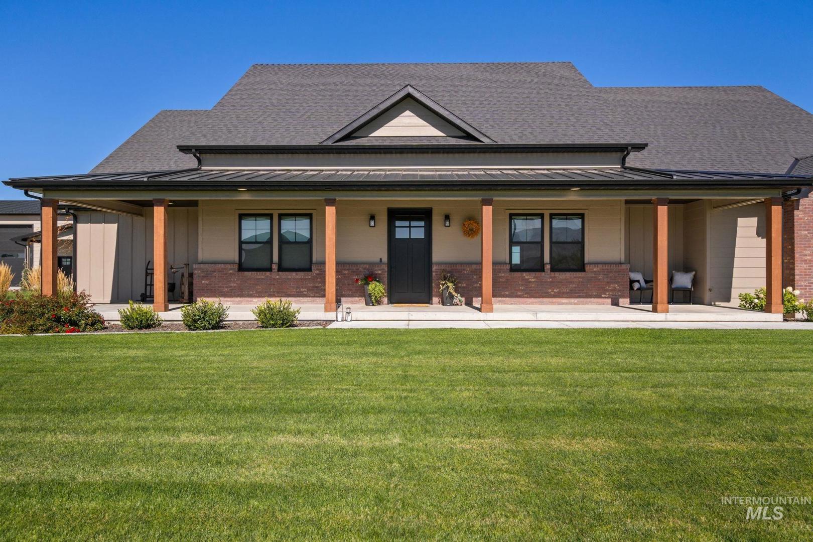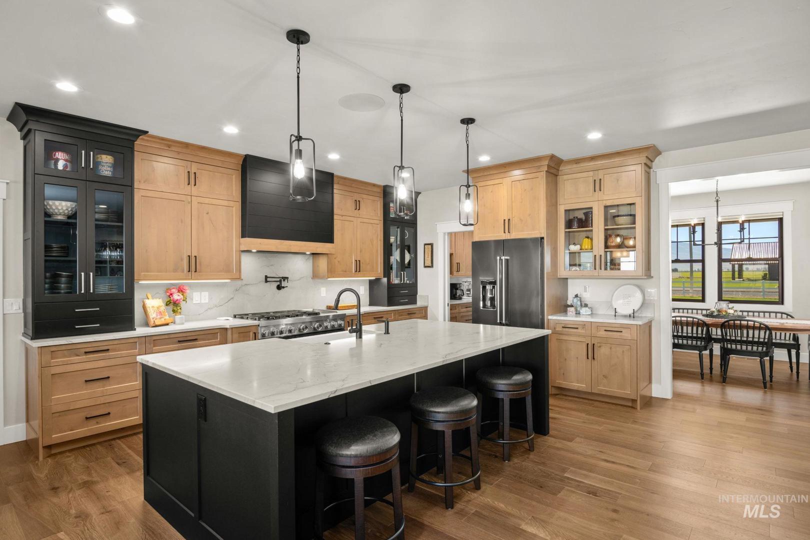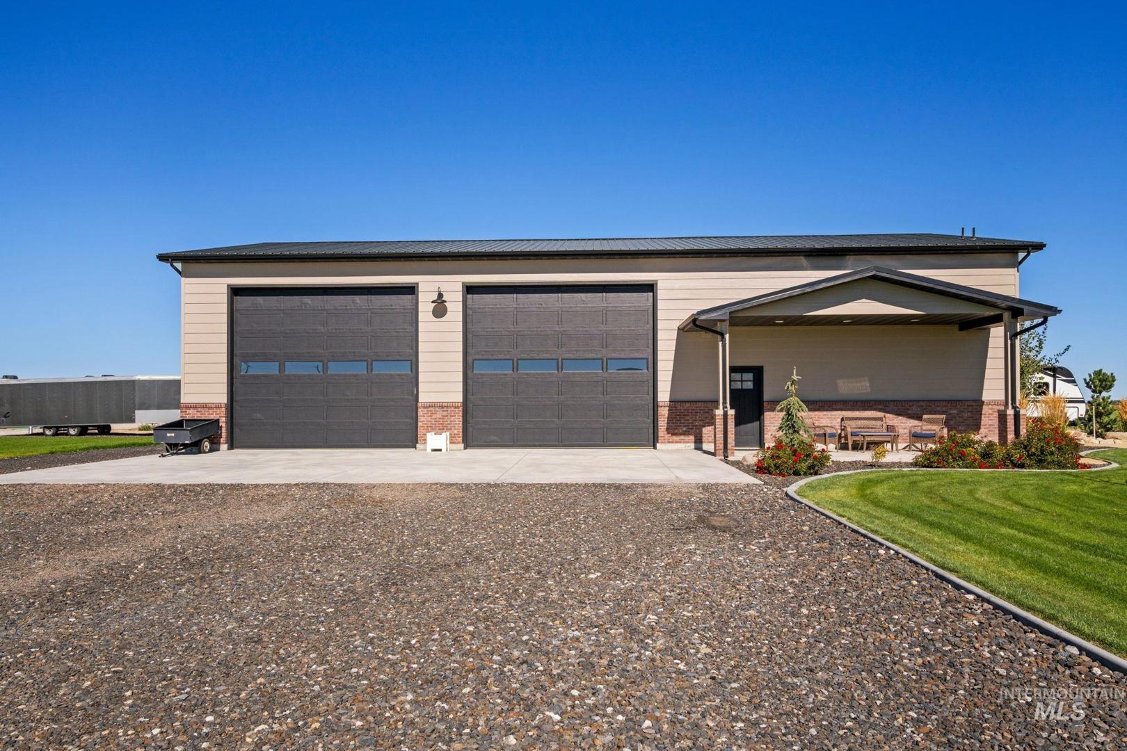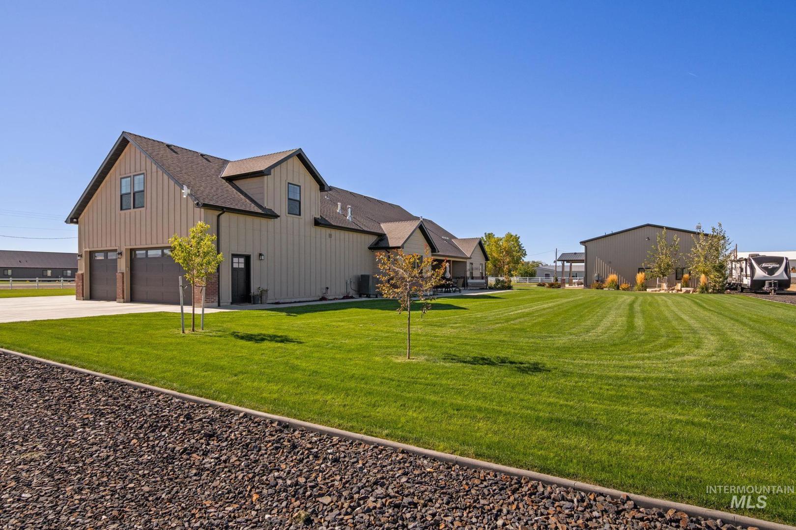 Modern Country Luxury on 3 acres! This custom home blends high-end finishes with open, inviting spaces for effortless family living. The gourmet kitchen features quartzite countertops, a 6-burner propane range with grill, dual ovens, pot filler, spacious butler’s pantry, and all kitchen appliances included. With a formal dining room and open layout, it’s perfect for gatherings and home cooking. The living room showcases 10-ft ceilings, custom built-ins, and a striking floor-to-ceiling stone fireplace that anchors the home. The primary suite with vaulted ceiling offers dual vanities, a tiled walk-in shower, soaker tub, and generous closet with built-in safe room. A versatile craft or office space adds flexibility for work or hobbies. Outdoors, unwind on the covered patio with hot tub, gather by the firepit, or tend the garden surrounded by open country views. The landscaped yard features curbing, vinyl fencing, sprinklers, Burley irrigation shares, and an RV hook-up. The insulated and heated 70`×40` shop provides space for projects, storage, and a man room with A/C, kitchenette, and half bath. Move-in ready—This Home is where modern comfort meets Idaho country living.