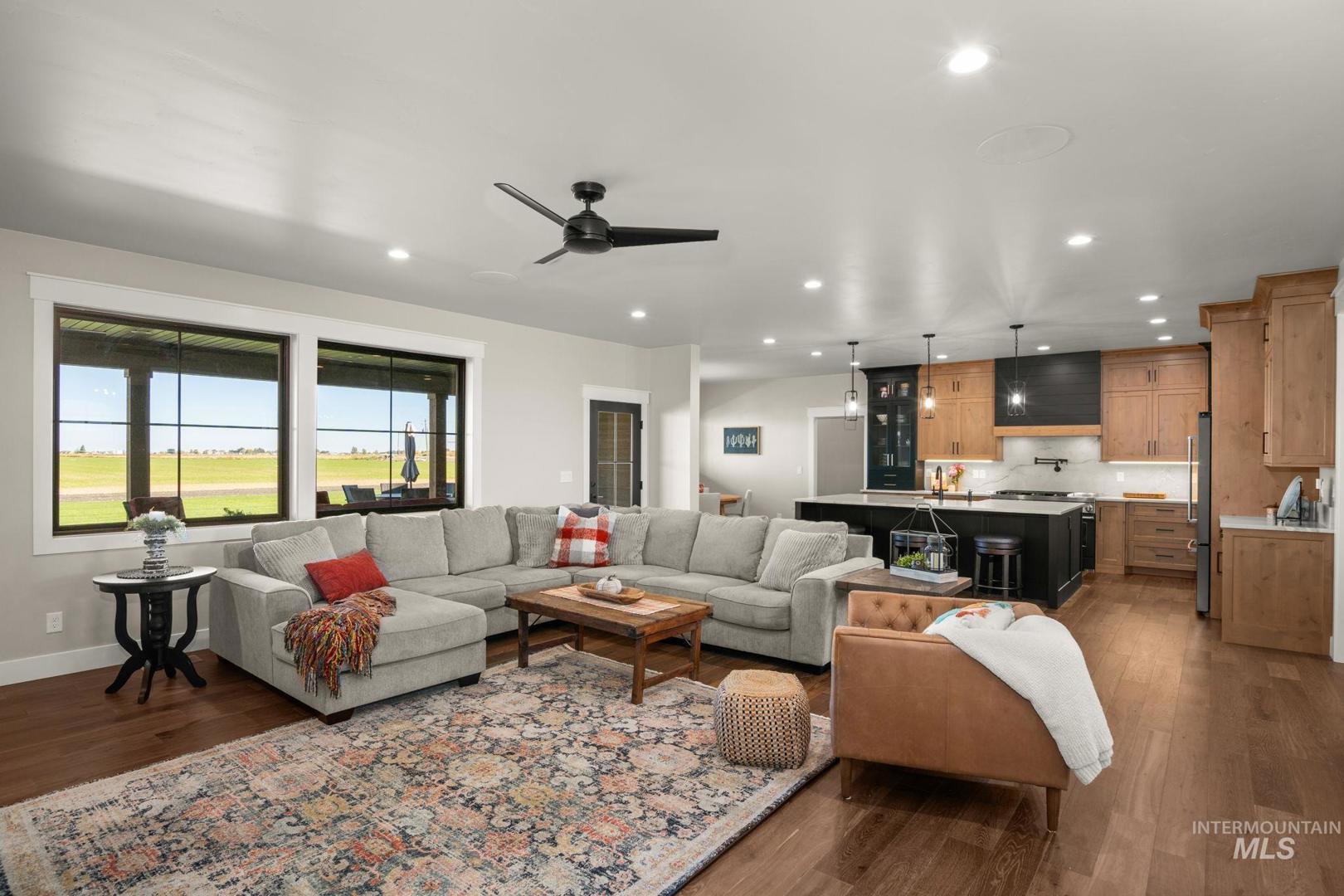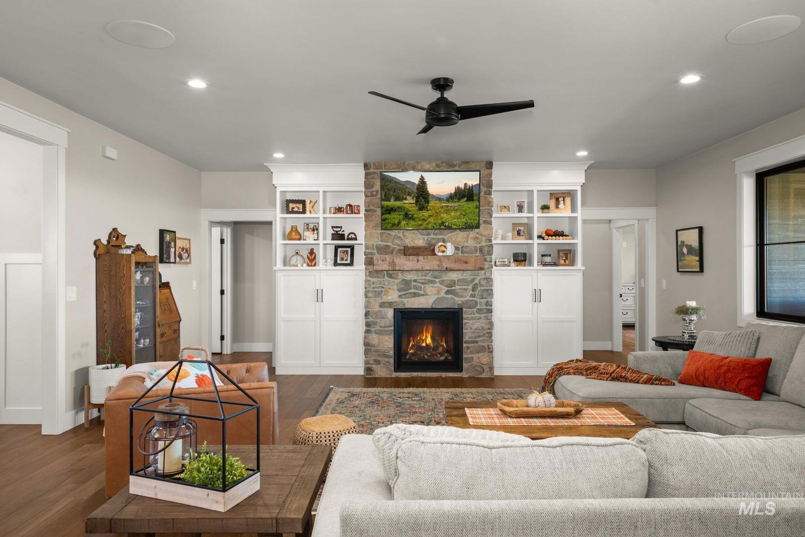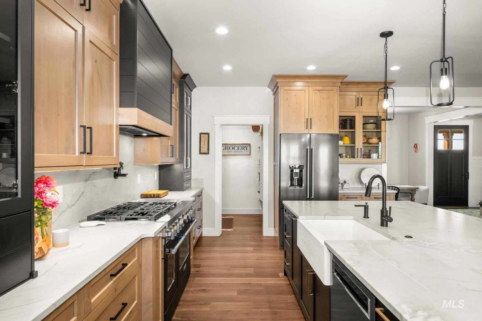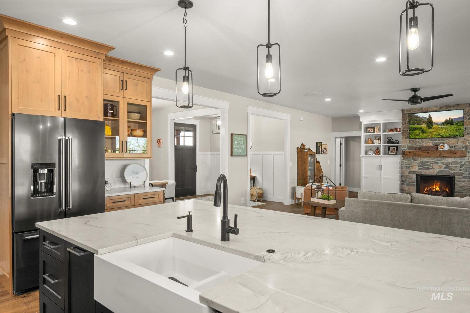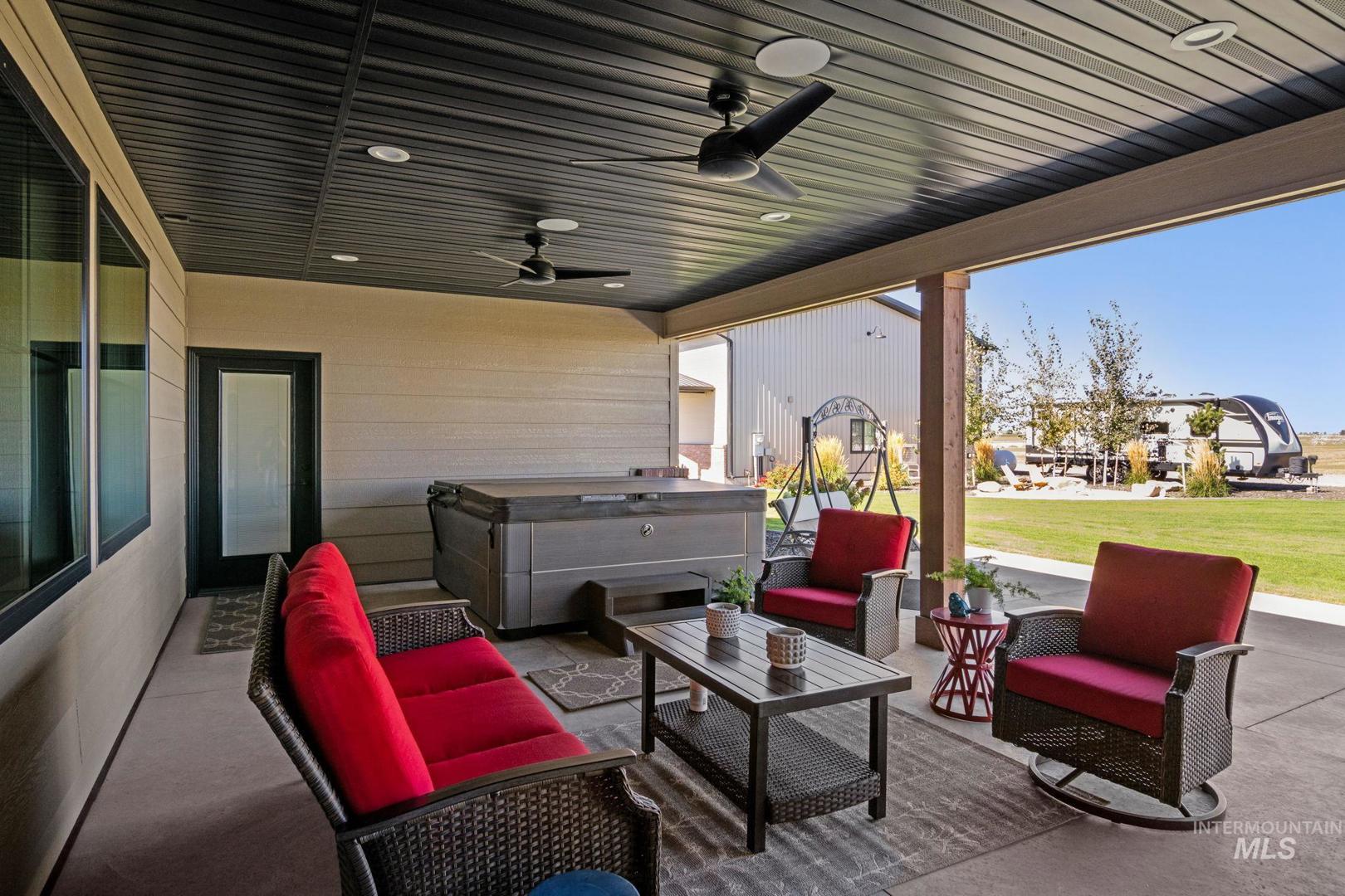 Modern Country Luxury on 3 acres! This custom home blends high-end finishes with open, inviting spaces for effortless family living. The gourmet kitchen features quartzite countertops, a 6-burner propane range with grill, dual ovens, pot filler, spacious butler’s pantry, and all kitchen appliances included. With a formal dining room and open layout, it’s perfect for gatherings and home cooking. The living room showcases 10-ft ceilings, custom built-ins, and a striking floor-to-ceiling stone fireplace that anchors the home. The primary suite with vaulted ceiling offers dual vanities, a tiled walk-in shower, soaker tub, and generous closet with built-in safe room. A versatile craft or office space adds flexibility for work or hobbies. Outdoors, unwind on the covered patio with hot tub, gather by the firepit, or tend the garden surrounded by open country views. The landscaped yard features curbing, vinyl fencing, sprinklers, Burley irrigation shares, and an RV hook-up. The insulated and heated 70`×40` shop provides space for projects, storage, and a man room with A/C, kitchenette, and half bath. Move-in ready—This Home is where modern comfort meets Idaho country living.