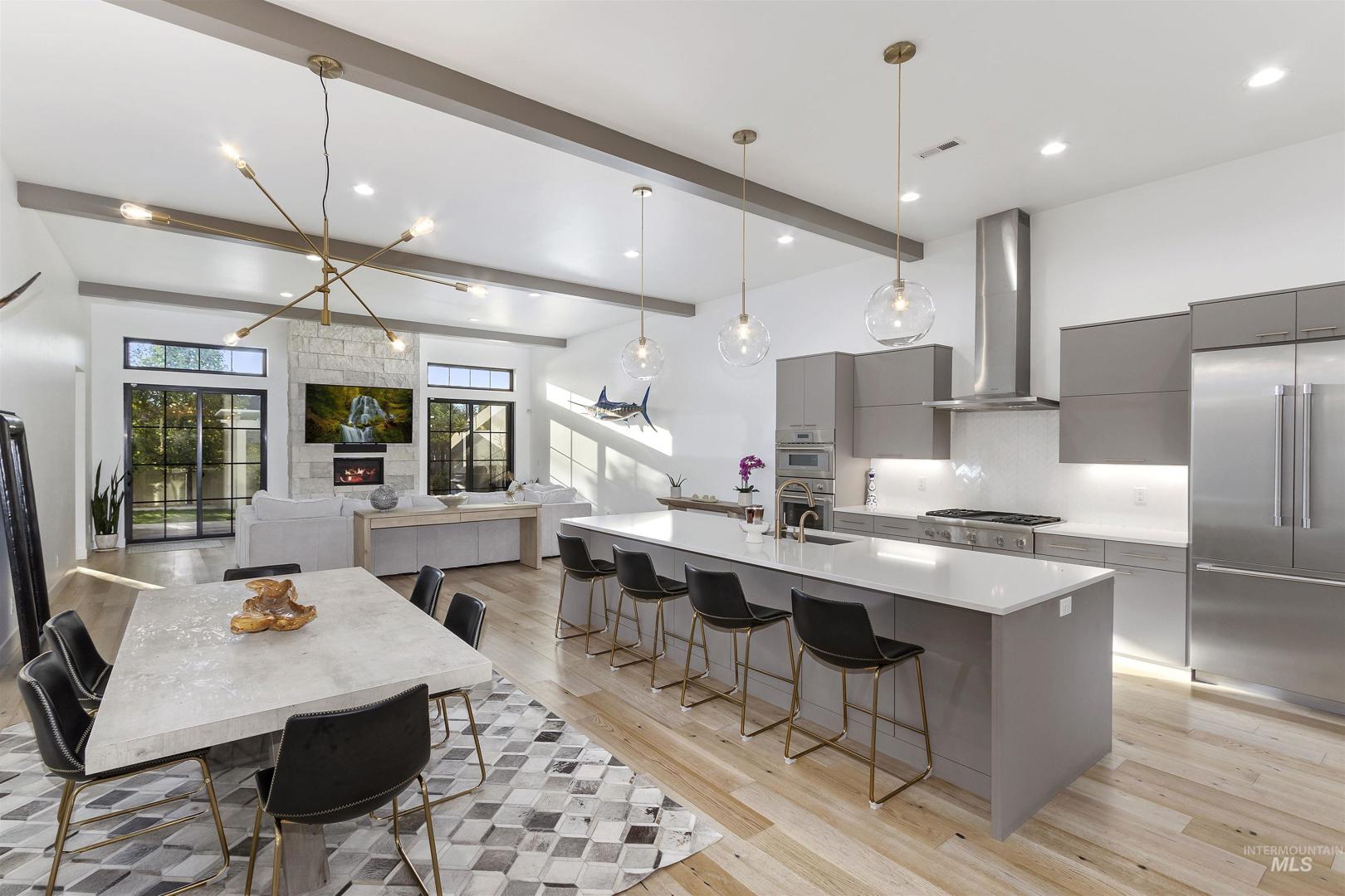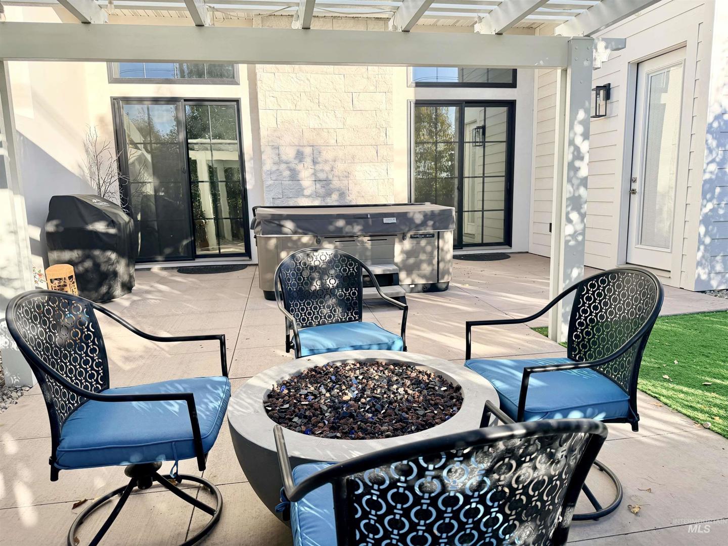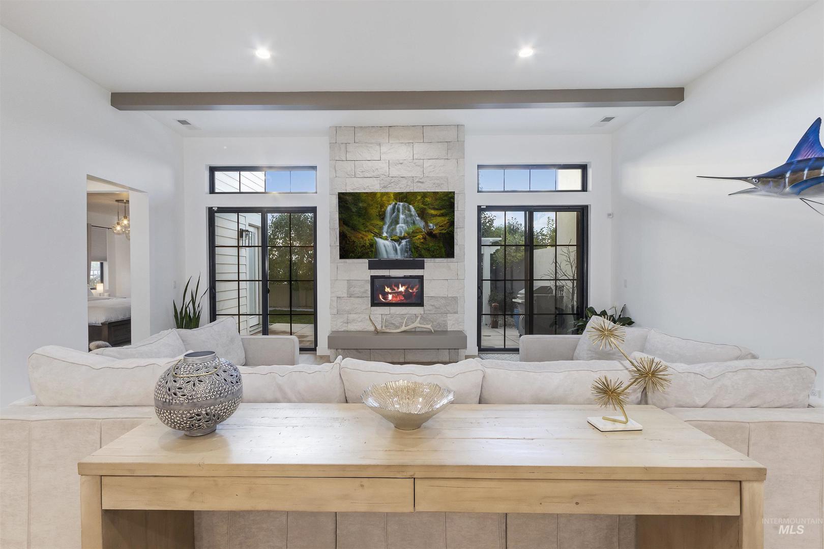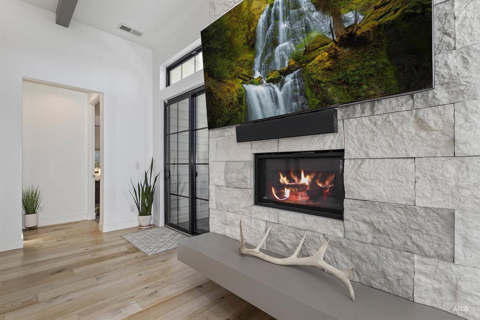Embrace luxury living in this 2,500+ sq ft home featuring an upper bonus room & 3 primary suites. Soaring 12-ft, beamed ceilings & luxury plank wood floors set a warm, elevated tone throughout the bright, modern open concept floor plan. The designer’s kitchen showcases Thermador Professional appliances, European cabinetry, quartz countertops, oversized Butler’s pantry, & 12 ft island with integrated sink, open front cabinet & beverage fridge—perfect for everyday living or entertaining. Textured stone gas fireplace anchors the great room. 3.5 lavish baths with quartz countertops, 1 soaking tub, glass showers, double vanities, walk-in closet & tile floors. All bathrooms feature radiant floor heating with an individual smart thermostat for personalized comfort. 3 primary suites feature walk-in closets. The laundry room adds a deep-built-in farm sink with removable faucet & tile flooring for effortless utility. Comfort comes easily with energy-efficient gas heat, central air, tankless on demand hot water system & Kentico reverse-osmosis water softener. Outdoors, there are 2 Pergolas with lighting, 1 of which covers a gas integrated fire pit & a luxury 8-person interior marble appearing design spa by Bullfrog purchased in 2023. Enjoy the attached 2-car garage with direct access into a stylish mudroom for daily convenience. A must-see property! Call to schedule your private showing today!