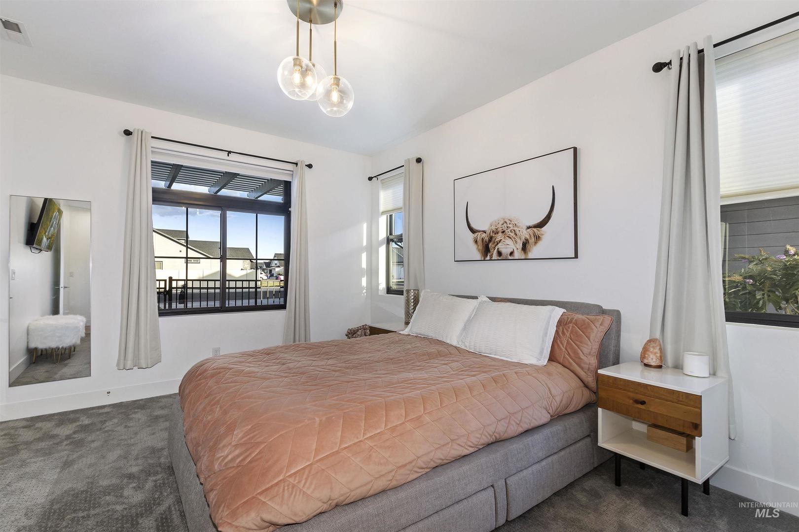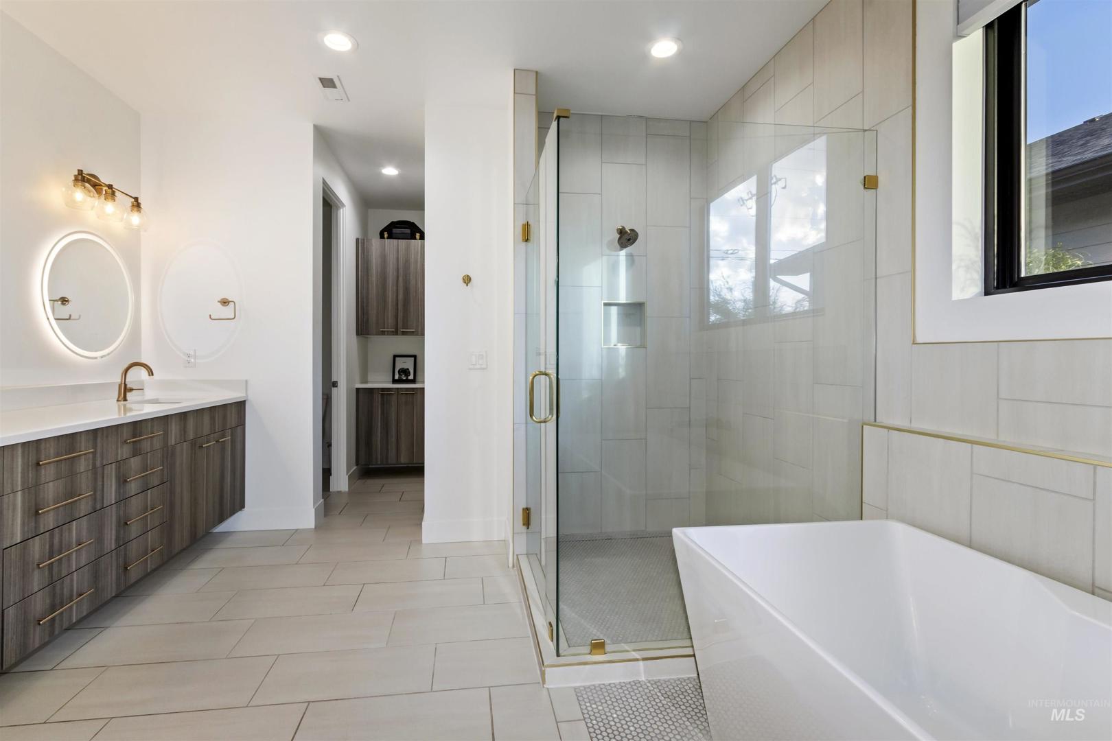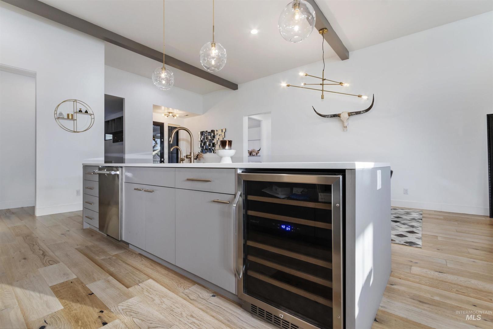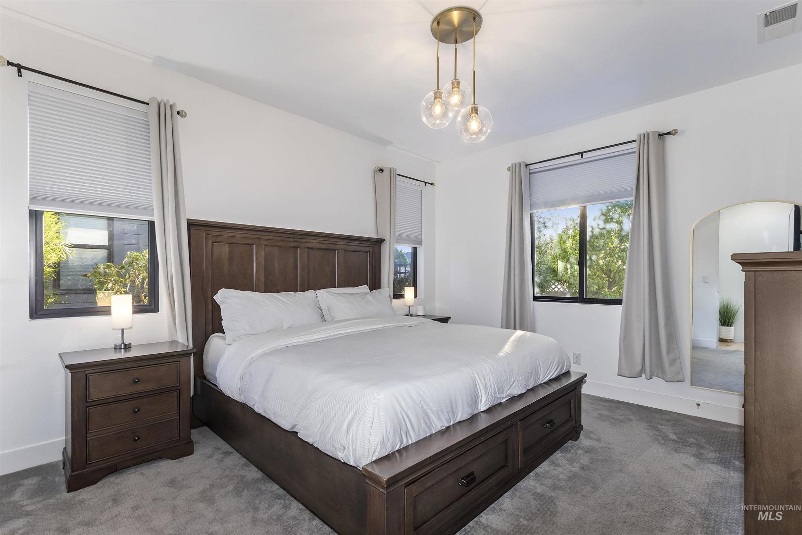 Embrace luxury living in this 2,500+ sq ft home featuring an upper bonus room & 3 primary suites. Soaring 12-ft, beamed ceilings & luxury plank wood floors set a warm, elevated tone throughout the bright, modern open concept floor plan. The designer’s kitchen showcases Thermador Professional appliances, European cabinetry, quartz countertops, oversized Butler’s pantry, & 12 ft island with integrated sink, open front cabinet & beverage fridge—perfect for everyday living or entertaining. Textured stone gas fireplace anchors the great room. 3.5 lavish baths with quartz countertops, 1 soaking tub, glass showers, double vanities, walk-in closet & tile floors. All bathrooms feature radiant floor heating with an individual smart thermostat for personalized comfort. 3 primary suites feature walk-in closets. The laundry room adds a deep-built-in farm sink with removable faucet & tile flooring for effortless utility. Comfort comes easily with energy-efficient gas heat, central air, tankless on demand hot water system & Kentico reverse-osmosis water softener. Outdoors, there are 2 Pergolas with lighting, 1 of which covers a gas integrated fire pit & a luxury 8-person interior marble appearing design spa by Bullfrog purchased in 2023. Enjoy the attached 2-car garage with direct access into a stylish mudroom for daily convenience. A must-see property! Call to schedule your private showing today!
