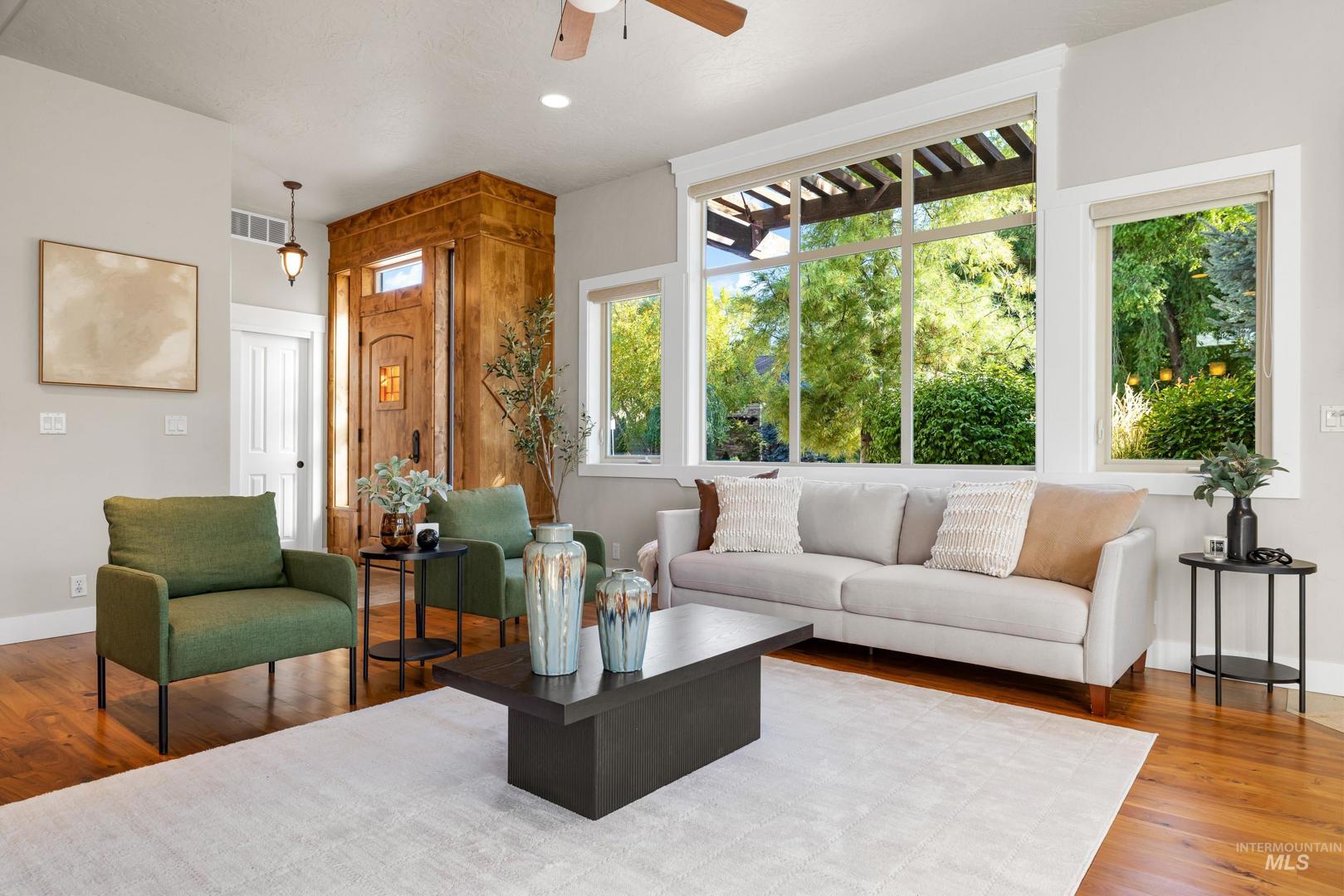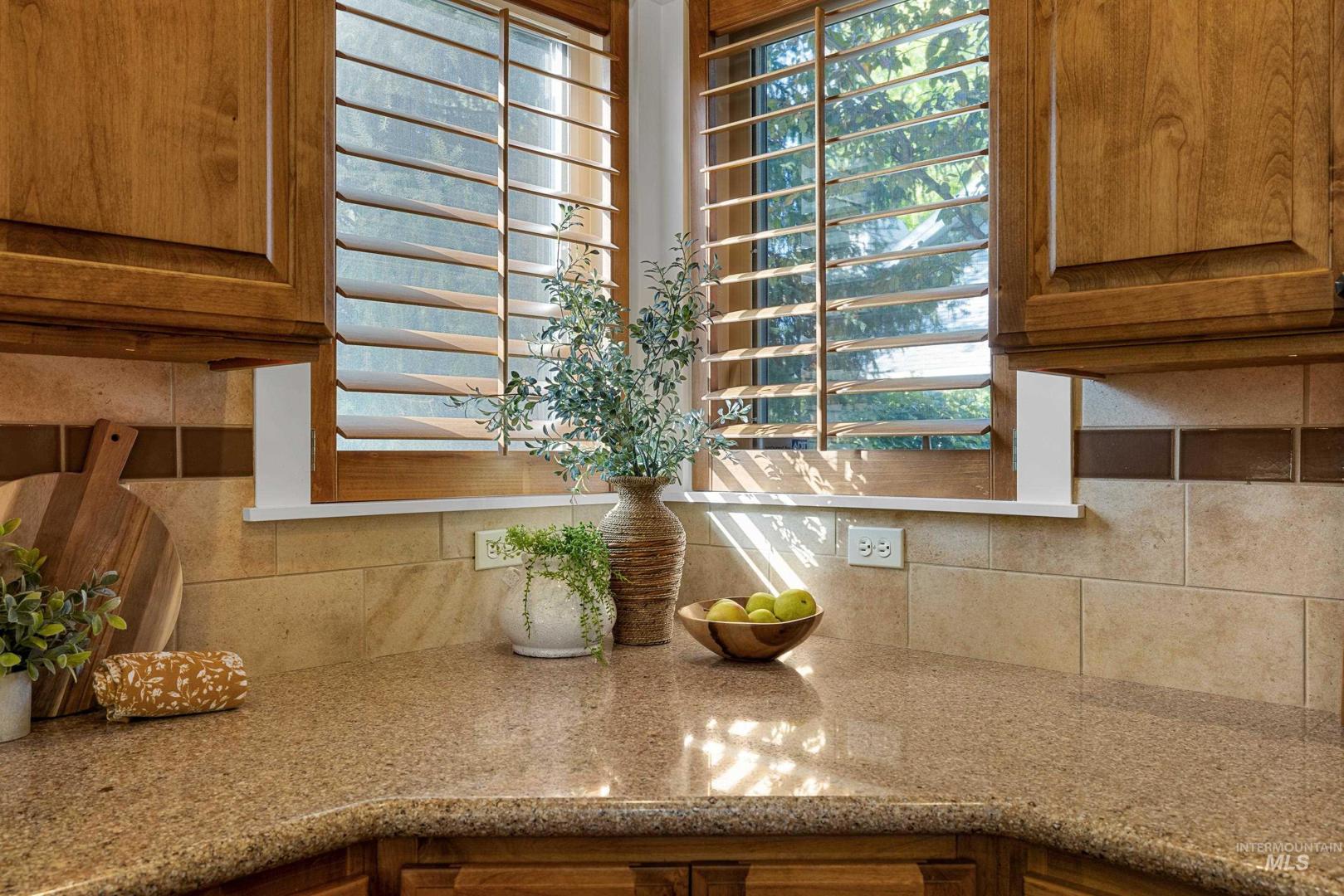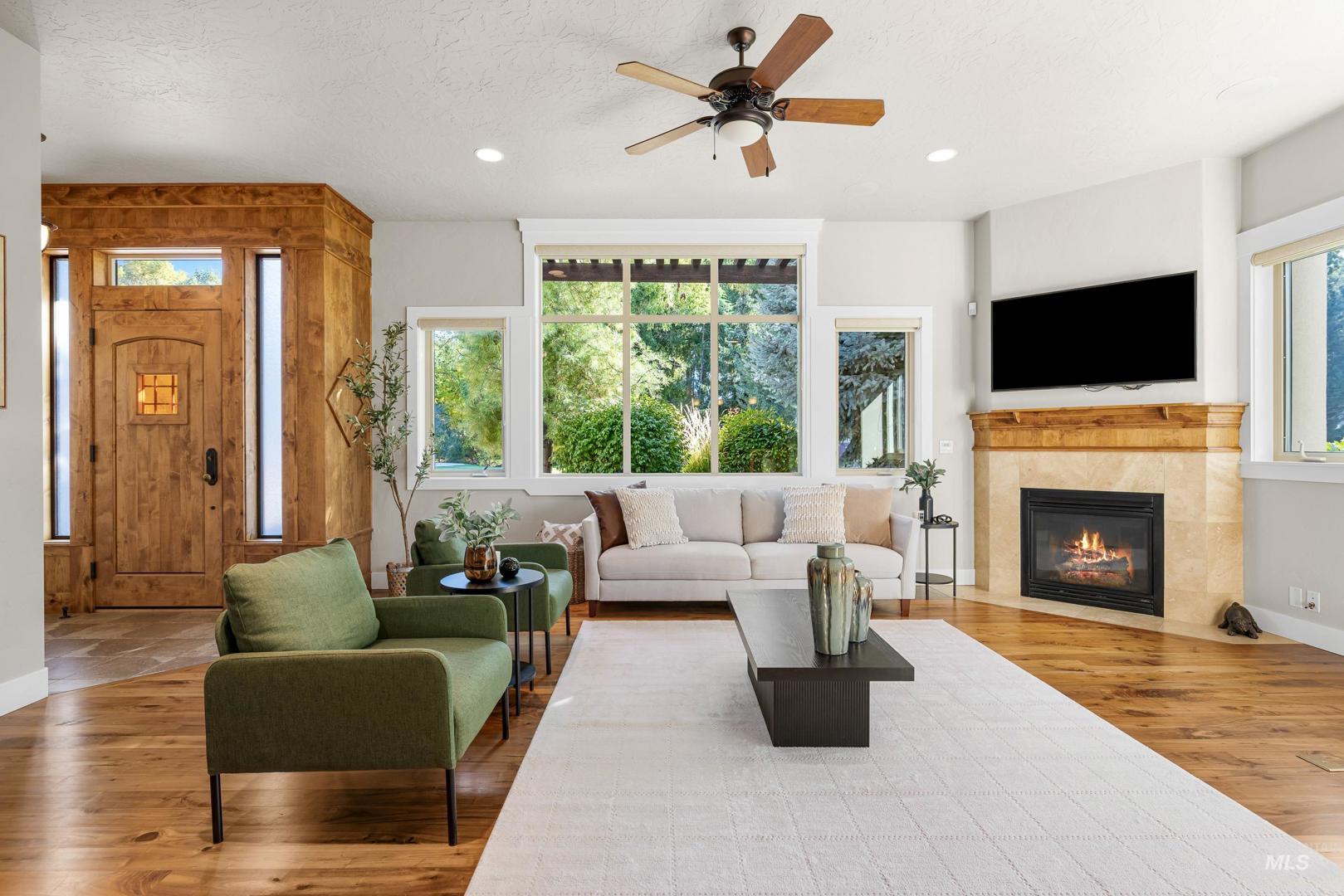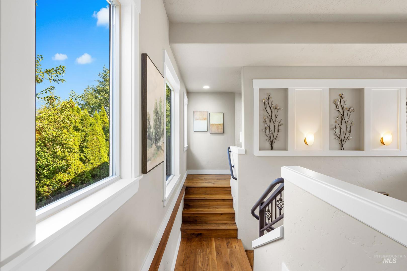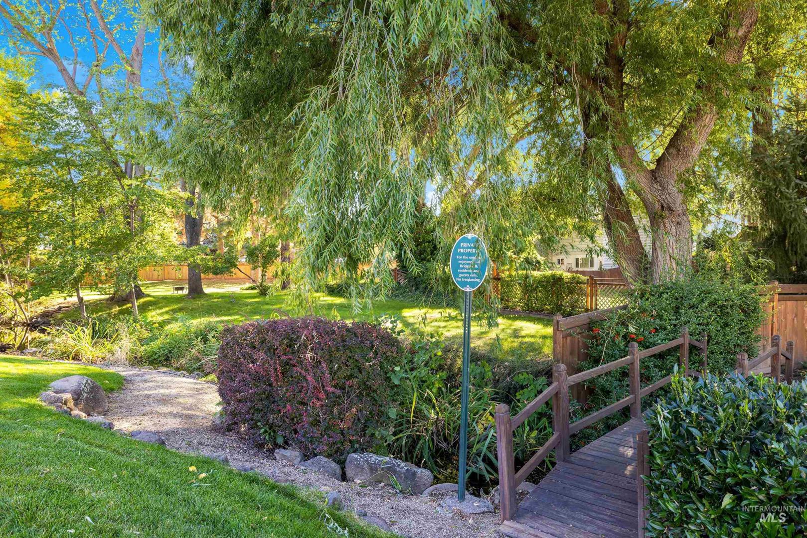This Southeast Boise craftsman perfectly blends timeless character with thoughtful modern design and is anything but cookie cutter. Peacefully tucked within a charming community, this home sits beside a tranquil common area with a water feature and fire pit. Inside, you’ll find custom carpentry and authentic woodwork adding warmth and distinction at every turn. The expansive great room soars with two stories of windows, flooding the space with natural light. High-end finishes and rich details including wood accents, built-ins & a corner gas fireplace create an inviting atmosphere. The kitchen offers a newer appliance package, granite counters, a breakfast bar and display cabinets. The split staircase leads to a smartly designed upper level with an oversized primary suite featuring its own private deck with treetop views. The spa-like bath offers an oversized soaking tub, walk-in shower & generous walk-in closet. Two additional bedrooms, full bath and a built-in desk nook complete the upstairs. Recent upgrades include a new roof in 2025, new furnace 2023, new water heater 2021, new kitchen appliances, refreshed front stucco & upgraded Hunter Douglas window coverings. HOA dues include full landscaping/ lawn care & common area maintenance, making life here as easy as it is beautiful. Located minutes from downtown, the Greenbelt & foothills, this home captures the best of Boise living.