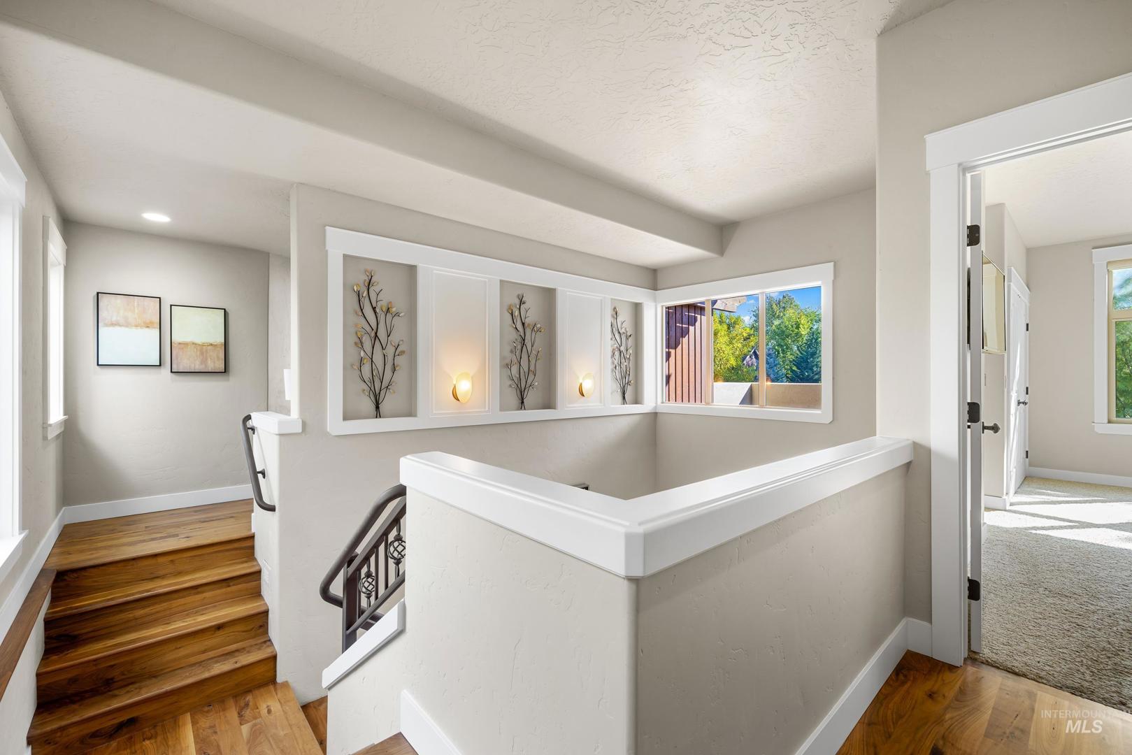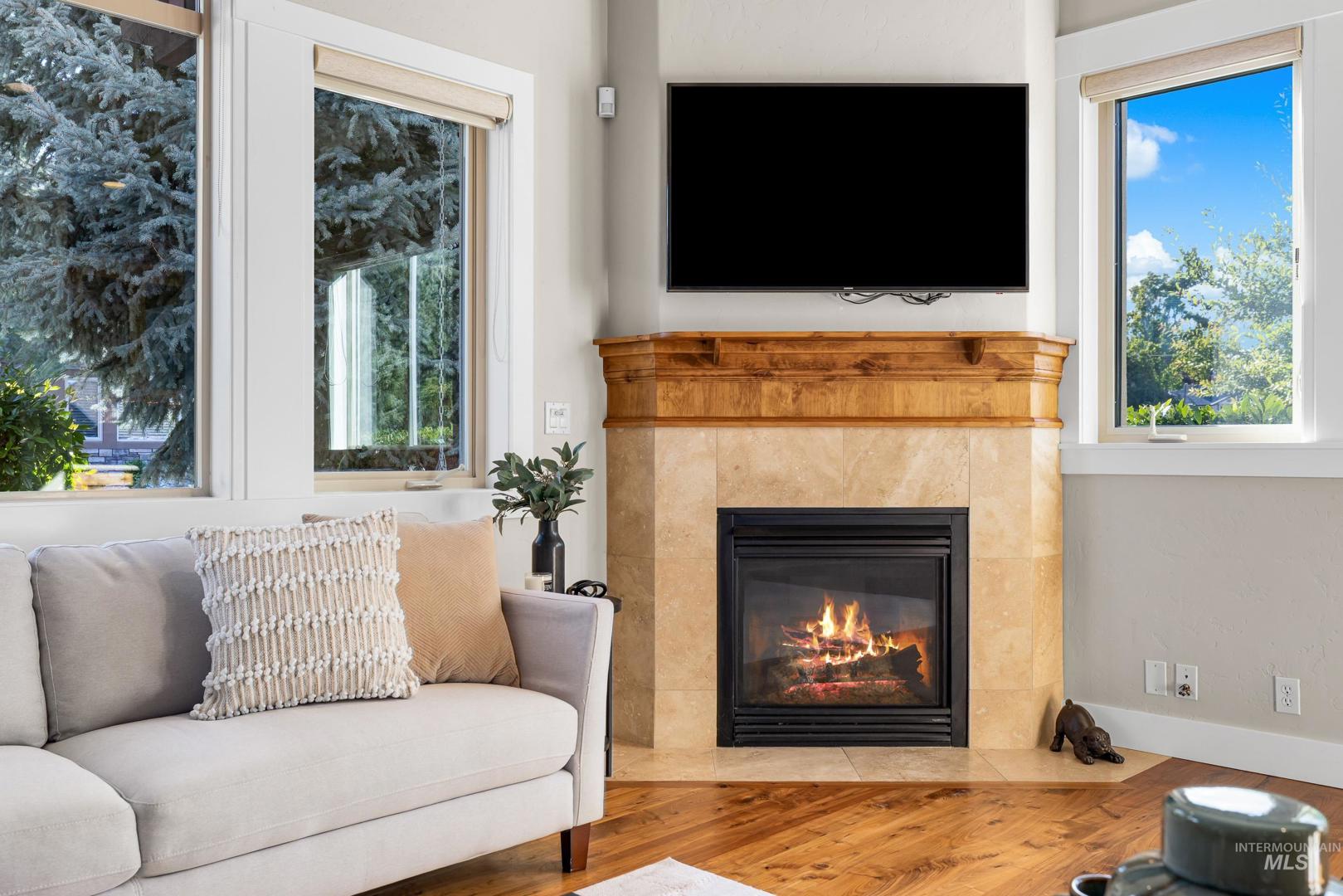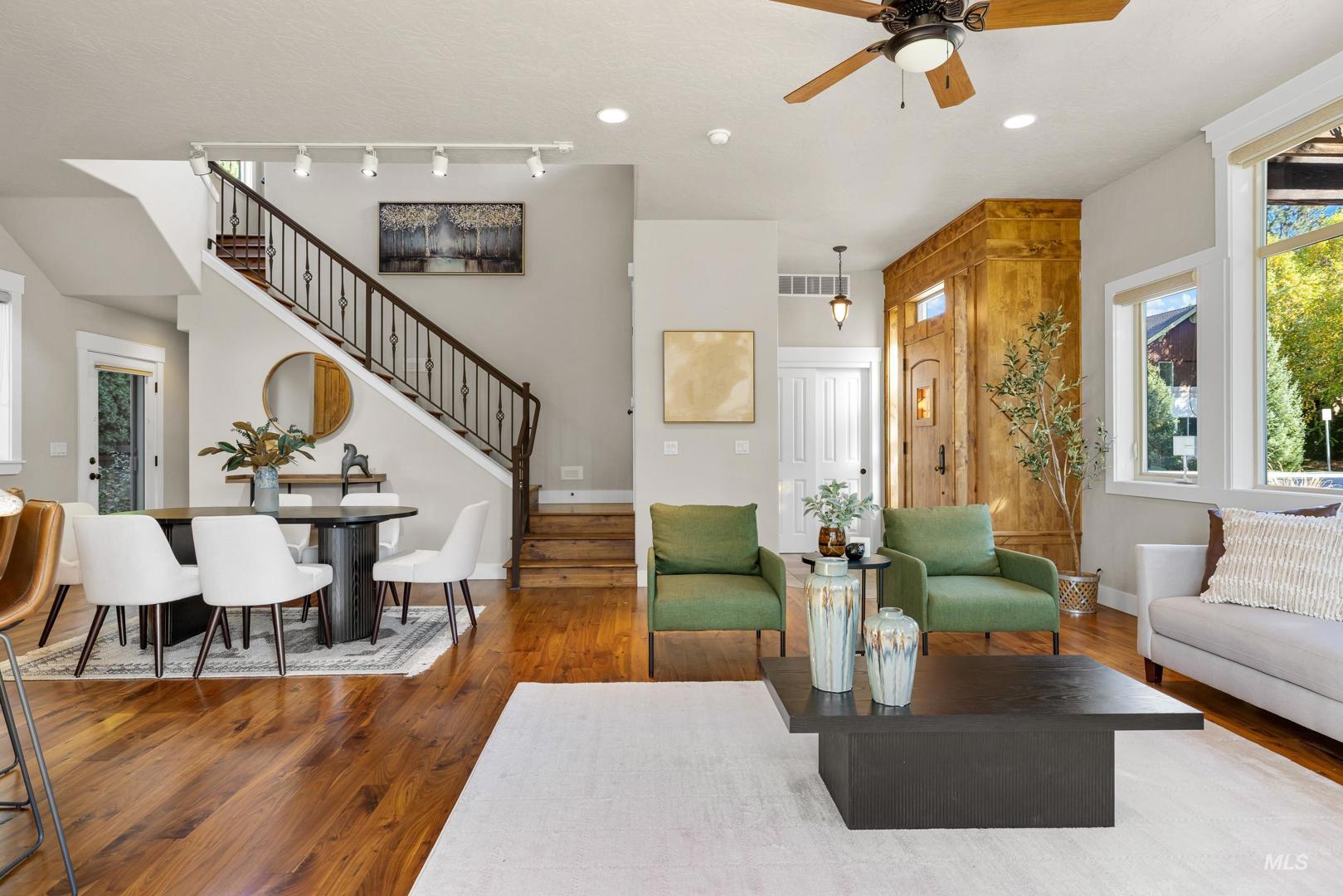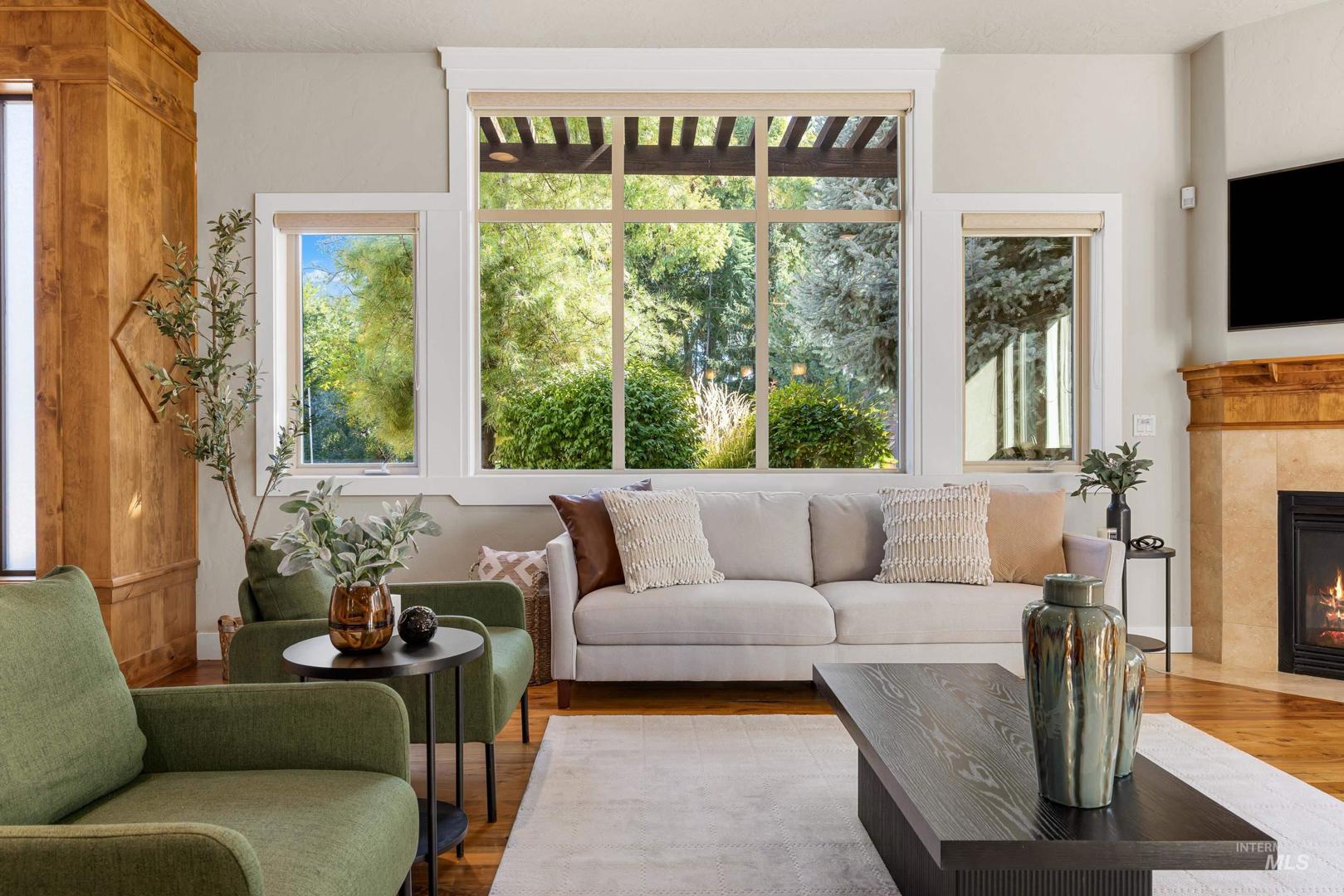 This Southeast Boise craftsman perfectly blends timeless character with thoughtful modern design and is anything but cookie cutter. Peacefully tucked within a charming community, this home sits beside a tranquil common area with a water feature and fire pit. Inside, you’ll find custom carpentry and authentic woodwork adding warmth and distinction at every turn. The expansive great room soars with two stories of windows, flooding the space with natural light. High-end finishes and rich details including wood accents, built-ins & a corner gas fireplace create an inviting atmosphere. The kitchen offers a newer appliance package, granite counters, a breakfast bar and display cabinets. The split staircase leads to a smartly designed upper level with an oversized primary suite featuring its own private deck with treetop views. The spa-like bath offers an oversized soaking tub, walk-in shower & generous walk-in closet. Two additional bedrooms, full bath and a built-in desk nook complete the upstairs. Recent upgrades include a new roof in 2025, new furnace 2023, new water heater 2021, new kitchen appliances, refreshed front stucco & upgraded Hunter Douglas window coverings. HOA dues include full landscaping/ lawn care & common area maintenance, making life here as easy as it is beautiful. Located minutes from downtown, the Greenbelt & foothills, this home captures the best of Boise living.