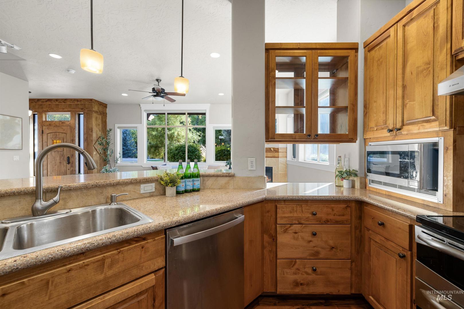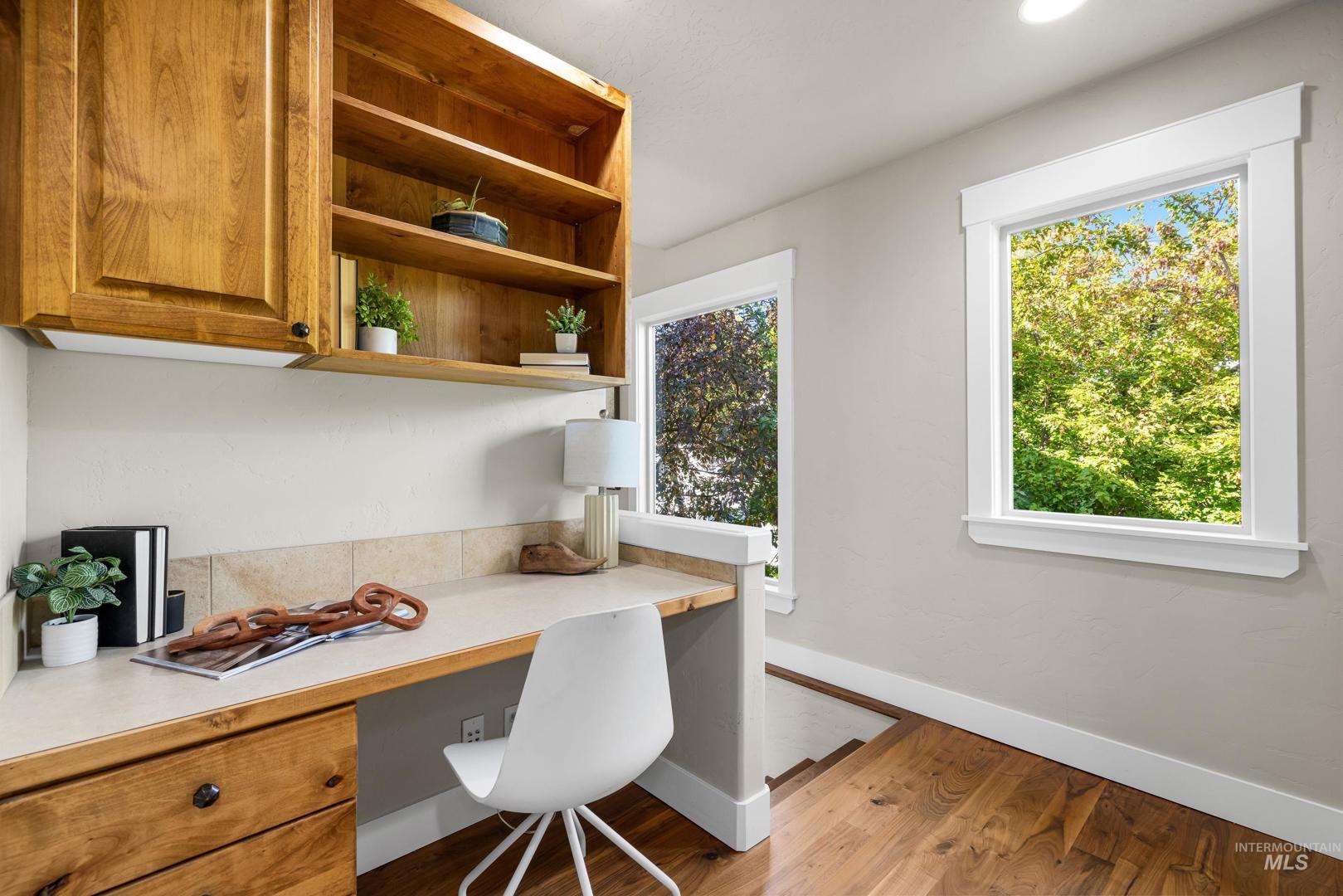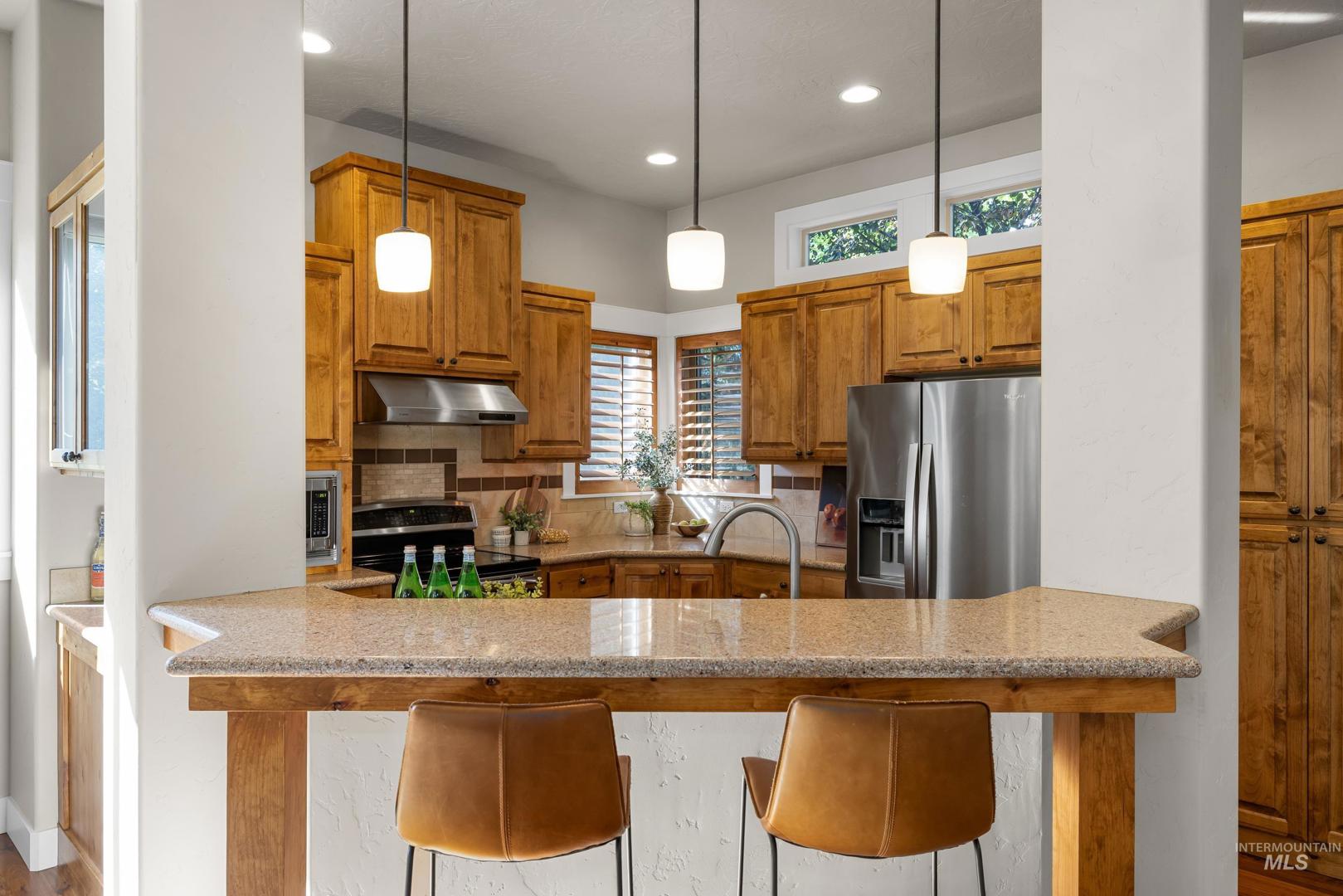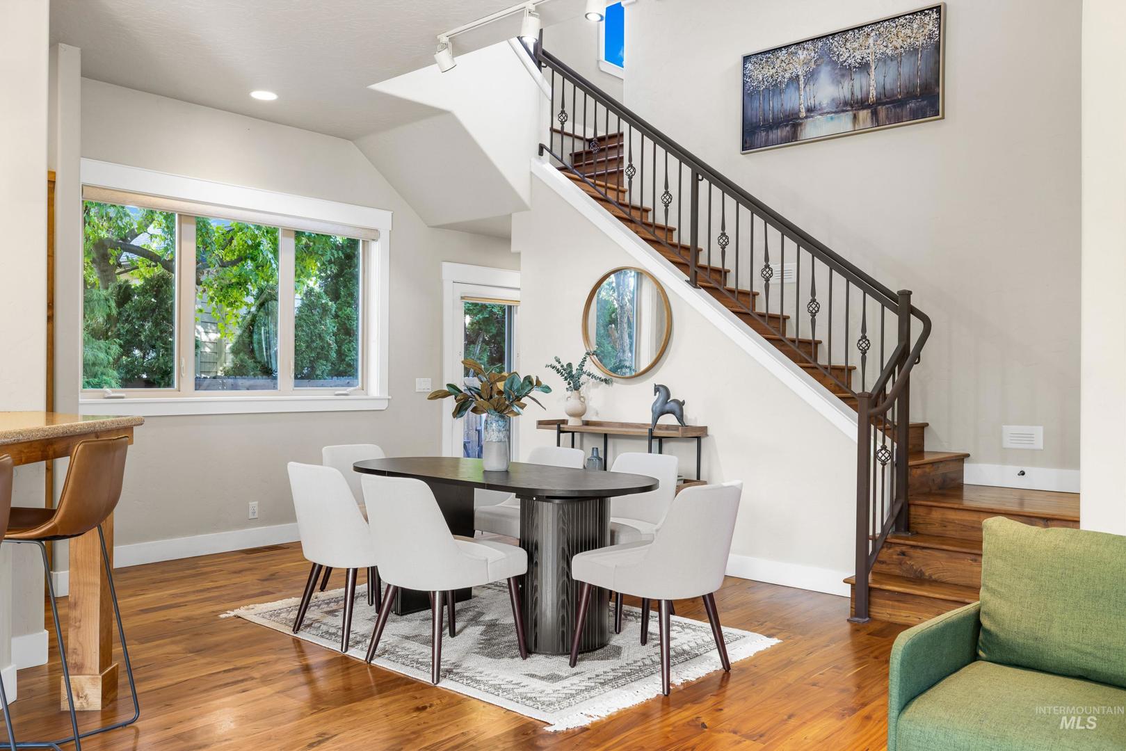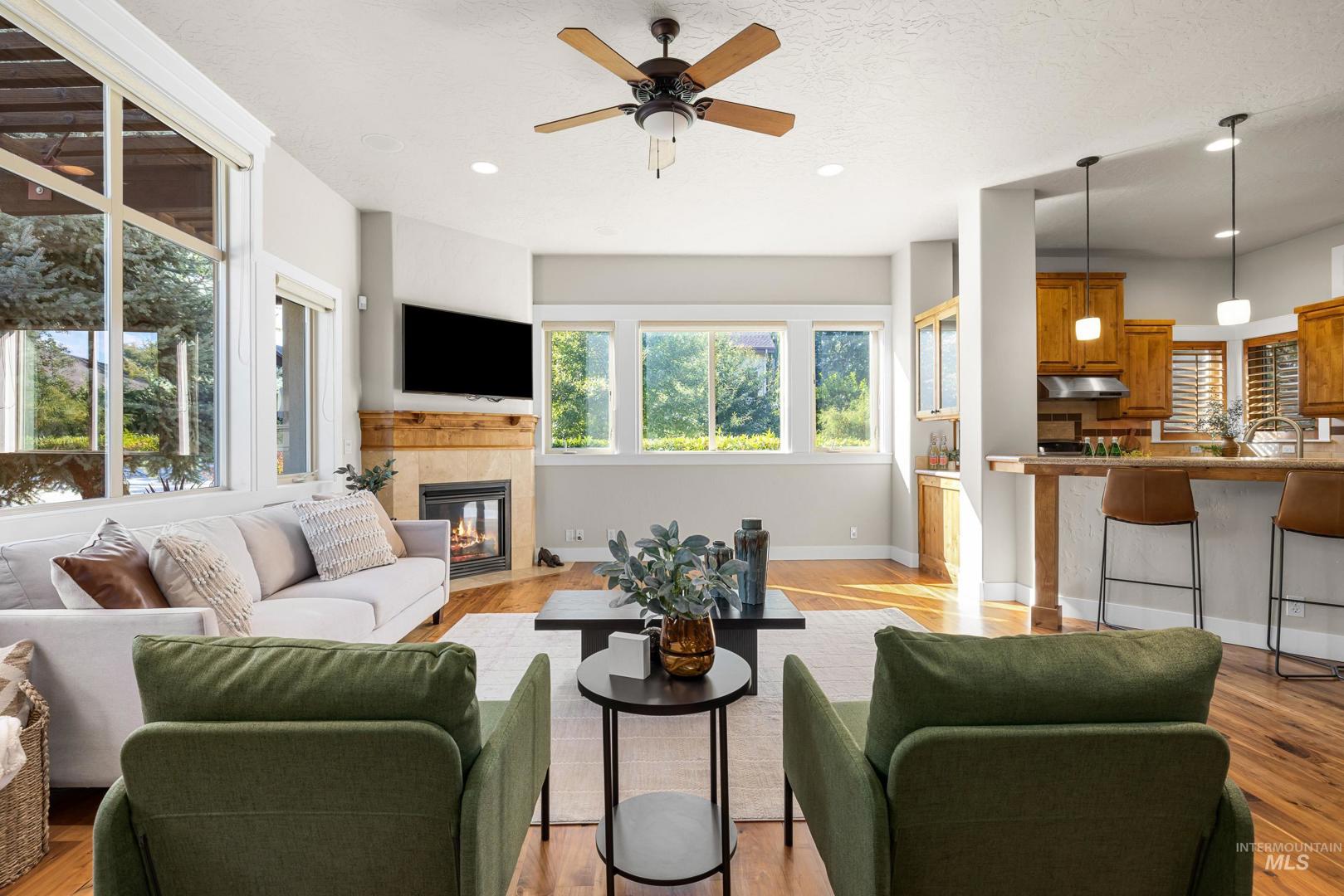 This Southeast Boise craftsman perfectly blends timeless character with thoughtful modern design and is anything but cookie cutter. Peacefully tucked within a charming community, this home sits beside a tranquil common area with a water feature and fire pit. Inside, you’ll find custom carpentry and authentic woodwork adding warmth and distinction at every turn. The expansive great room soars with two stories of windows, flooding the space with natural light. High-end finishes and rich details including wood accents, built-ins & a corner gas fireplace create an inviting atmosphere. The kitchen offers a newer appliance package, granite counters, a breakfast bar and display cabinets. The split staircase leads to a smartly designed upper level with an oversized primary suite featuring its own private deck with treetop views. The spa-like bath offers an oversized soaking tub, walk-in shower & generous walk-in closet. Two additional bedrooms, full bath and a built-in desk nook complete the upstairs. Recent upgrades include a new roof in 2025, new furnace 2023, new water heater 2021, new kitchen appliances, refreshed front stucco & upgraded Hunter Douglas window coverings. HOA dues include full landscaping/ lawn care & common area maintenance, making life here as easy as it is beautiful. Located minutes from downtown, the Greenbelt & foothills, this home captures the best of Boise living.