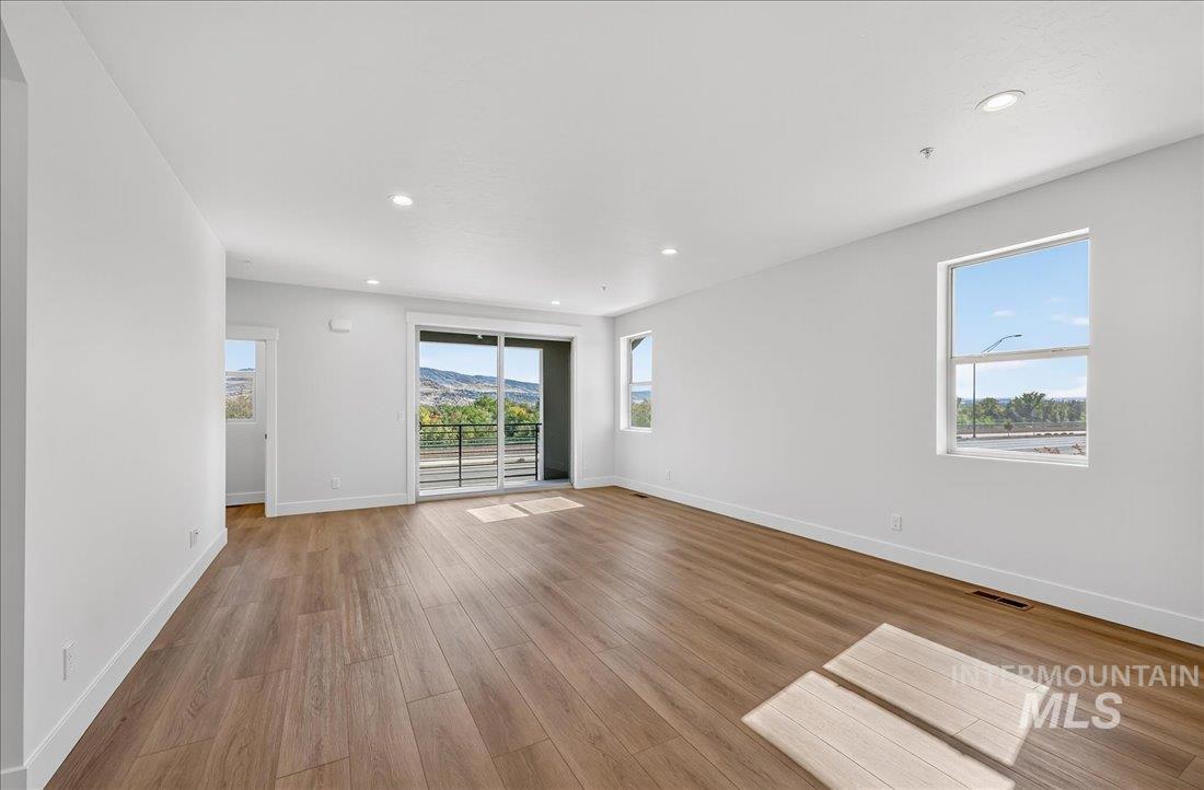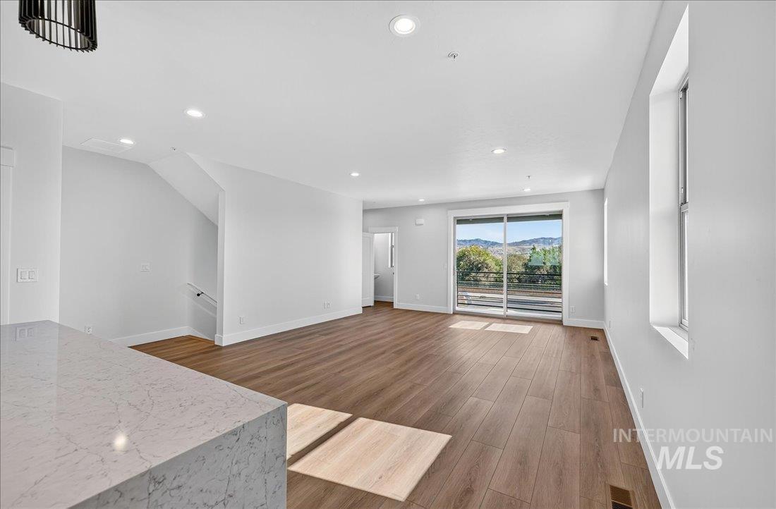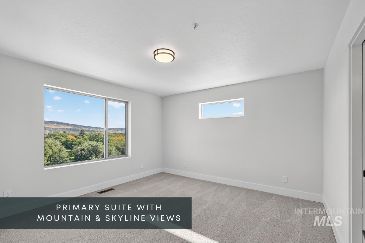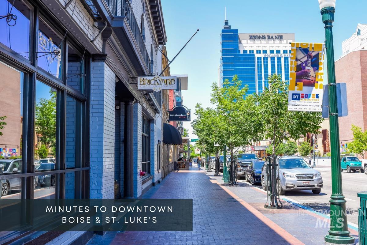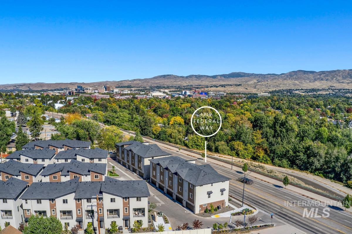 Where modern design meets panoramic perspective. A rare end-unit with sweeping mountain views throughout, just minutes from Downtown, Boise State University & Micron. A light-filled residence designed to impress with ample upgrades & oversized windows that frame unobstructed views. A turn-key opportunity with three spacious bedrooms, each with a dedicated ensuite bath & a primary suite with city skyline views. Tall, airy ceilings span the open layout with sleek, high-end finishes throughout, including stylish LVP flooring in the main living areas, custom cabinetry & designer finishes. A striking waterfall-edge quartz island serves as the centerpiece of the gourmet kitchen, complete with a premium KitchenAid® appliance package including a refrigerator & spacious walk-in pantry with open sight-lines to the living room & patio beyond. The lower-level suite is tailor-made for a home-based business, professional studio, or private guest quarters. A spacious two-car garage provides secure parking & extra storage. Offering exceptional versatility as a lock & leave home, long-term investment or flexible short term rental. Midtown Heights is a collection of 35 newly built residences by Tresidio Homes, a trusted local builder known for elevated design & quality craftsmanship. Designed for easy living, the community offers professionally managed landscaping & exterior upkeep through the HOA.