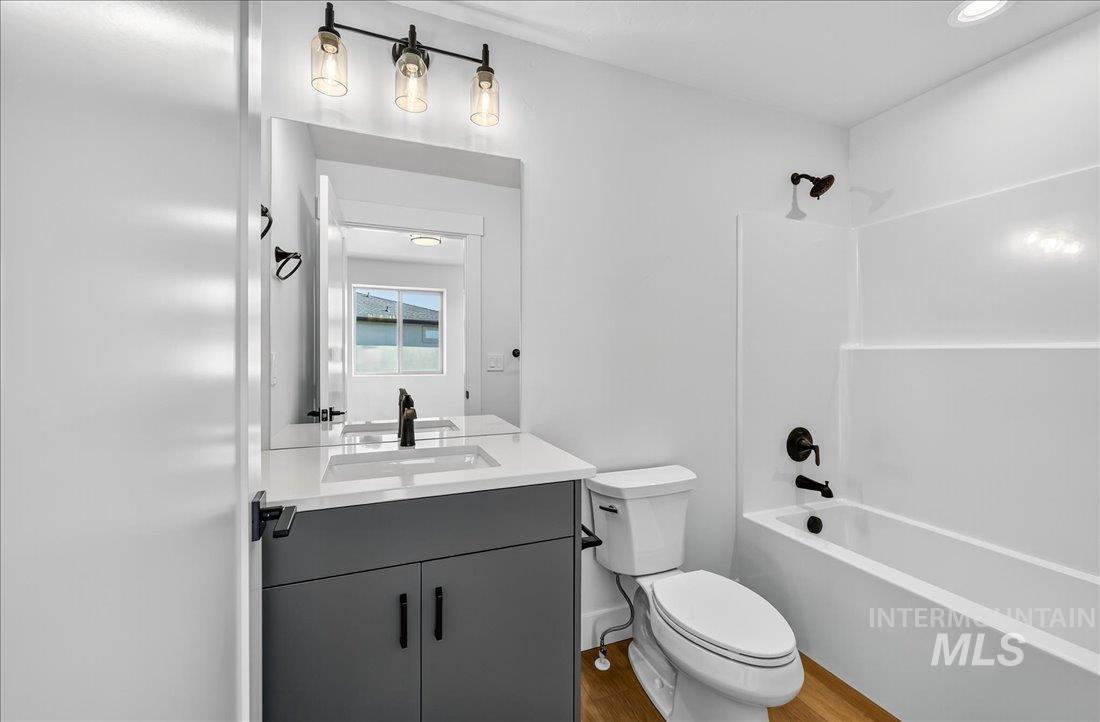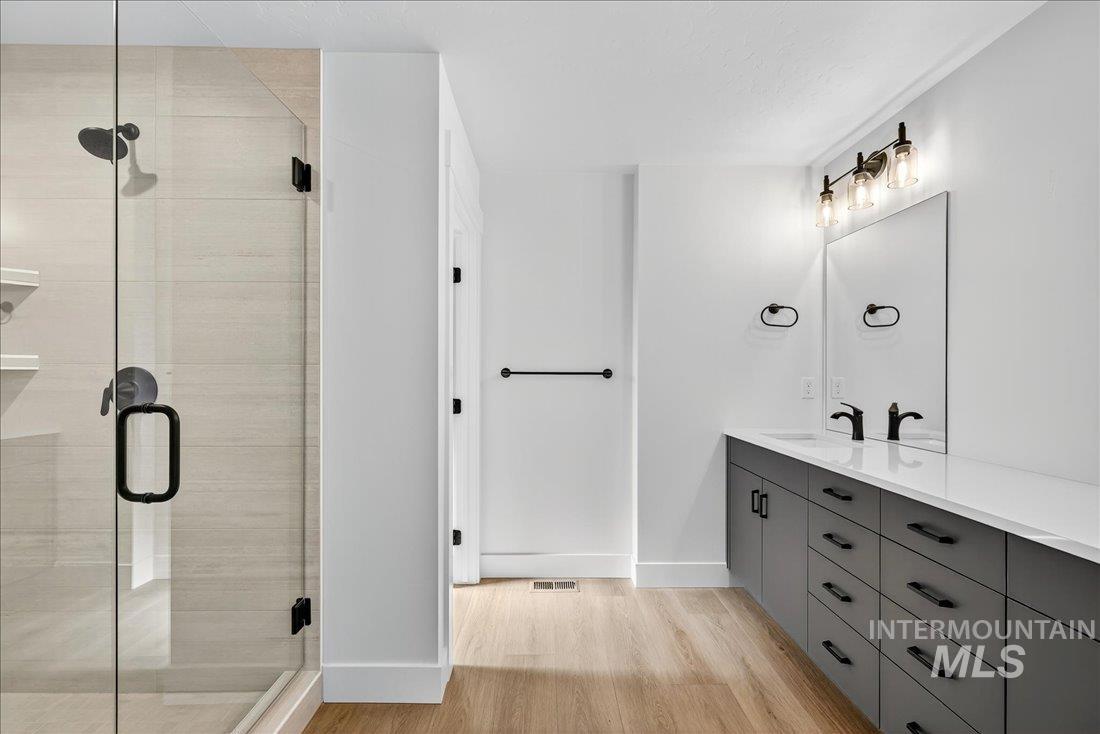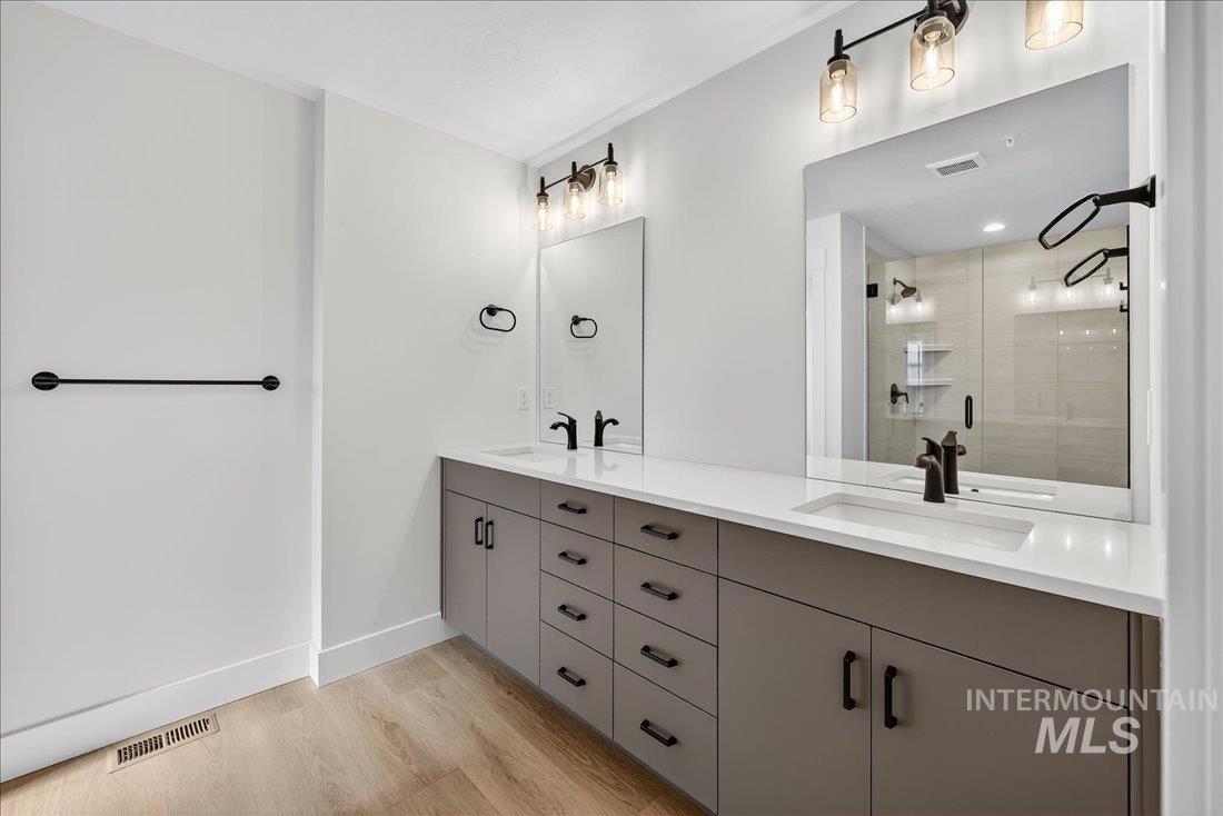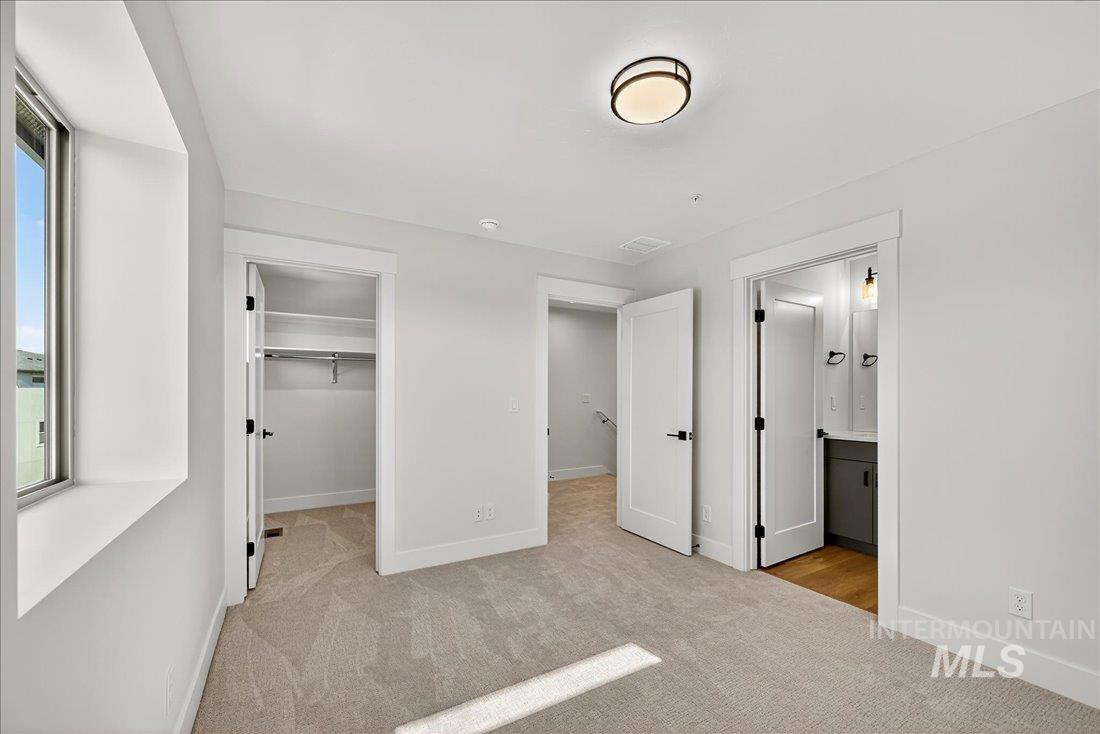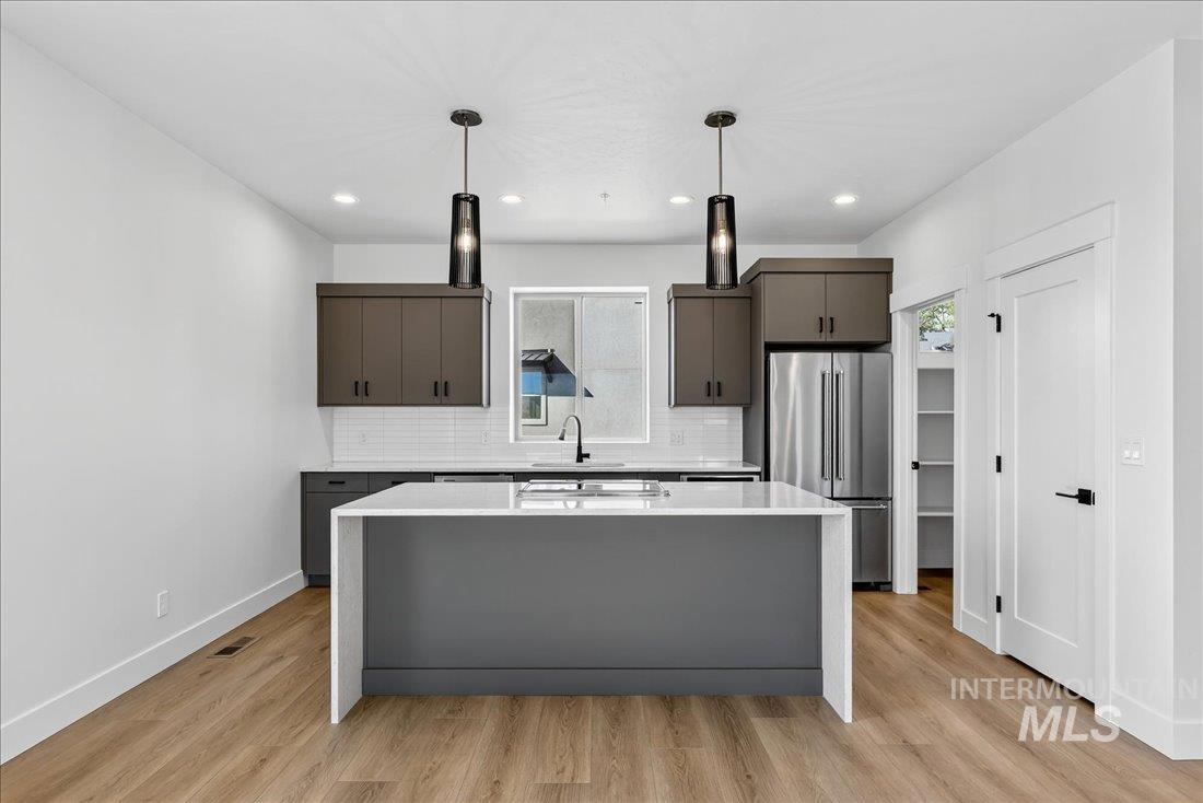 Where modern design meets panoramic perspective. A rare end-unit with sweeping mountain views throughout, just minutes from Downtown, Boise State University & Micron. A light-filled residence designed to impress with ample upgrades & oversized windows that frame unobstructed views. A turn-key opportunity with three spacious bedrooms, each with a dedicated ensuite bath & a primary suite with city skyline views. Tall, airy ceilings span the open layout with sleek, high-end finishes throughout, including stylish LVP flooring in the main living areas, custom cabinetry & designer finishes. A striking waterfall-edge quartz island serves as the centerpiece of the gourmet kitchen, complete with a premium KitchenAid® appliance package including a refrigerator & spacious walk-in pantry with open sight-lines to the living room & patio beyond. The lower-level suite is tailor-made for a home-based business, professional studio, or private guest quarters. A spacious two-car garage provides secure parking & extra storage. Offering exceptional versatility as a lock & leave home, long-term investment or flexible short term rental. Midtown Heights is a collection of 35 newly built residences by Tresidio Homes, a trusted local builder known for elevated design & quality craftsmanship. Designed for easy living, the community offers professionally managed landscaping & exterior upkeep through the HOA.