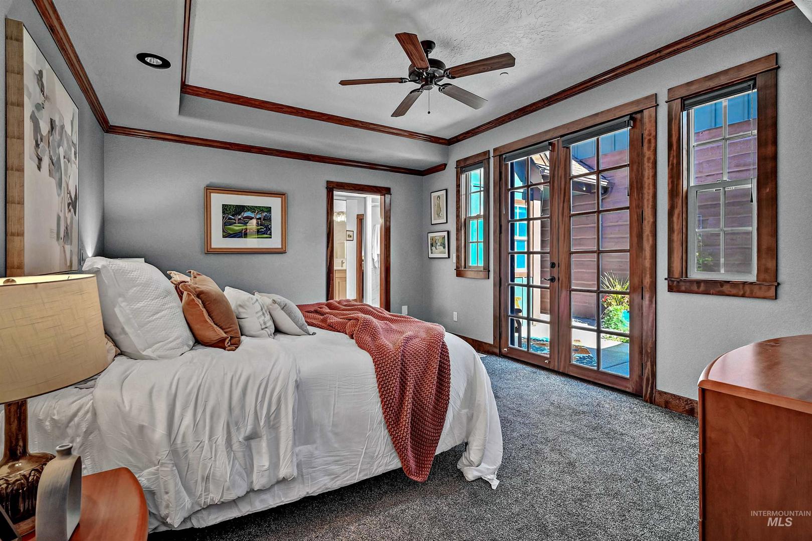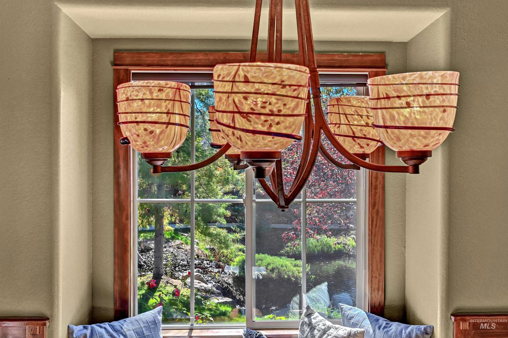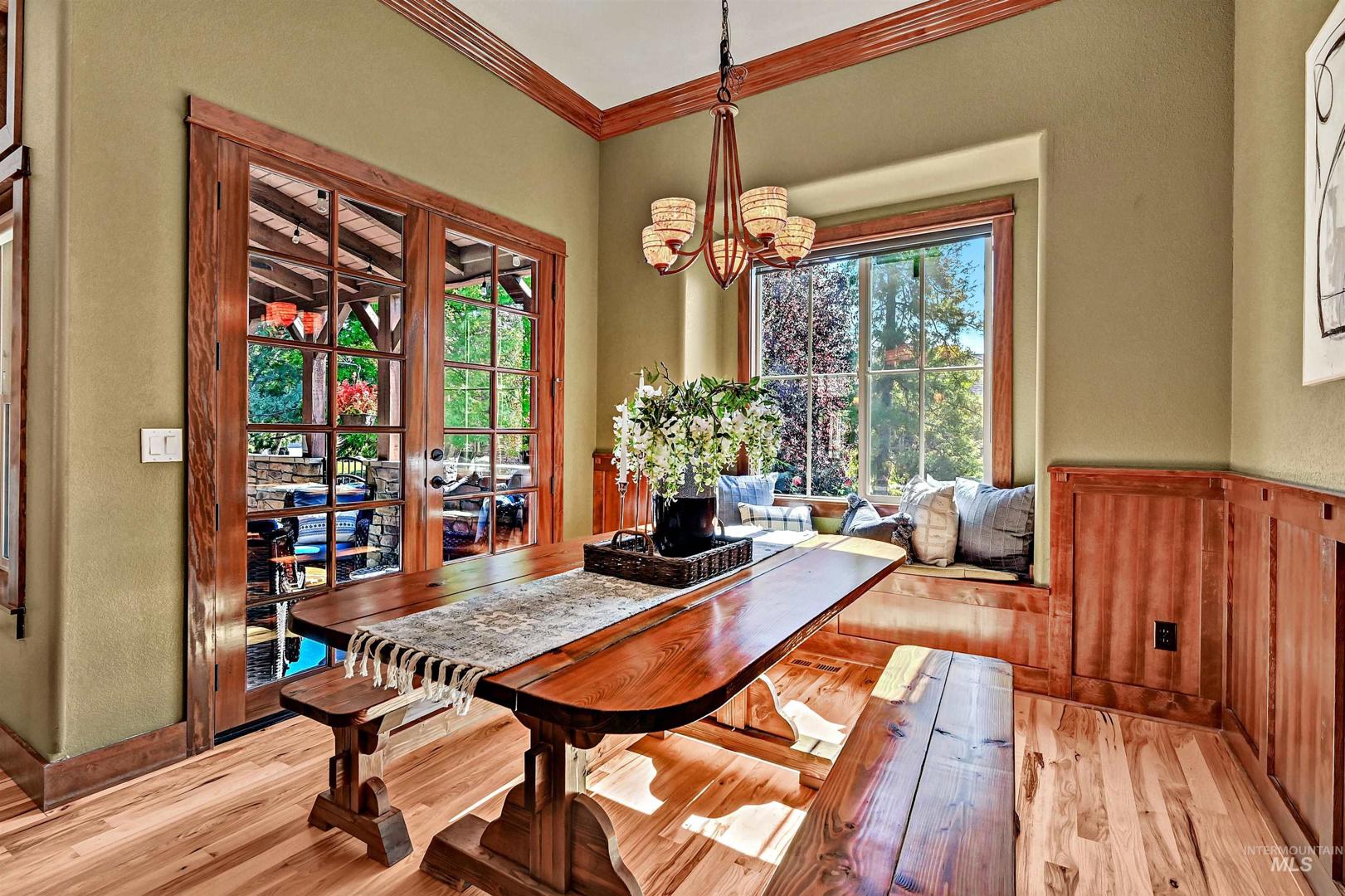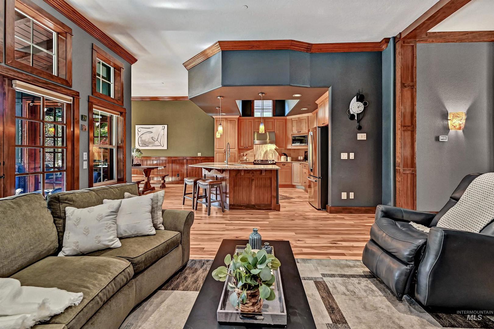 A stunning townhome built by Roth Homes perfectly situated near the Boise River and lush greenbelt, creating a serene, private retreat that feels worlds away yet just moments from city conveniences. This nature-inspired, rustic-modern haven boasts mature landscaping and tranquil pond views that evoke a true outdoor oasis. Inside, refined elegance fills every room with rich wood accents, stone details, and beautiful newly-refinished hardwood floors. Entertain on the covered terrace featuring a cozy built-in fireplace and BBQ grill or unwind in the private front courtyard. A gourmet kitchen features a large center island with slab granite and custom cabinets while the office and primary suite feature French doors opening to the peaceful courtyard. The recently renovated primary bath is a spa-like escape with crisp quartz countertops, new tile flooring and shower. This exceptional home blends breathtaking natural beauty with everyday convenience blending a perfect escape and sophisticated living.