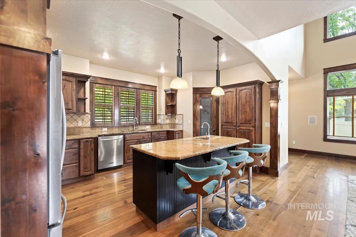 Classical elegance & warmth brought to you by the wood floors, trim & cabinetry throughout; custom & quality with no detail missed. Upon entry you are greeted with a vast open space with large windows & loft above. Large master bedroom with true separate vanities, large corner soaker tub & two closets so everyone can freely get ready for the day at the same time. Jack & Jill bathroom upstairs with laundry chute to the spacious utility room on the main floor. The kitchen is perfectly designed for function & placed for the ability to be apart of the party if hosting, with a 2nd sink in the luxurious island. Pantry & cabinets are detailed w/ pull out spice rack & other quaint details not overlooked. Family room (upstairs), great room & formal dining have the added touch with a dual side fireplace & built in speakers for your audio needs. Two backyard patio spaces, one off the master for your own peaceful moment & the other with a bar for good memories to be made. Truly different than others on the market with lots of little detailed desires for one to want to call it home. This home truly vibes comfort & must be walked to fully appreciate.