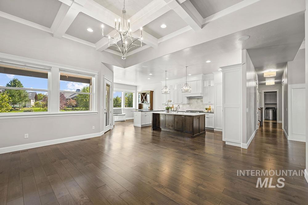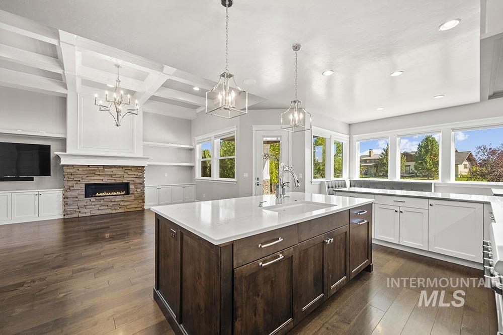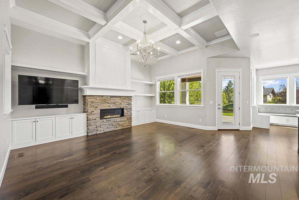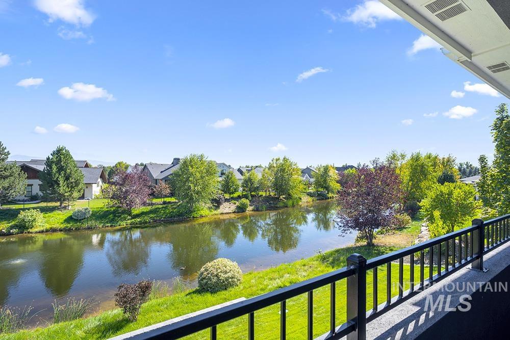 Waterfront luxury in Eagle’s premier Mace River Ranch! This immaculate, like-new residence offers quality finishes, comfortable elegance, and an unbeatable setting along glistening waters. Enjoy endless miles of the Boise River & Greenbelt trails, community pool & clubhouse, and friendly neighborhood gatherings—all minutes from downtown Eagle’s dining, shopping, & attractions. The home’s stone exterior, peaked rooflines, and strong columned details create timeless curb appeal, enhanced by a side-entry garage. Inside, engineered hardwoods lead to the great room where box-beamed ceilings, crown moldings, custom millwork, and expansive windows frame serene water views. A stone fireplace anchors the space, open to the gourmet kitchen with white cabinetry, warm wood island, quartz countertops, high-end appliances, marble backsplash, and walk-in pantry. Dining room with built-in seating overlooks the water. Main-level primary suite features spa-inspired bath with soaking tub, dual vanities, walk-in shower, and custom closet with pass-through to laundry. Dedicated office, guest room, and upstairs bonus with 2 bedrooms/baths plus balcony for sunset views. Covered patio & balcony with wood-clad ceilings complete this picturesque waterfront retreat.
