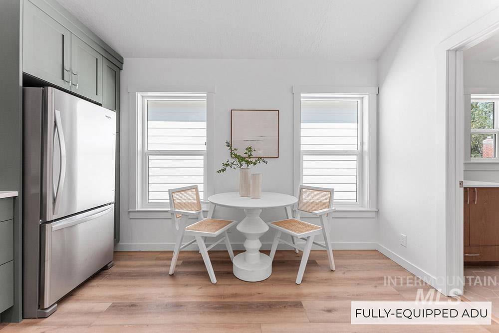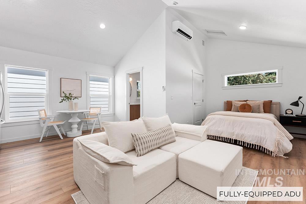 A unique opportunity to own brand-new construction with a registered ADU in the heart of Northwest Boise. Located in the premier Langara Park community, this home offers a low-maintenance, lock-and-leave lifestyle with the added benefit of flexible living or rental income potential. Built by Iron Haven Homes, the interior is thoughtfully designed with wide-plank wood floors, upscale designer finishes, and superior craftsmanship throughout. The main level features an open-concept great room and a beautifully appointed kitchen with a large island, quartz countertops, custom cabinetry, tile backsplash, stainless steel appliances, and a spacious walk-in pantry. The primary suite offers a private retreat with dual vanities, elegant tile flooring, and a large walk-in closet. Adding to the home’s unique appeal is a fully-equipped ADU, ideal for income generation, multi-generational living, or use as a detached office or creative studio. The HOA takes care of yard maintenance, allowing for truly effortless living.