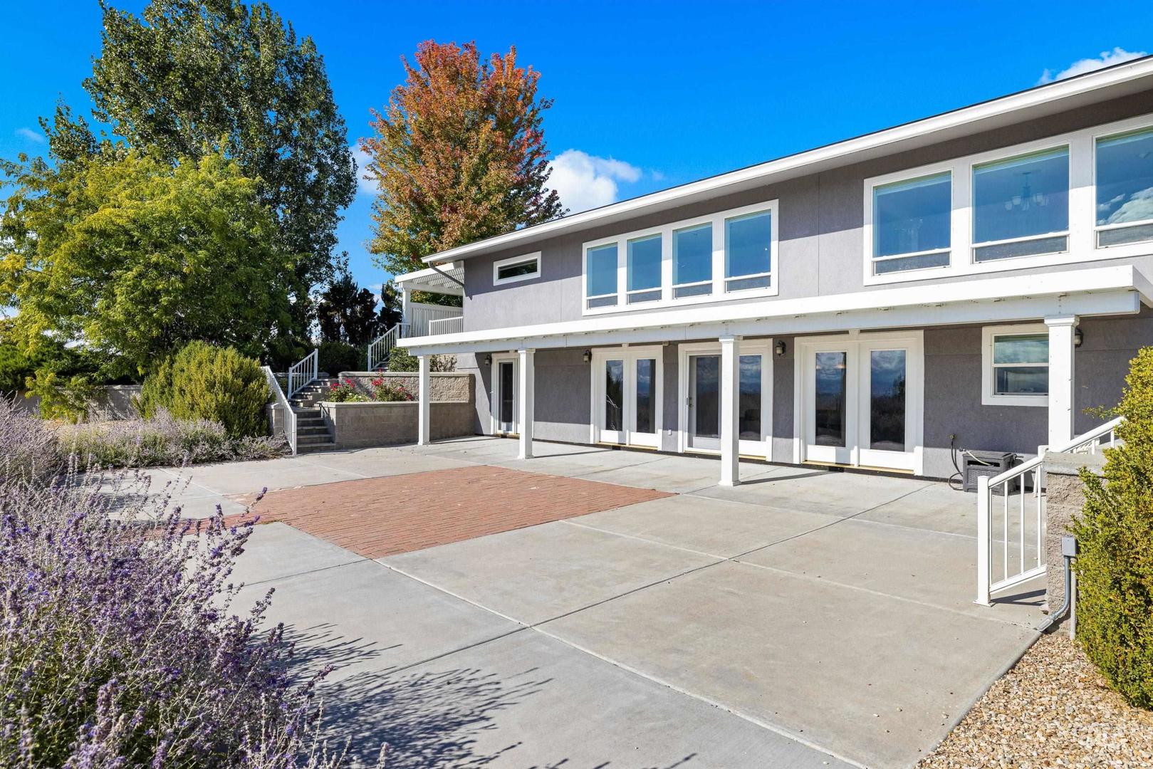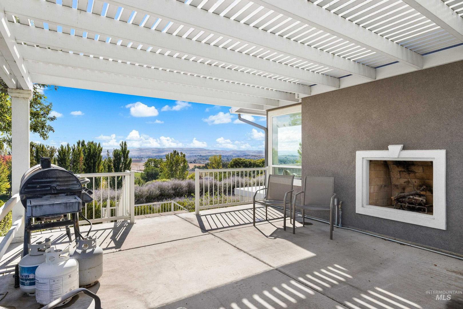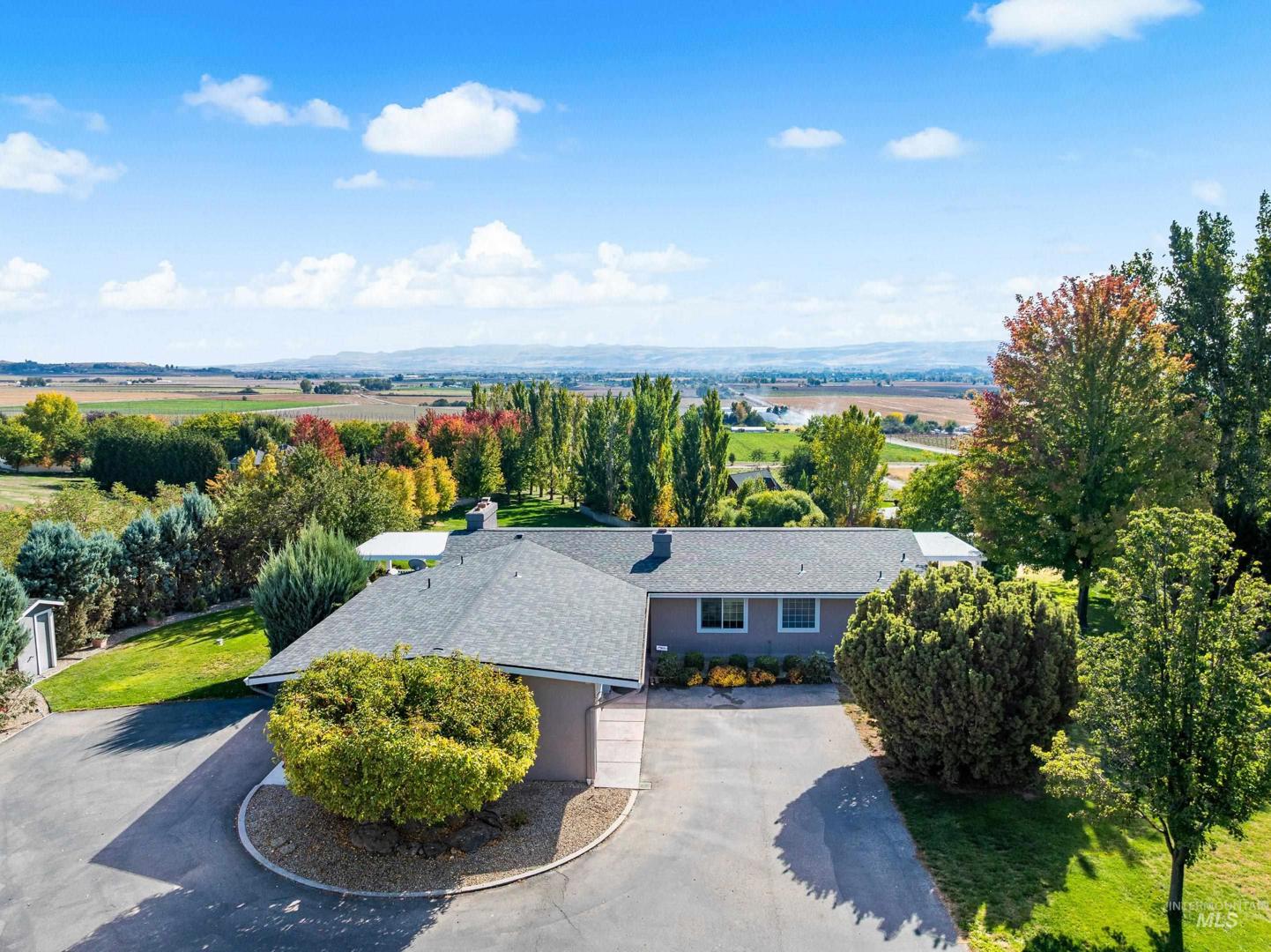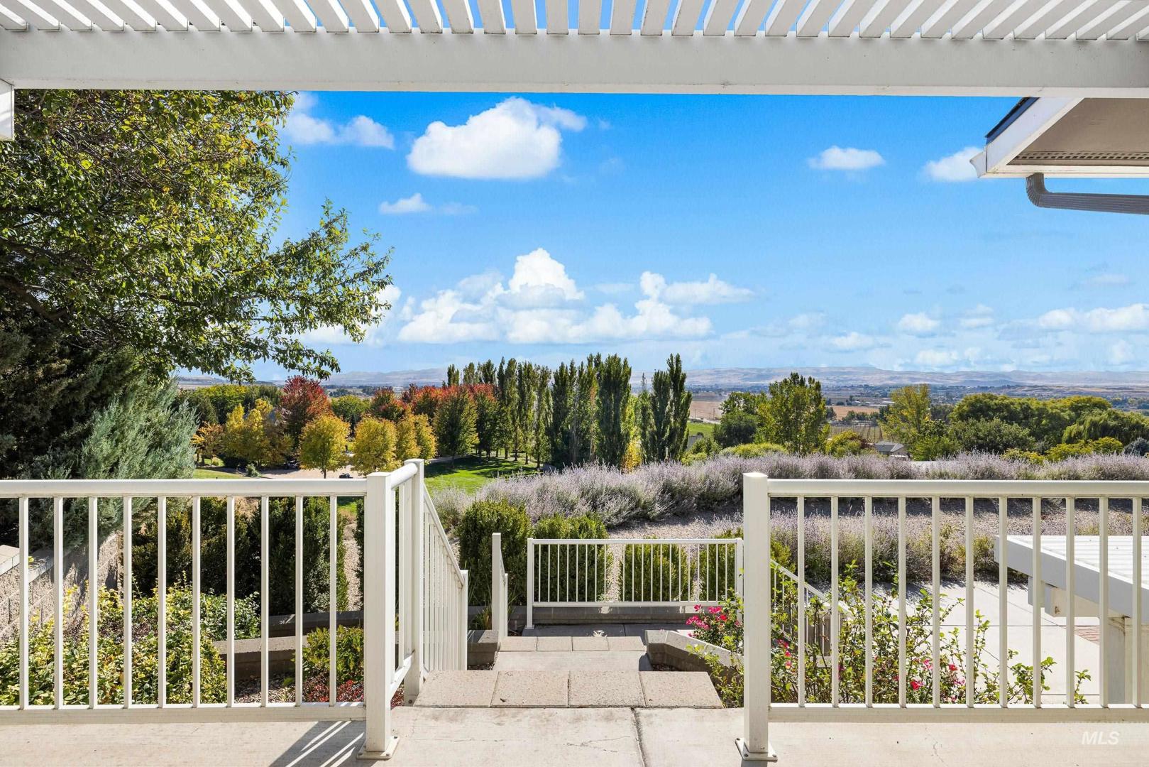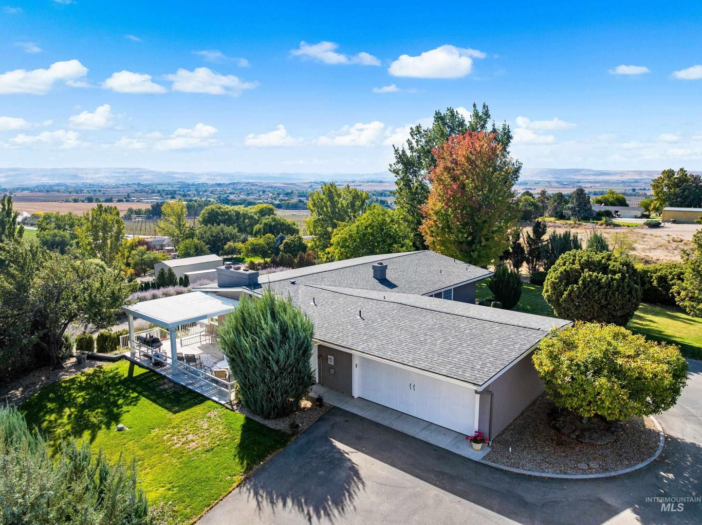 Don’t miss this rare opportunity to own a beautifully maintained home with breathtaking views from nearly every room. The spacious living room welcomes you with large windows that frame views of the Owyhee Mountains. The kitchen features ample cabinet space, built-in spice racks, pantry, solid-surface counters, gas cooktop, and built-in oven/microwave. A dual-sided fireplace connects the kitchen/dining area to the east-facing patio—perfect for entertaining or quiet mornings. The main-level owner`s suite offers his & hers closets, a private west-facing patio, and a luxurious ensuite with jacuzzi tub and walk-in shower. The office features glass doors and inspiring views. The daylight walkout basement includes a full kitchenette, living space, 3 large bedrooms, Jack & Jill bath, storage, and mechanical room—ideal for guests or multi-generational living. Outside, enjoy a 33’x22’ converted barn/shop with power, an attached 2-car garage with drive-through doors, plus a detached 2-car garage with RV 220 hookup and small shop.