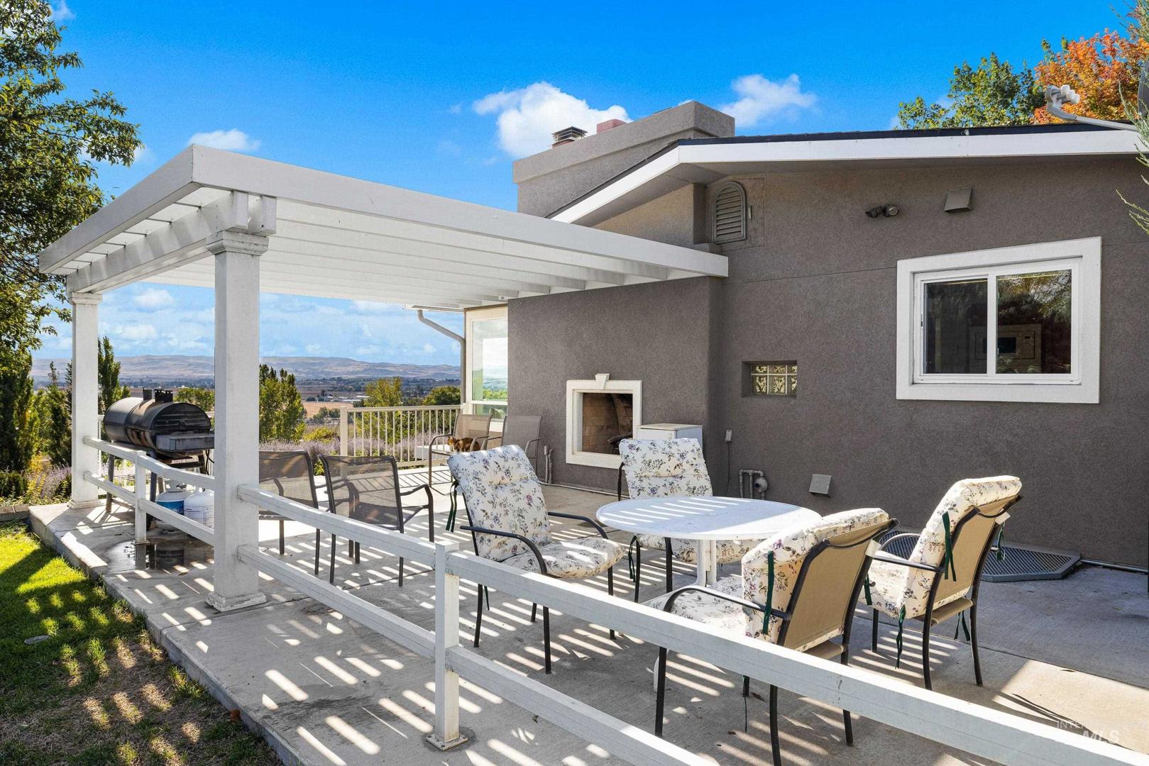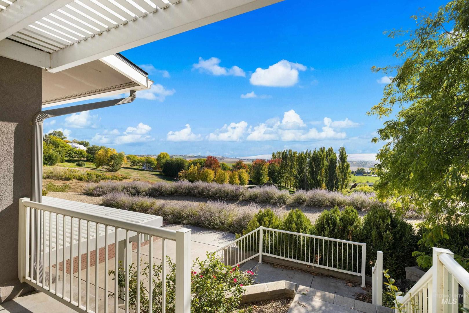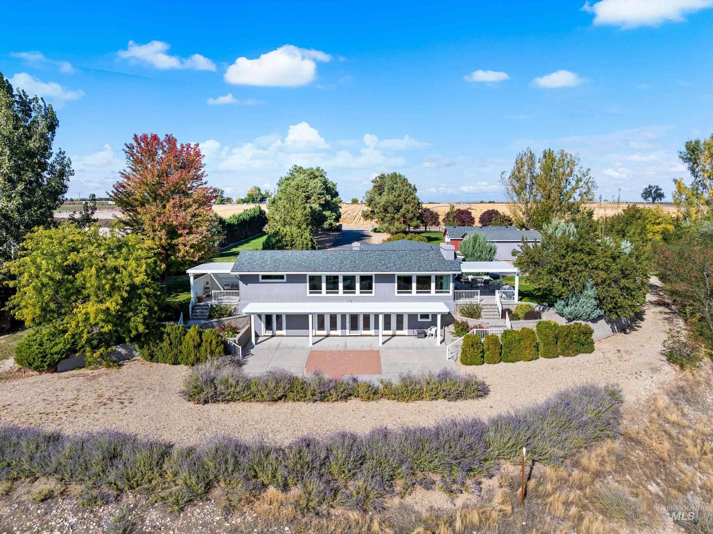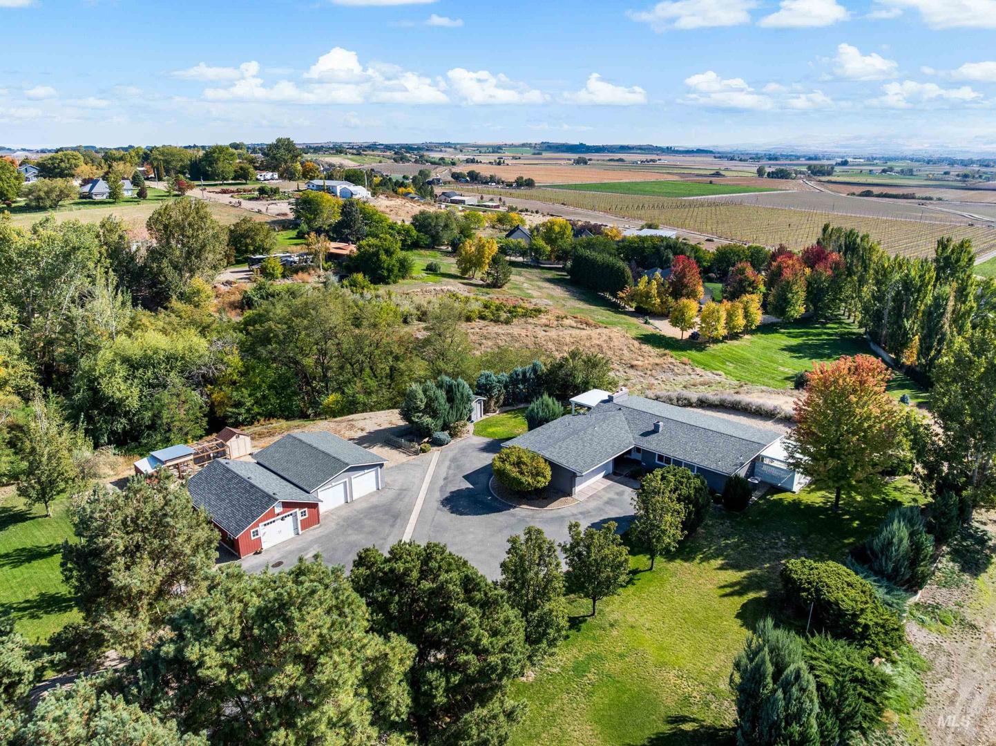Don’t miss this rare opportunity to own a beautifully maintained home with breathtaking views from nearly every room. The spacious living room welcomes you with large windows that frame views of the Owyhee Mountains. The kitchen features ample cabinet space, built-in spice racks, pantry, solid-surface counters, gas cooktop, and built-in oven/microwave. A dual-sided fireplace connects the kitchen/dining area to the east-facing patio—perfect for entertaining or quiet mornings. The main-level owner`s suite offers his & hers closets, a private west-facing patio, and a luxurious ensuite with jacuzzi tub and walk-in shower. The office features glass doors and inspiring views. The daylight walkout basement includes a full kitchenette, living space, 3 large bedrooms, Jack & Jill bath, storage, and mechanical room—ideal for guests or multi-generational living. Outside, enjoy a 33’x22’ converted barn/shop with power, an attached 2-car garage with drive-through doors, plus a detached 2-car garage with RV 220 hookup and small shop.