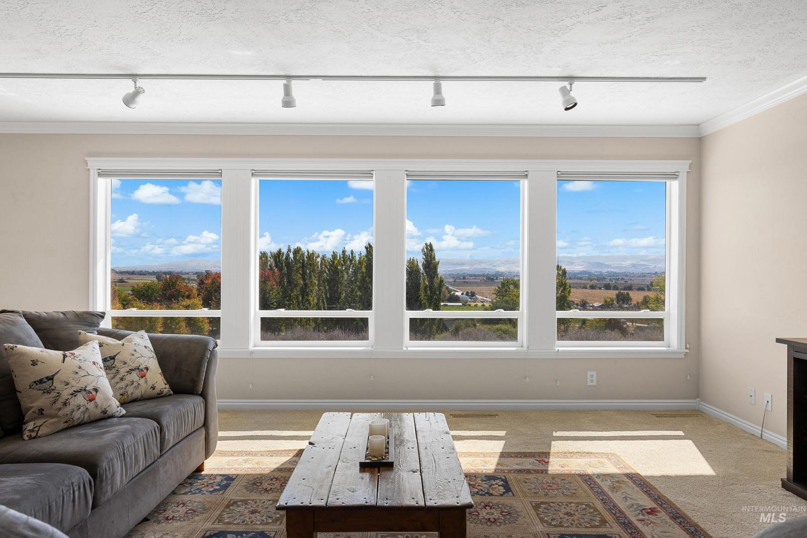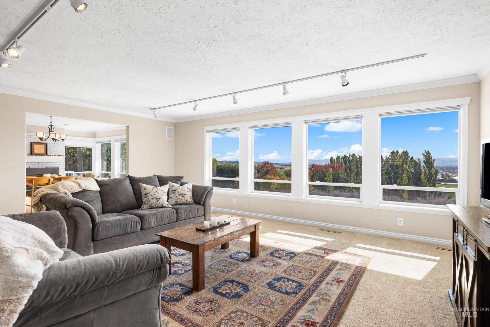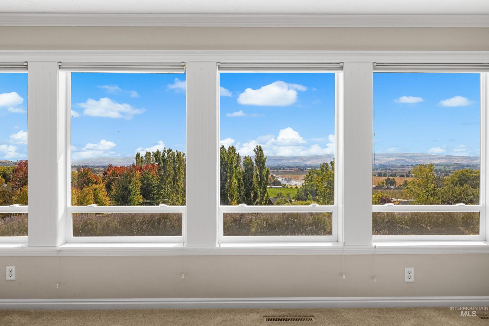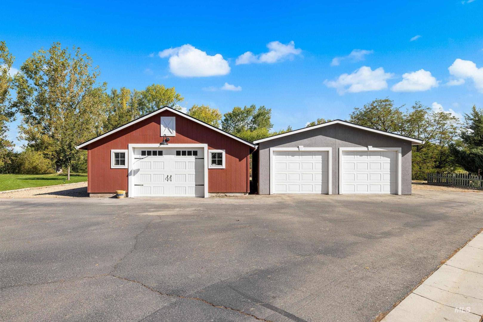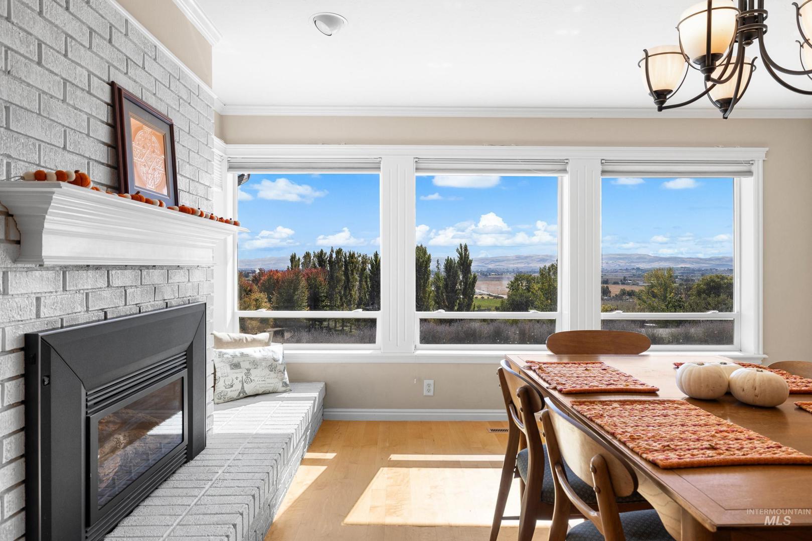 Don’t miss this rare opportunity to own a beautifully maintained home with breathtaking views from nearly every room. The spacious living room welcomes you with large windows that frame views of the Owyhee Mountains. The kitchen features ample cabinet space, built-in spice racks, pantry, solid-surface counters, gas cooktop, and built-in oven/microwave. A dual-sided fireplace connects the kitchen/dining area to the east-facing patio—perfect for entertaining or quiet mornings. The main-level owner`s suite offers his & hers closets, a private west-facing patio, and a luxurious ensuite with jacuzzi tub and walk-in shower. The office features glass doors and inspiring views. The daylight walkout basement includes a full kitchenette, living space, 3 large bedrooms, Jack & Jill bath, storage, and mechanical room—ideal for guests or multi-generational living. Outside, enjoy a 33’x22’ converted barn/shop with power, an attached 2-car garage with drive-through doors, plus a detached 2-car garage with RV 220 hookup and small shop.