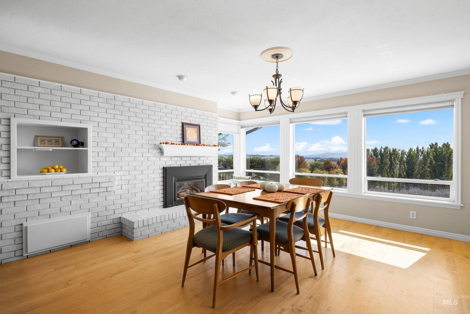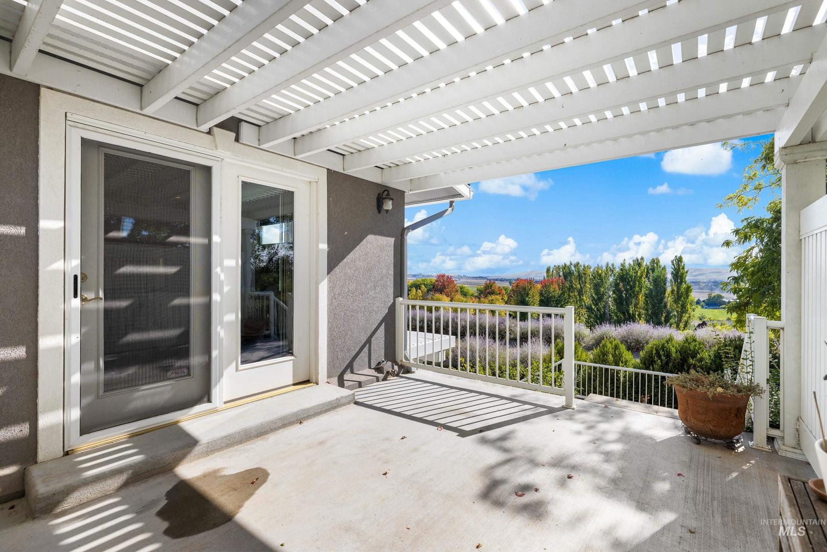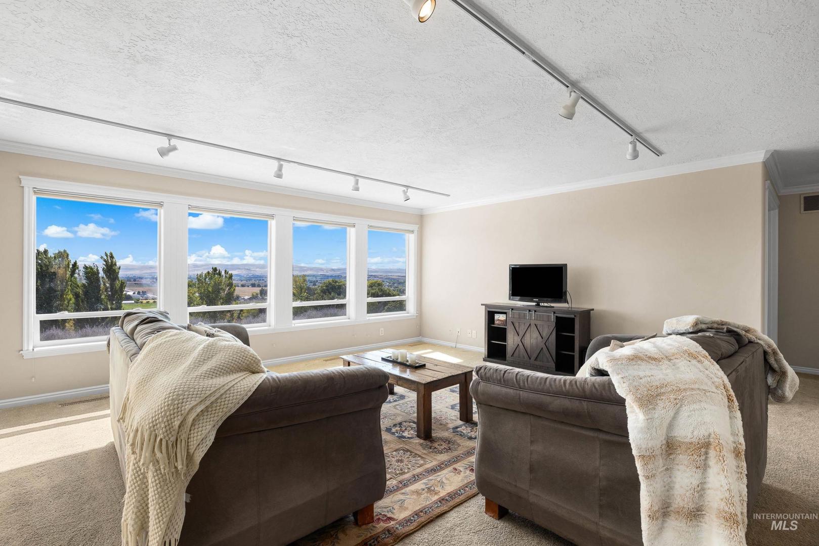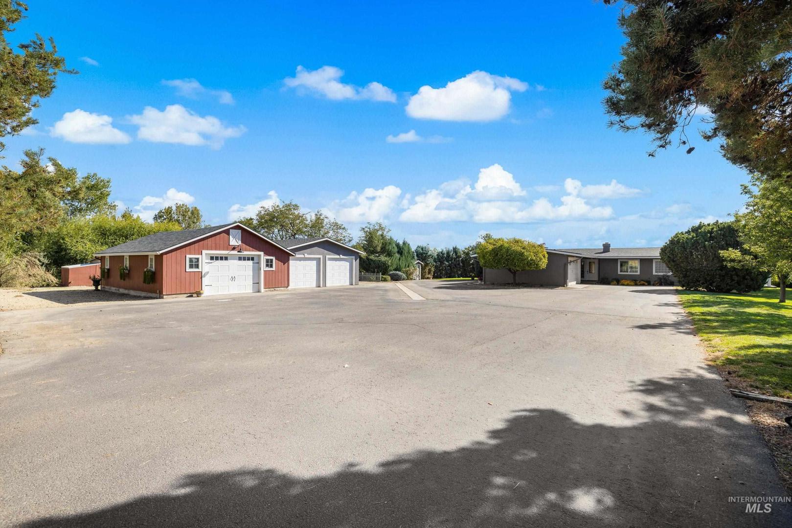 Don’t miss this rare opportunity to own a beautifully maintained home with breathtaking views from nearly every room. The spacious living room welcomes you with large windows that frame views of the Owyhee Mountains. The kitchen features ample cabinet space, built-in spice racks, pantry, solid-surface counters, gas cooktop, and built-in oven/microwave. A dual-sided fireplace connects the kitchen/dining area to the east-facing patio—perfect for entertaining or quiet mornings. The main-level owner`s suite offers his & hers closets, a private west-facing patio, and a luxurious ensuite with jacuzzi tub and walk-in shower. The office features glass doors and inspiring views. The daylight walkout basement includes a full kitchenette, living space, 3 large bedrooms, Jack & Jill bath, storage, and mechanical room—ideal for guests or multi-generational living. Outside, enjoy a 33’x22’ converted barn/shop with power, an attached 2-car garage with drive-through doors, plus a detached 2-car garage with RV 220 hookup and small shop.
