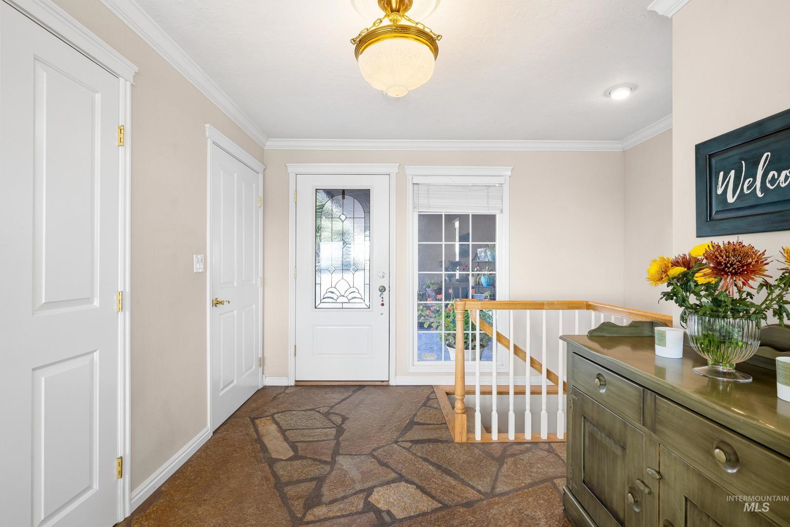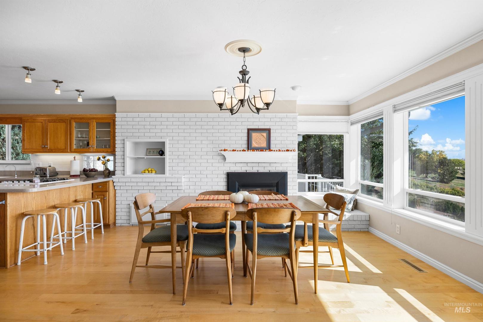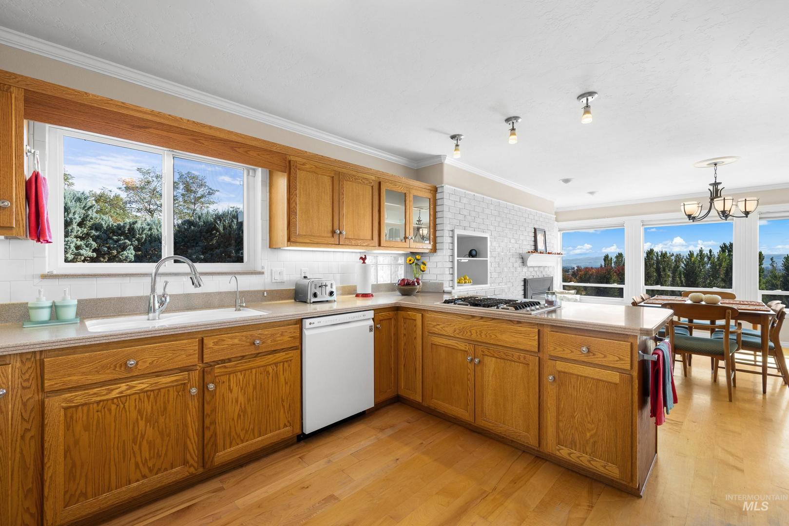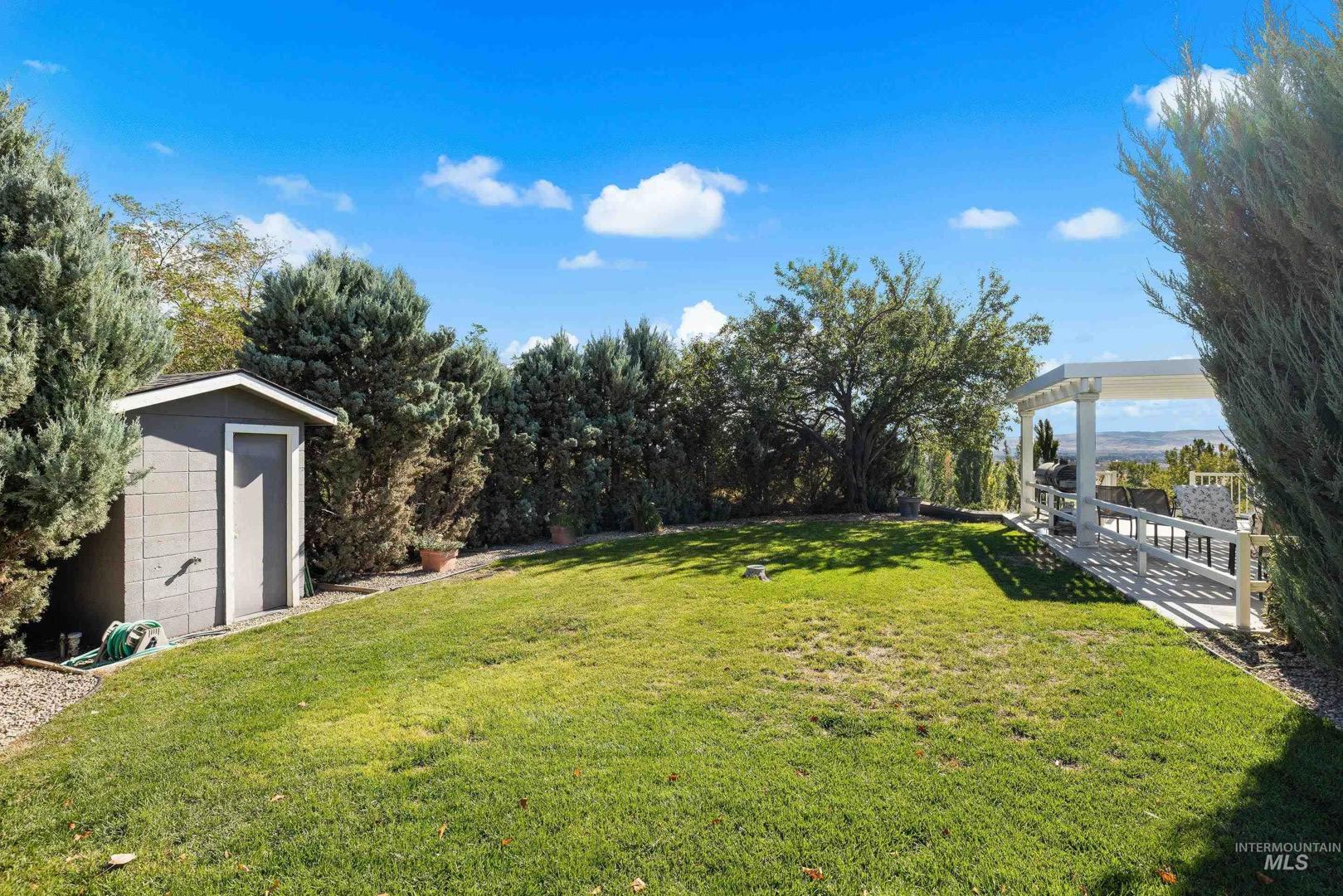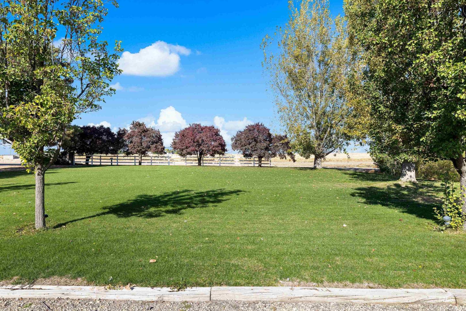Don’t miss this rare opportunity to own a beautifully maintained home with breathtaking views from nearly every room. The spacious living room welcomes you with large windows that frame views of the Owyhee Mountains. The kitchen features ample cabinet space, built-in spice racks, pantry, solid-surface counters, gas cooktop, and built-in oven/microwave. A dual-sided fireplace connects the kitchen/dining area to the east-facing patio—perfect for entertaining or quiet mornings. The main-level owner`s suite offers his & hers closets, a private west-facing patio, and a luxurious ensuite with jacuzzi tub and walk-in shower. The office features glass doors and inspiring views. The daylight walkout basement includes a full kitchenette, living space, 3 large bedrooms, Jack & Jill bath, storage, and mechanical room—ideal for guests or multi-generational living. Outside, enjoy a 33’x22’ converted barn/shop with power, an attached 2-car garage with drive-through doors, plus a detached 2-car garage with RV 220 hookup and small shop.