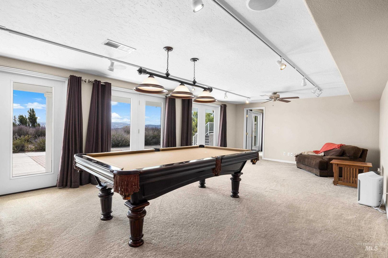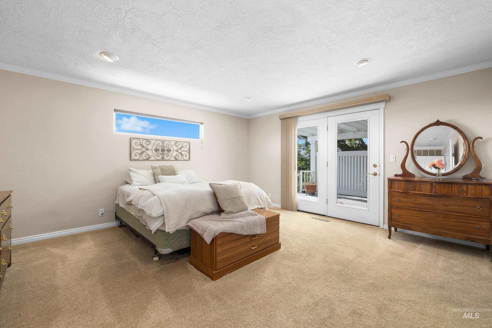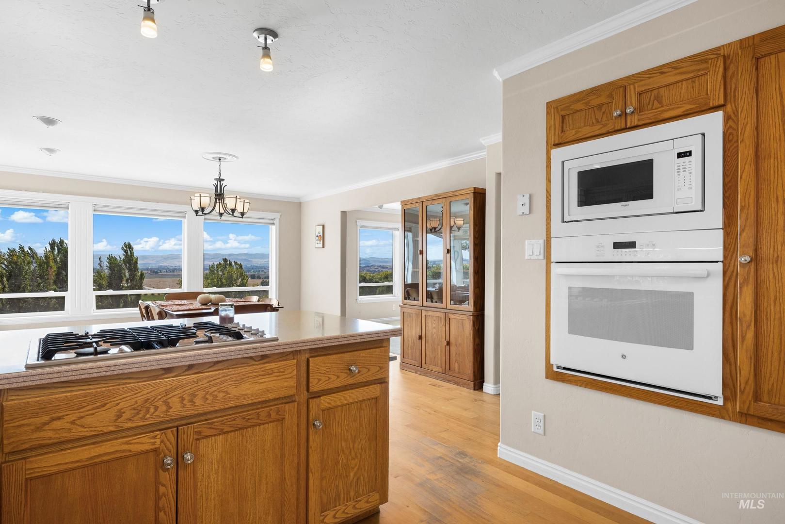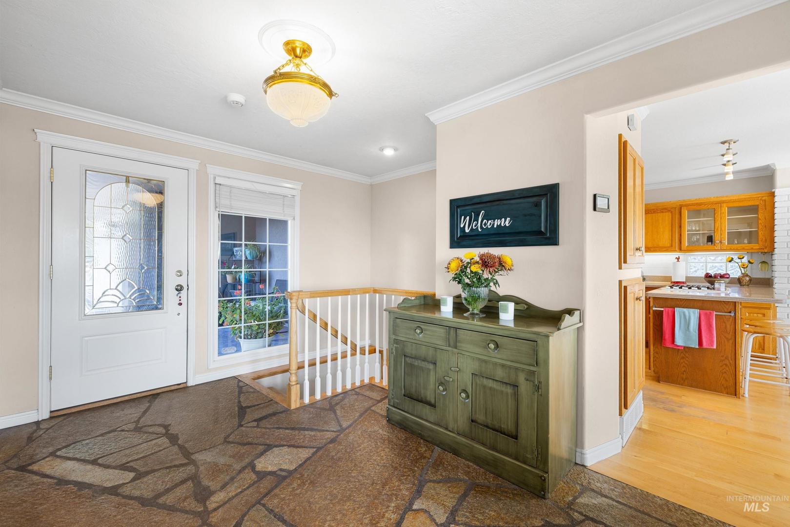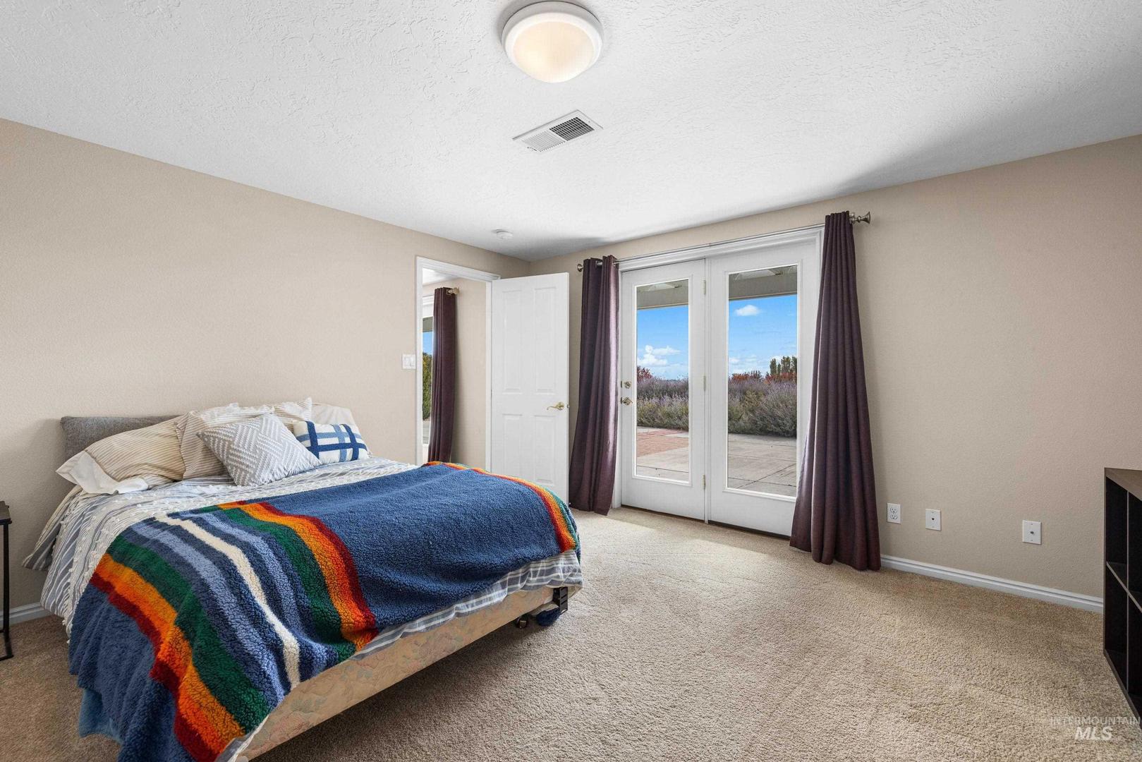 Don’t miss this rare opportunity to own a beautifully maintained home with breathtaking views from nearly every room. The spacious living room welcomes you with large windows that frame views of the Owyhee Mountains. The kitchen features ample cabinet space, built-in spice racks, pantry, solid-surface counters, gas cooktop, and built-in oven/microwave. A dual-sided fireplace connects the kitchen/dining area to the east-facing patio—perfect for entertaining or quiet mornings. The main-level owner`s suite offers his & hers closets, a private west-facing patio, and a luxurious ensuite with jacuzzi tub and walk-in shower. The office features glass doors and inspiring views. The daylight walkout basement includes a full kitchenette, living space, 3 large bedrooms, Jack & Jill bath, storage, and mechanical room—ideal for guests or multi-generational living. Outside, enjoy a 33’x22’ converted barn/shop with power, an attached 2-car garage with drive-through doors, plus a detached 2-car garage with RV 220 hookup and small shop.