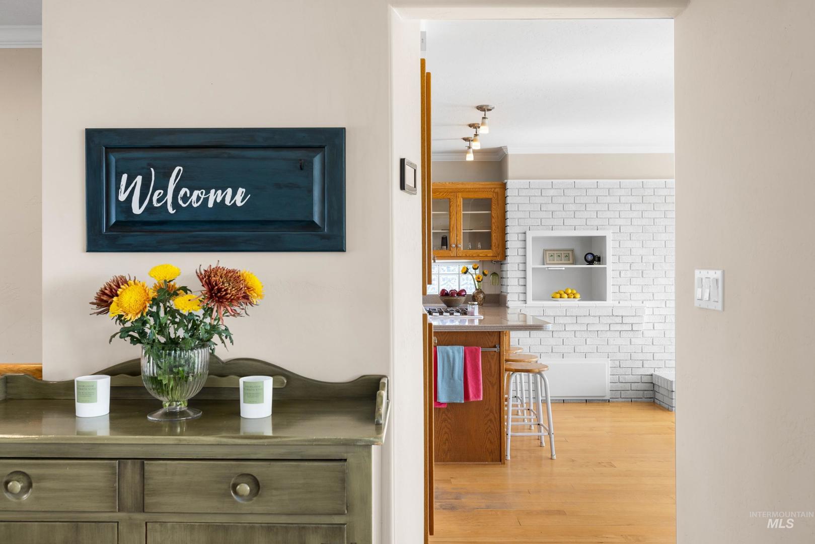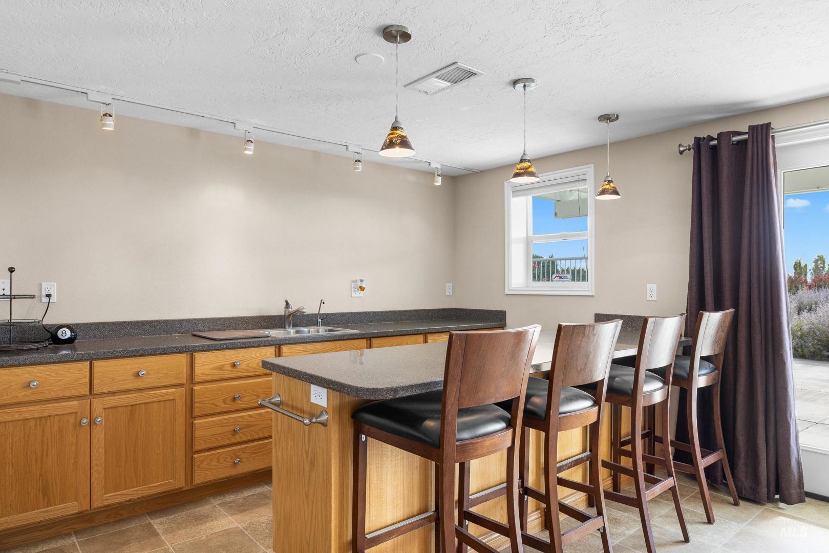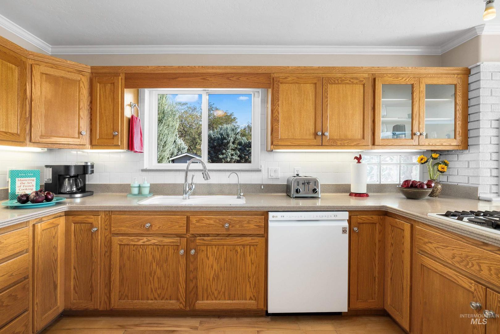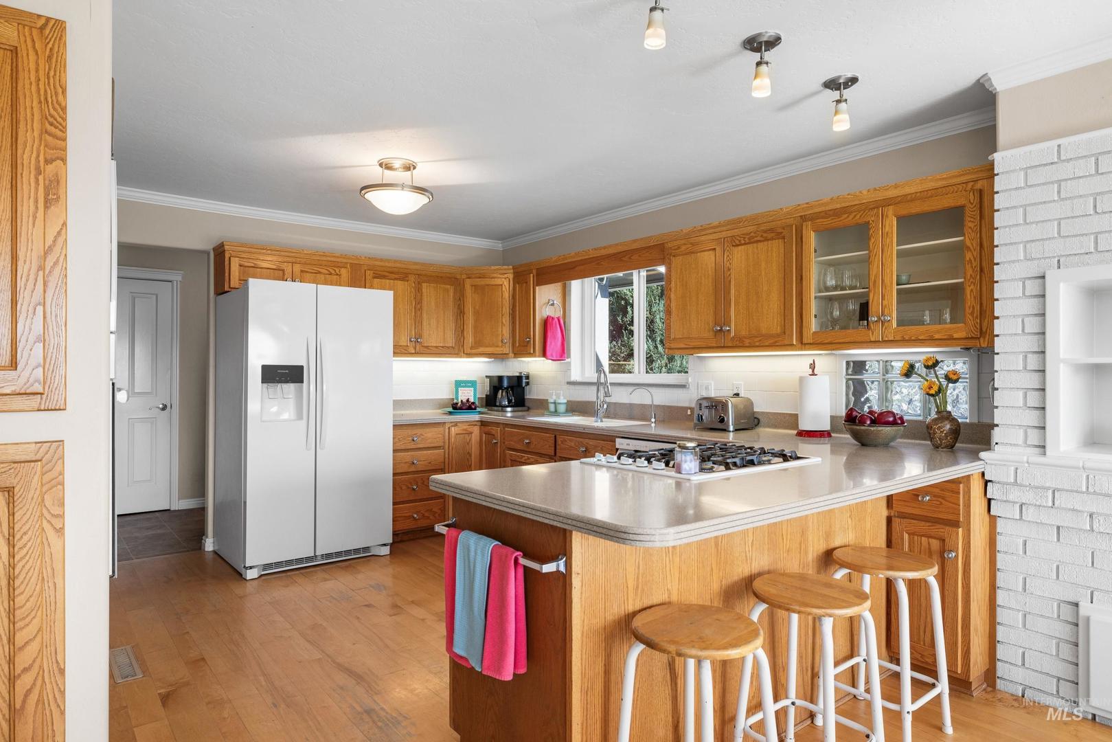 Don’t miss this rare opportunity to own a beautifully maintained home with breathtaking views from nearly every room. The spacious living room welcomes you with large windows that frame views of the Owyhee Mountains. The kitchen features ample cabinet space, built-in spice racks, pantry, solid-surface counters, gas cooktop, and built-in oven/microwave. A dual-sided fireplace connects the kitchen/dining area to the east-facing patio—perfect for entertaining or quiet mornings. The main-level owner`s suite offers his & hers closets, a private west-facing patio, and a luxurious ensuite with jacuzzi tub and walk-in shower. The office features glass doors and inspiring views. The daylight walkout basement includes a full kitchenette, living space, 3 large bedrooms, Jack & Jill bath, storage, and mechanical room—ideal for guests or multi-generational living. Outside, enjoy a 33’x22’ converted barn/shop with power, an attached 2-car garage with drive-through doors, plus a detached 2-car garage with RV 220 hookup and small shop.