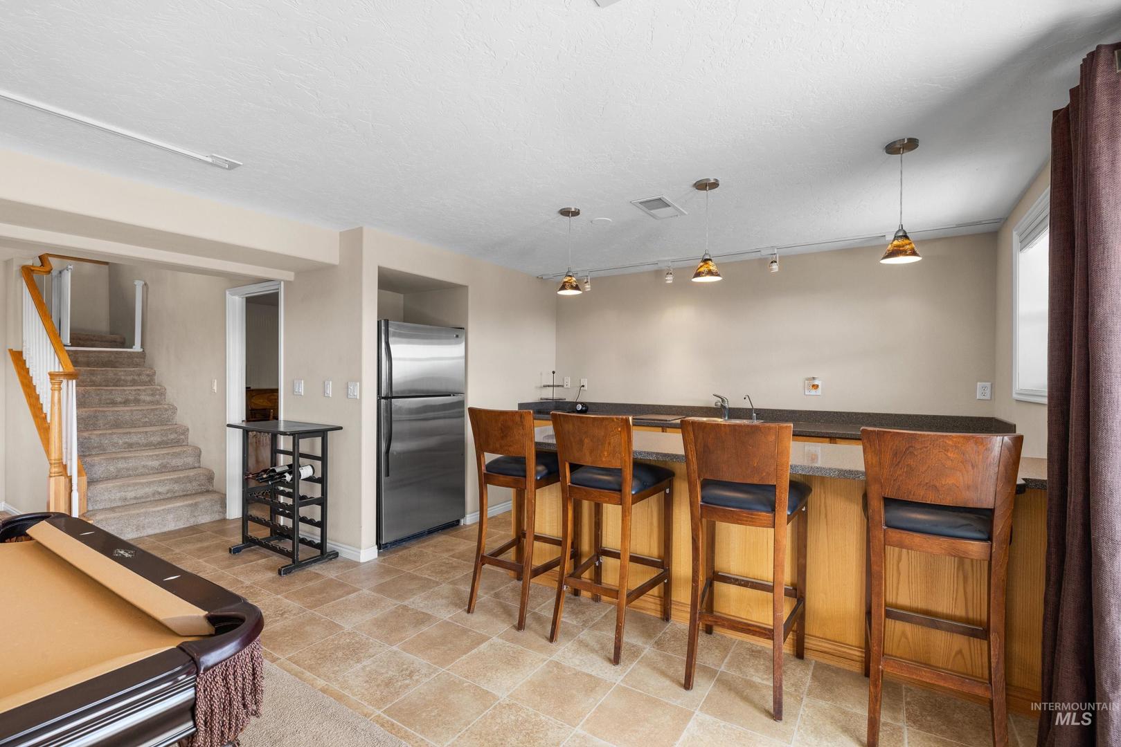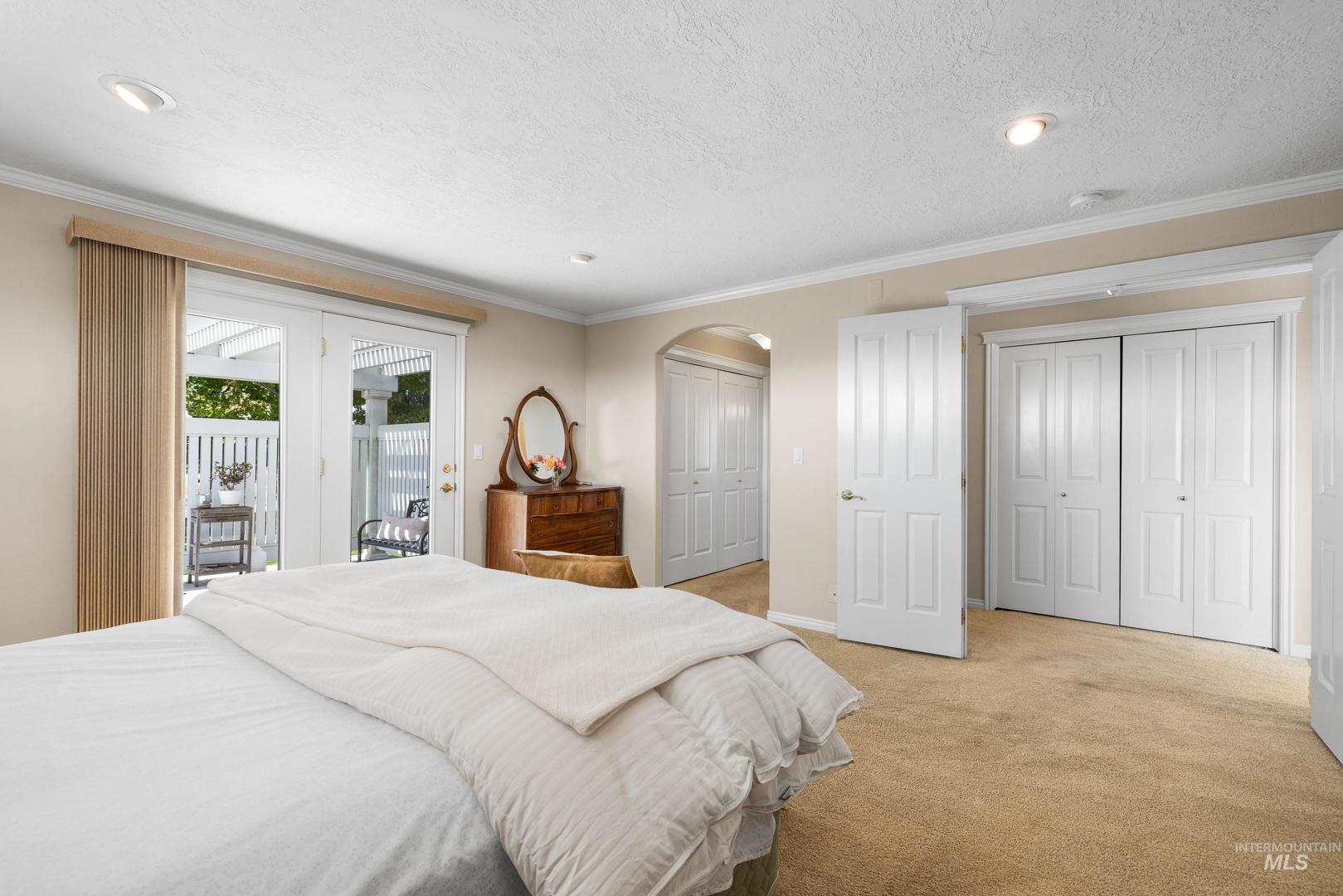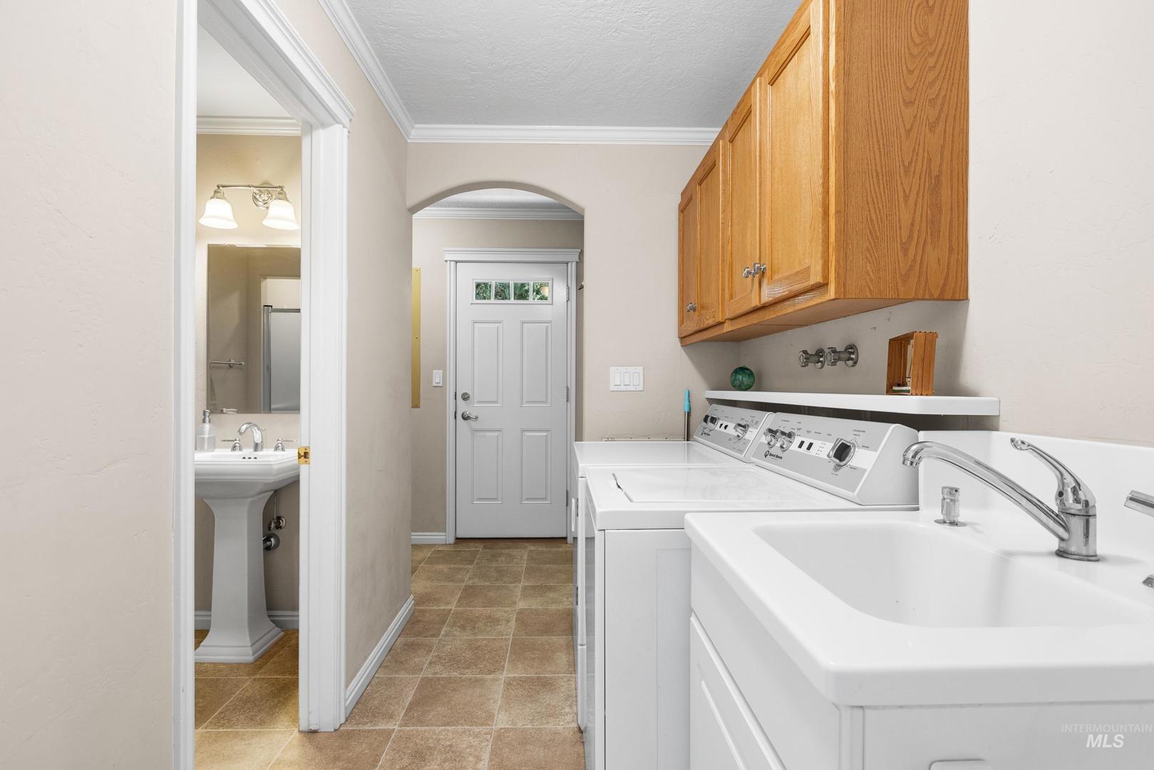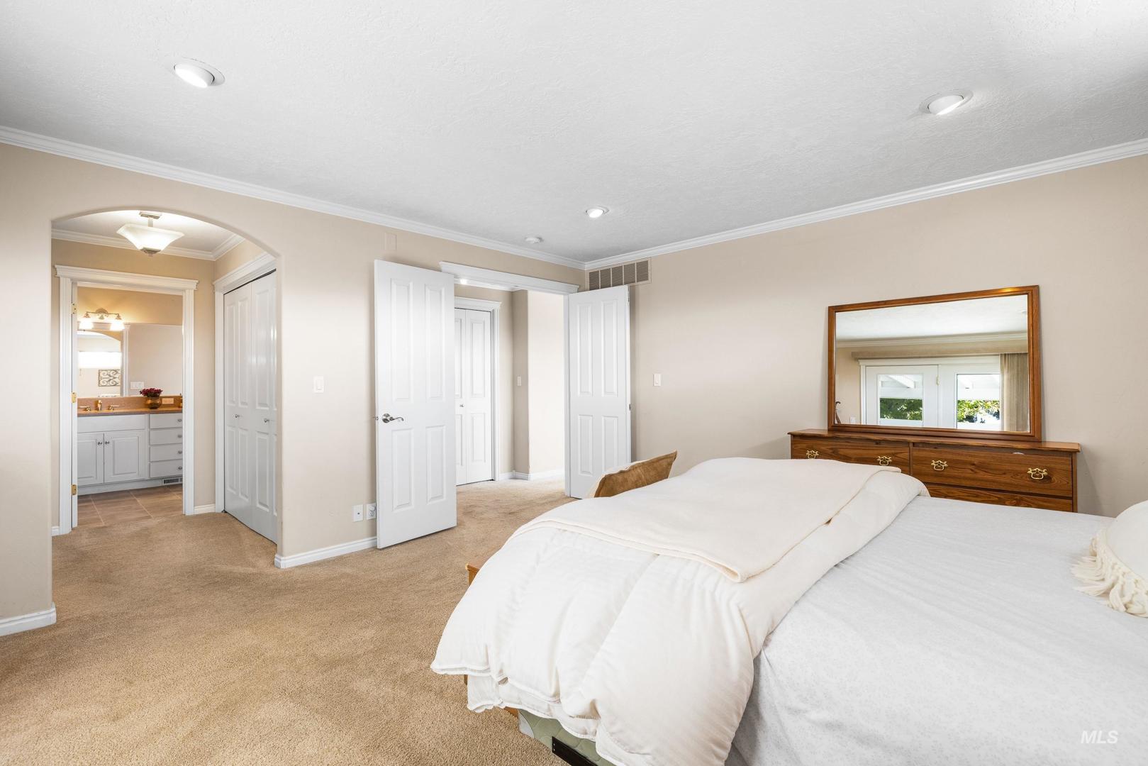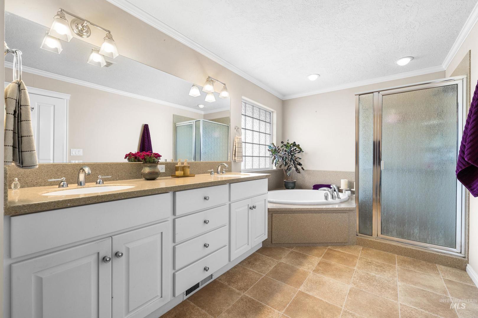 Don’t miss this rare opportunity to own a beautifully maintained home with breathtaking views from nearly every room. The spacious living room welcomes you with large windows that frame views of the Owyhee Mountains. The kitchen features ample cabinet space, built-in spice racks, pantry, solid-surface counters, gas cooktop, and built-in oven/microwave. A dual-sided fireplace connects the kitchen/dining area to the east-facing patio—perfect for entertaining or quiet mornings. The main-level owner`s suite offers his & hers closets, a private west-facing patio, and a luxurious ensuite with jacuzzi tub and walk-in shower. The office features glass doors and inspiring views. The daylight walkout basement includes a full kitchenette, living space, 3 large bedrooms, Jack & Jill bath, storage, and mechanical room—ideal for guests or multi-generational living. Outside, enjoy a 33’x22’ converted barn/shop with power, an attached 2-car garage with drive-through doors, plus a detached 2-car garage with RV 220 hookup and small shop.