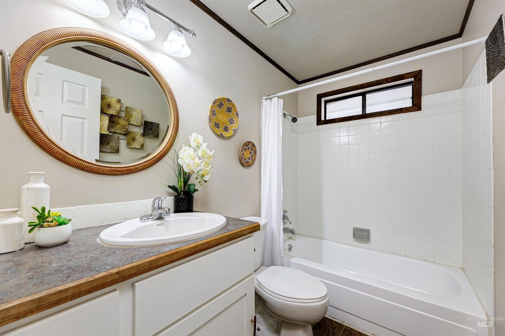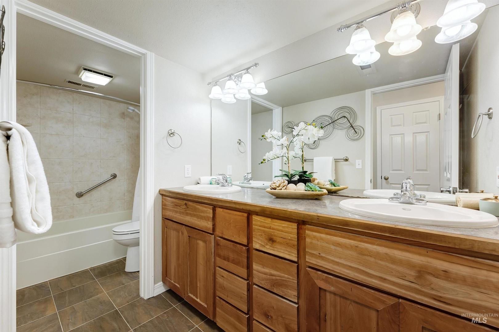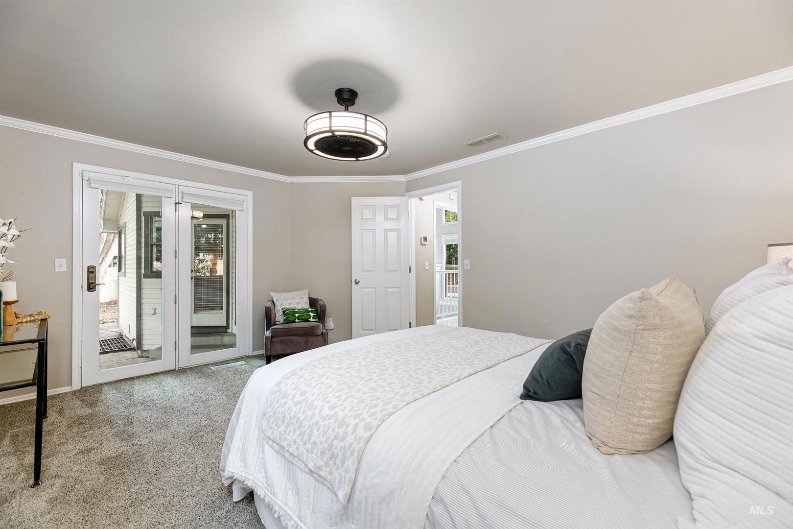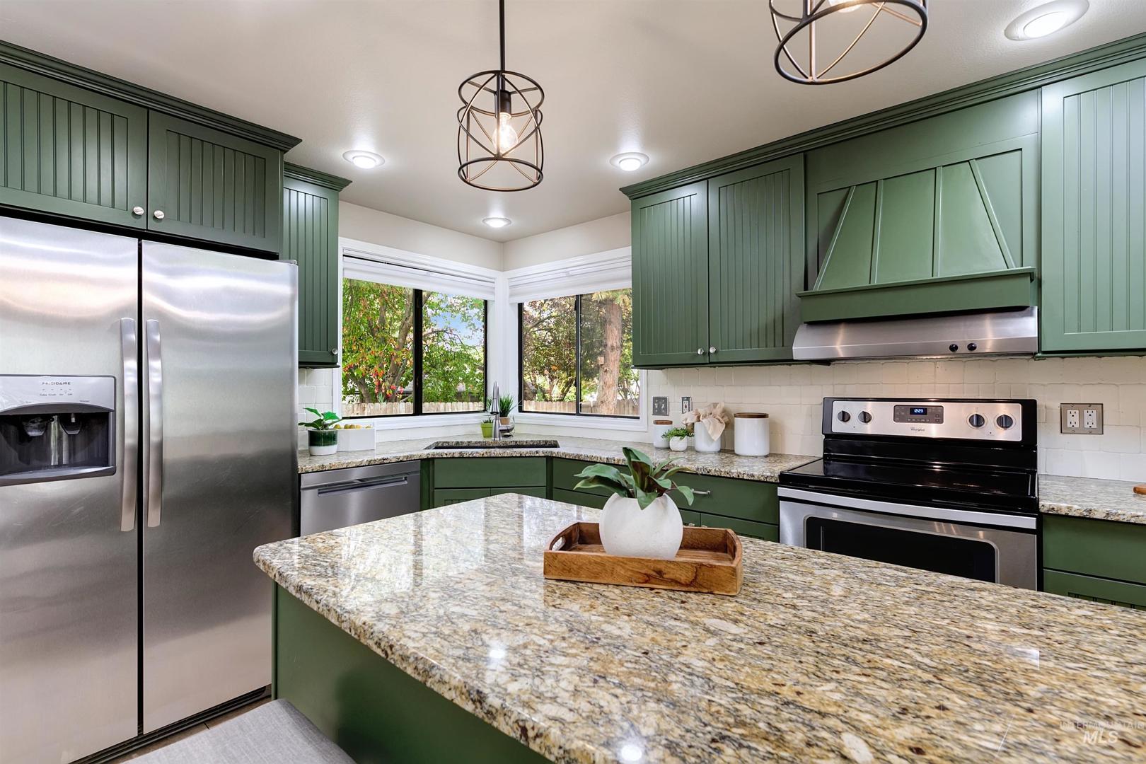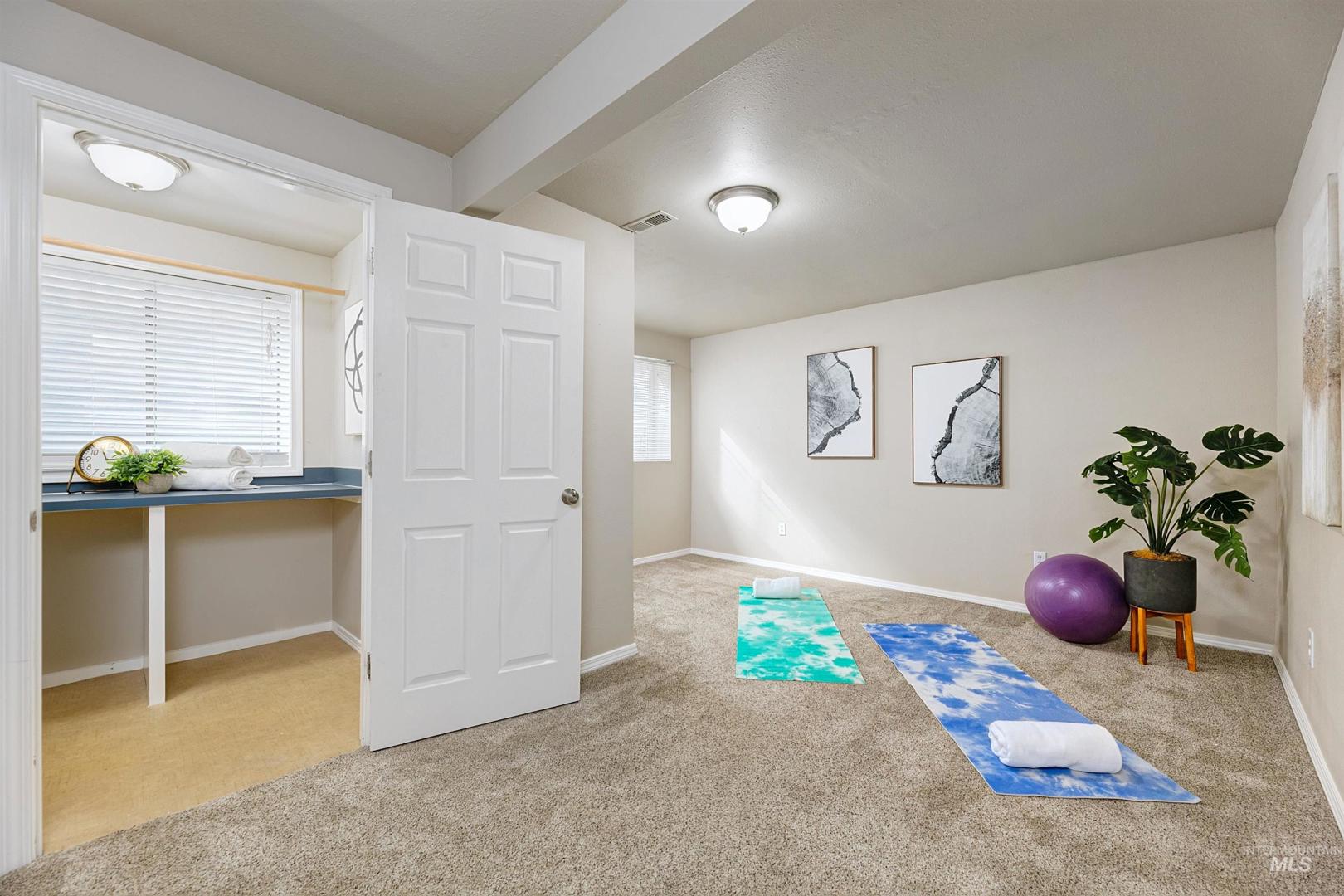 Tucked into a quiet, established neighborhood in the heart of Eagle, this thoughtfully updated home offers the perfect balance of comfort, space, and convenience. An open floor plan is filled with natural light from expansive windows, creating a bright and welcoming atmosphere throughout. The kitchen combines function and style with rich Thomasville cabinetry, granite countertops, stainless steel appliances, a wine cooler, and a spacious pantry. A cozy fireplace anchors the main living area, ideal for both relaxing and entertaining. The main-level primary suite features patio access, a walk-in closet, and dual vanities for added comfort. Downstairs, a second living space offers flexible options for a media room, guest quarters, or home office. Mature trees surround the backyard, providing a peaceful retreat. Located just minutes from downtown Eagle, Eagle Hills Golf Course, and local amenities. With no HOA fees, this home delivers value, everyday livability, and a prime location.