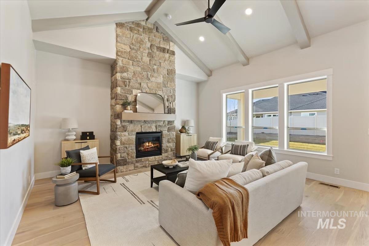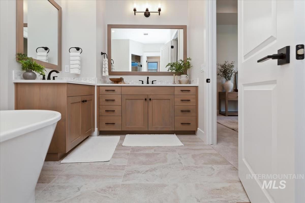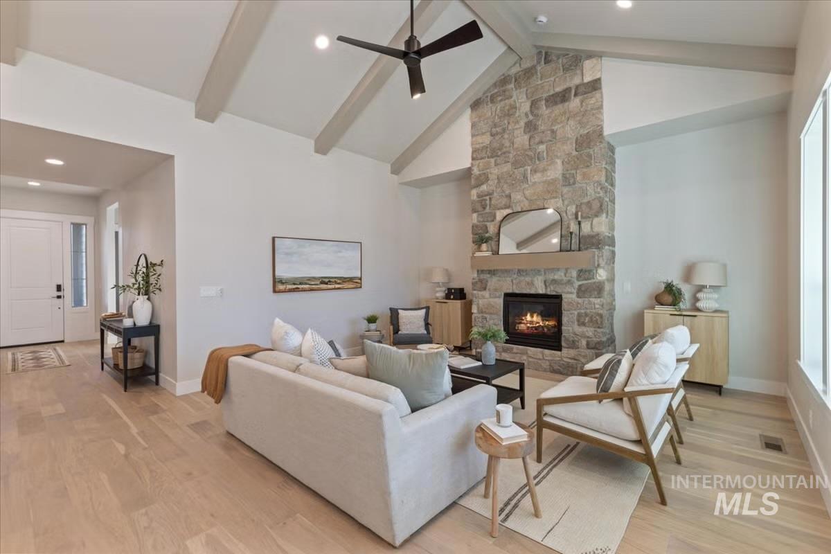 Tresidio Homes incredible Somerset plan awaits! This expansive home welcomes you with soaring ceilings, including a beautiful cathedral ceiling over the great room & kitchen. You`ll enjoy entertaining (and causing envy!) in your chef`s kitchen, complete with butler`s pantry, gorgeous Bosch appliances, cabinetry up to the ceiling with floating shelves, & beautiful marbled quartz countertops. Open to the kitchen, the great room is big enough for everyone, & features a striking center fireplace & Tresidio`s signature tray ceiling with beams. Your primary retreat is tucked behind the kitchen, & boasts a chic standalone soaking tub, classic tile from floor to ceiling, and rich wood cabinetry. No stone was left unturned in the designing of this home; you`ll love the full tile showers in both secondary bathrooms, striking farmhouse exterior, soaring fireplace stone, and mixed metal hardware, to name just a few! Nestled in peaceful Oakwood Estates in Meridian, there is no better place to call home. Photos Similar.