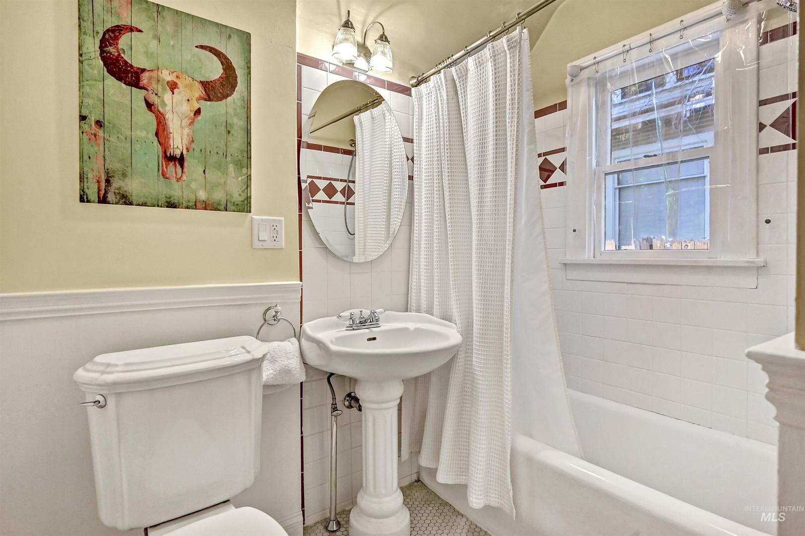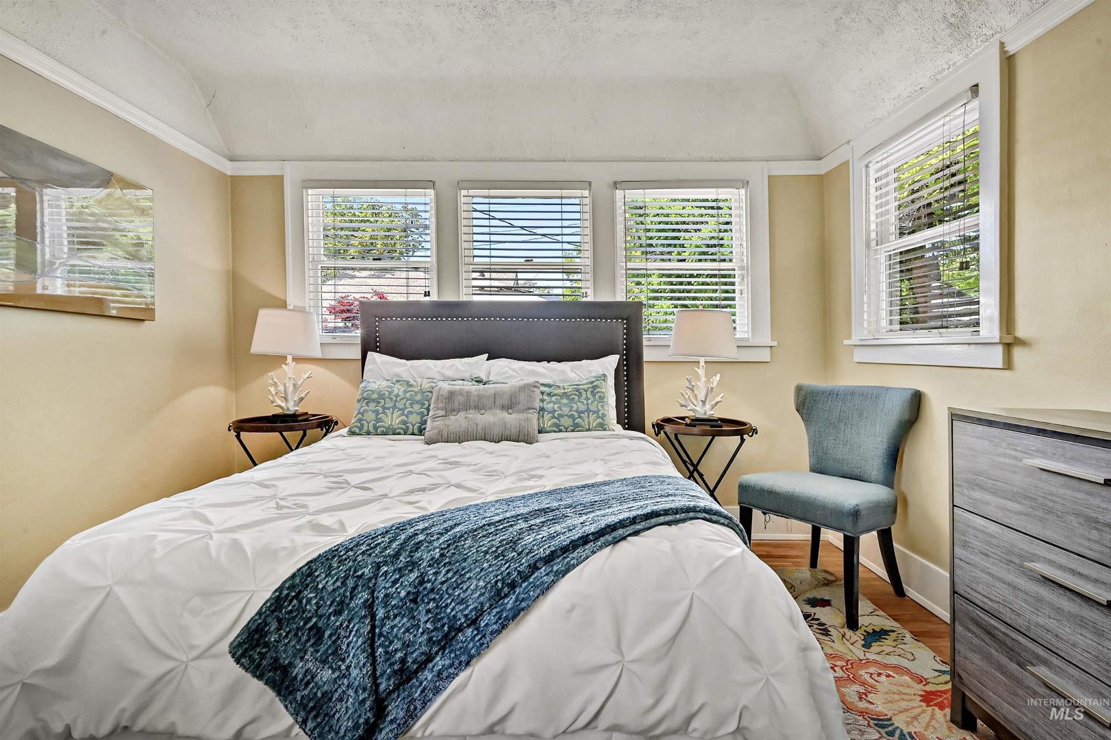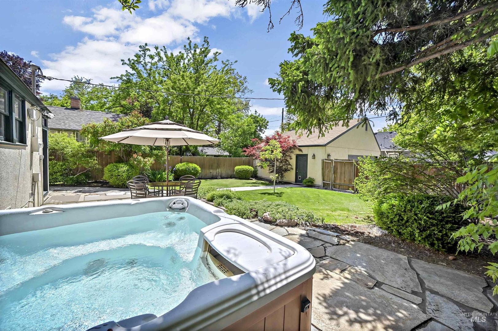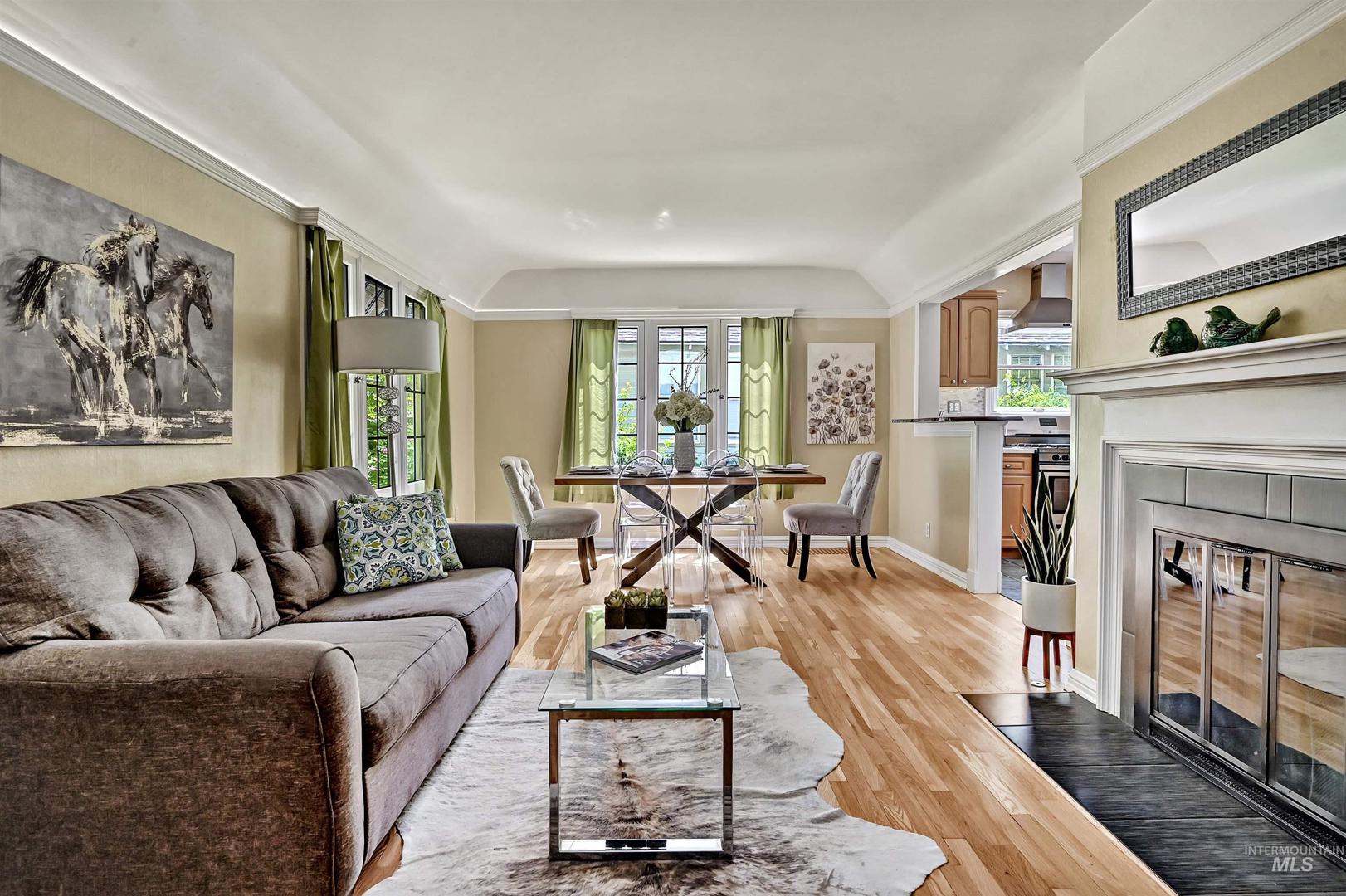 Charming storybook cottage with classic rooflines, dormer windows, & timeless architectural detail on a tree-lined N End street! Enter to coved ceilings, original hardwood floors, & an inviting gas fireplace. Multi-pane leaded-glass windows fill the rooms with natural light, enhancing the home’s warm neutral palette. The remodeled kitchen is both stylish & functional with stainless appliances, quartz countertops, & a pretty tile backsplash! You’ll also find character-filled main-level bedrooms & a bathroom all with original hardware & period details. Upstairs features a large family room ideal for games or movies plus a cozy bedroom tucked beneath the dormers with exposed brick & thoughtful design elements. Head outside to the backyard complete with a flagstone patio, private hot tub, gardens, & mature trees — great for dining al fresco, evening soaks, or relaxing in the shade! You’ll love the oversized two-car garage with additional paved parking — plenty of room for all your gear & toys! NEW ROOF, NEW HVAC!