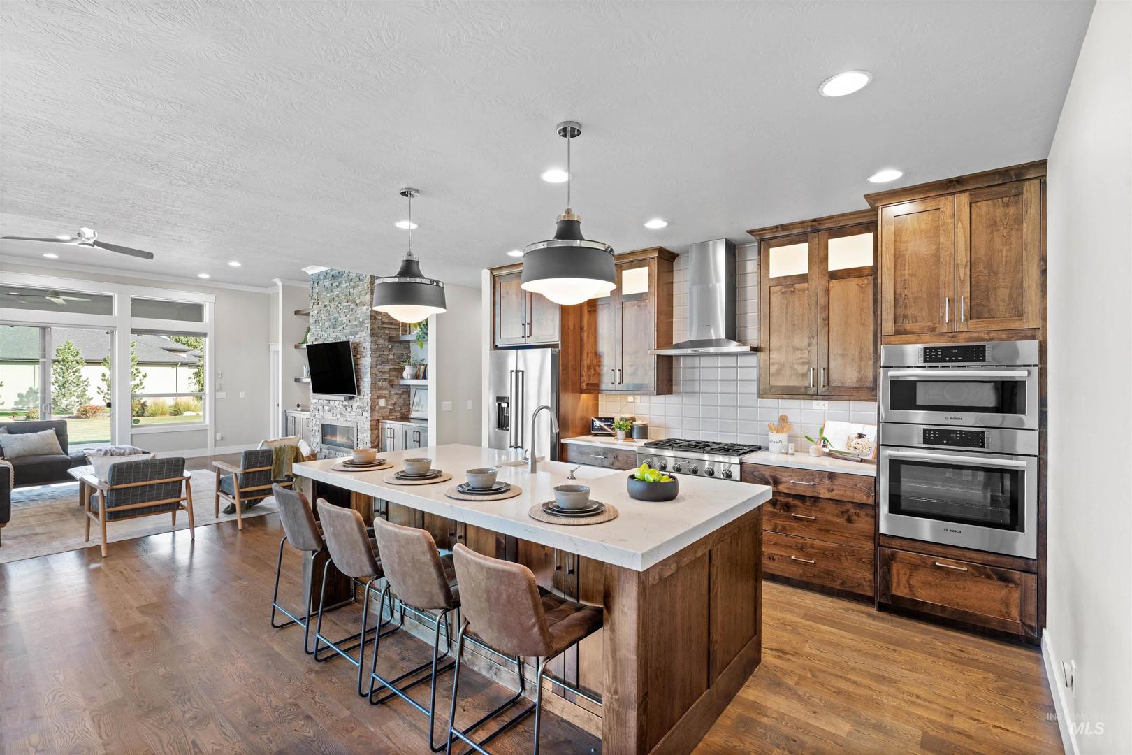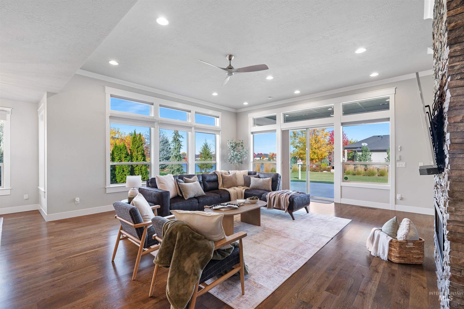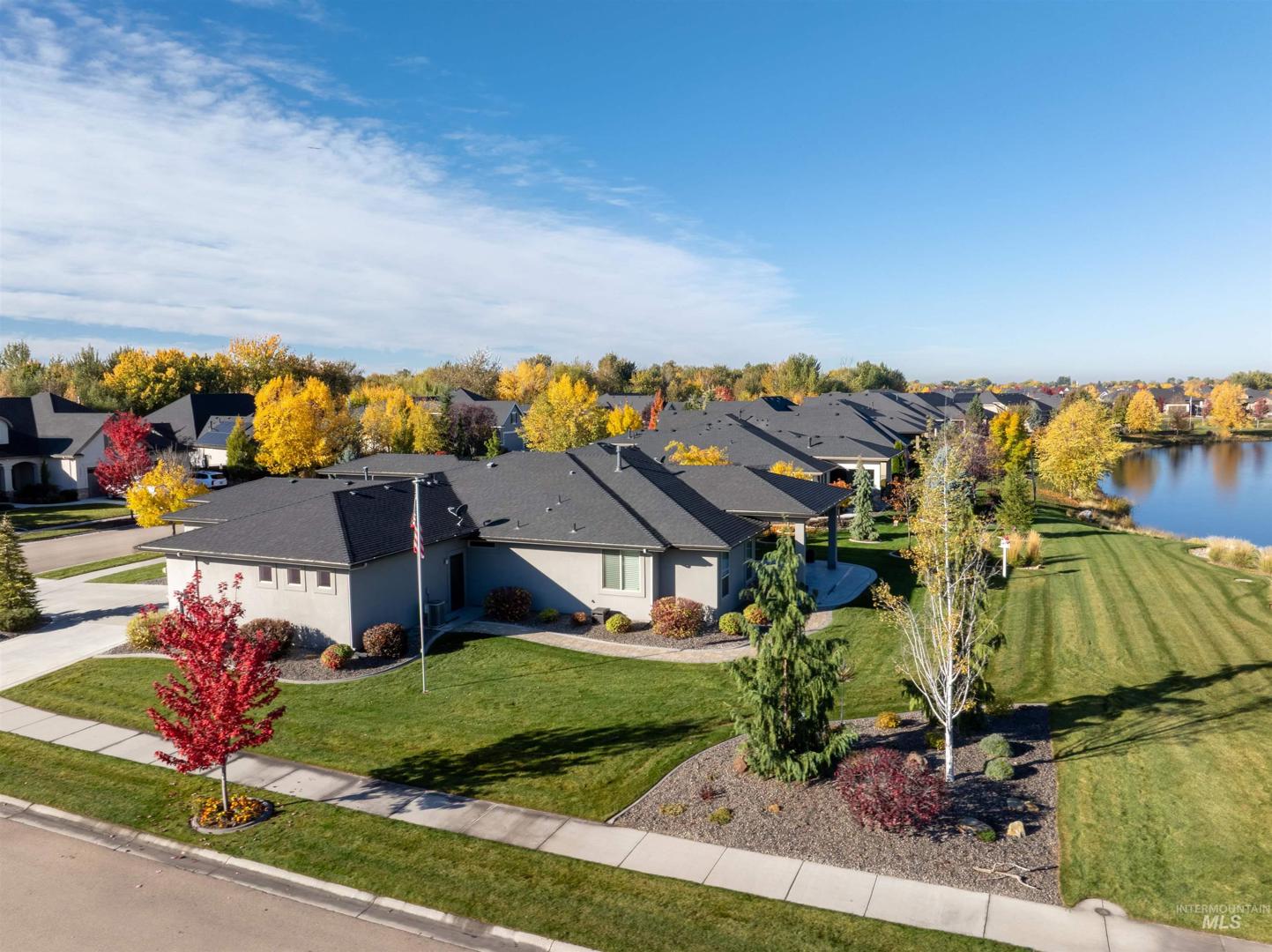 Elegant single-level living in the coveted Preserve at Heron River! Surrounded by beautifully manicured landscaping, tranquil ponds with graceful fountains, and tree-lined walking paths, this home captures the serene charm of Idaho living. This stunning 3-bedroom, 2.5-bath home (+ large home office) offers refined comfort and thoughtful design throughout. The open floor plan showcases hardwood floors, and a bright, inviting great room centered around a cozy gas fireplace. The gourmet kitchen is a chef’s dream - featuring quartz countertops, a 6-burner Thermador gas cooktop, Bosch oven with microwave, and a custom walk-in pantry with abundant storage. The spacious primary suite offers a spa-inspired retreat with dual vanities, a soaking tub, and a large walk-in closet. Enjoy Idaho’s beauty year-round from your fully covered patio overlooking tranquil water views - an ideal setting for morning sunrise or sunset gatherings. The oversized four-car garage provides ample space for vehicles, hobbies, or storage. Residents of Heron River enjoy exclusive access to resort-style amenities: a community pool and clubhouse, pickleball, tennis, and basketball courts, ponds, high-speed fiber optic internet, and scenic walking paths that connect to the Star Riverwalk Park. Discover the perfect blend of elegance, comfort, and community - right here in The Preserve at Heron River. BTVAI
