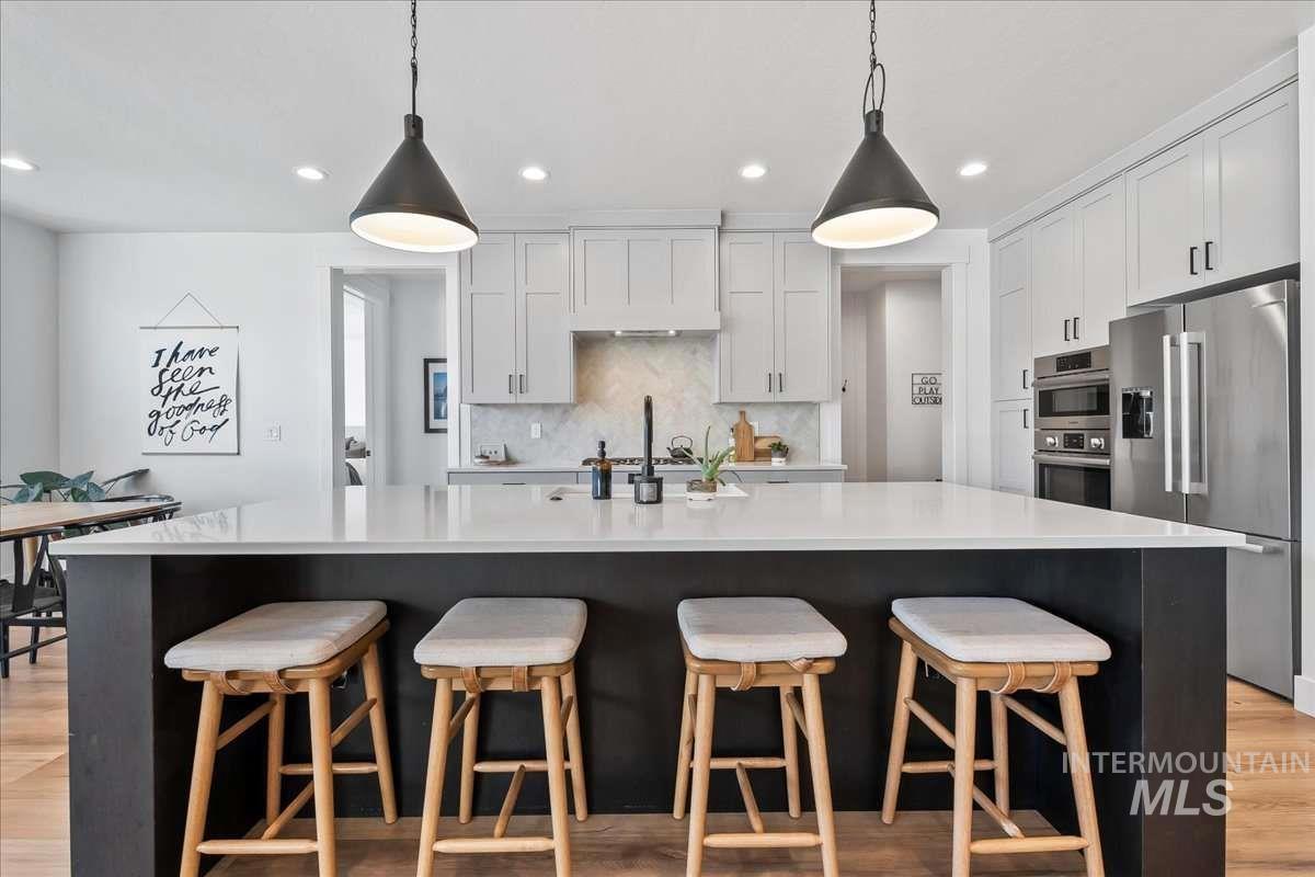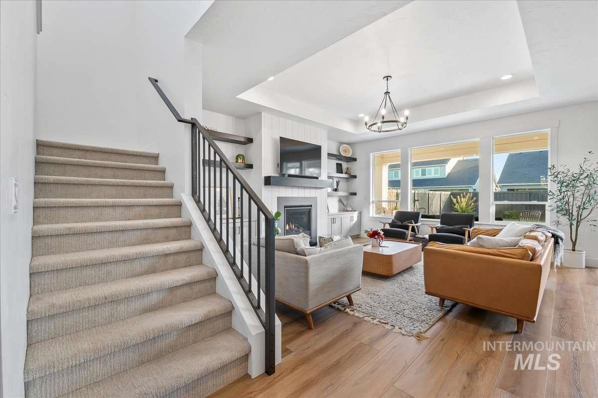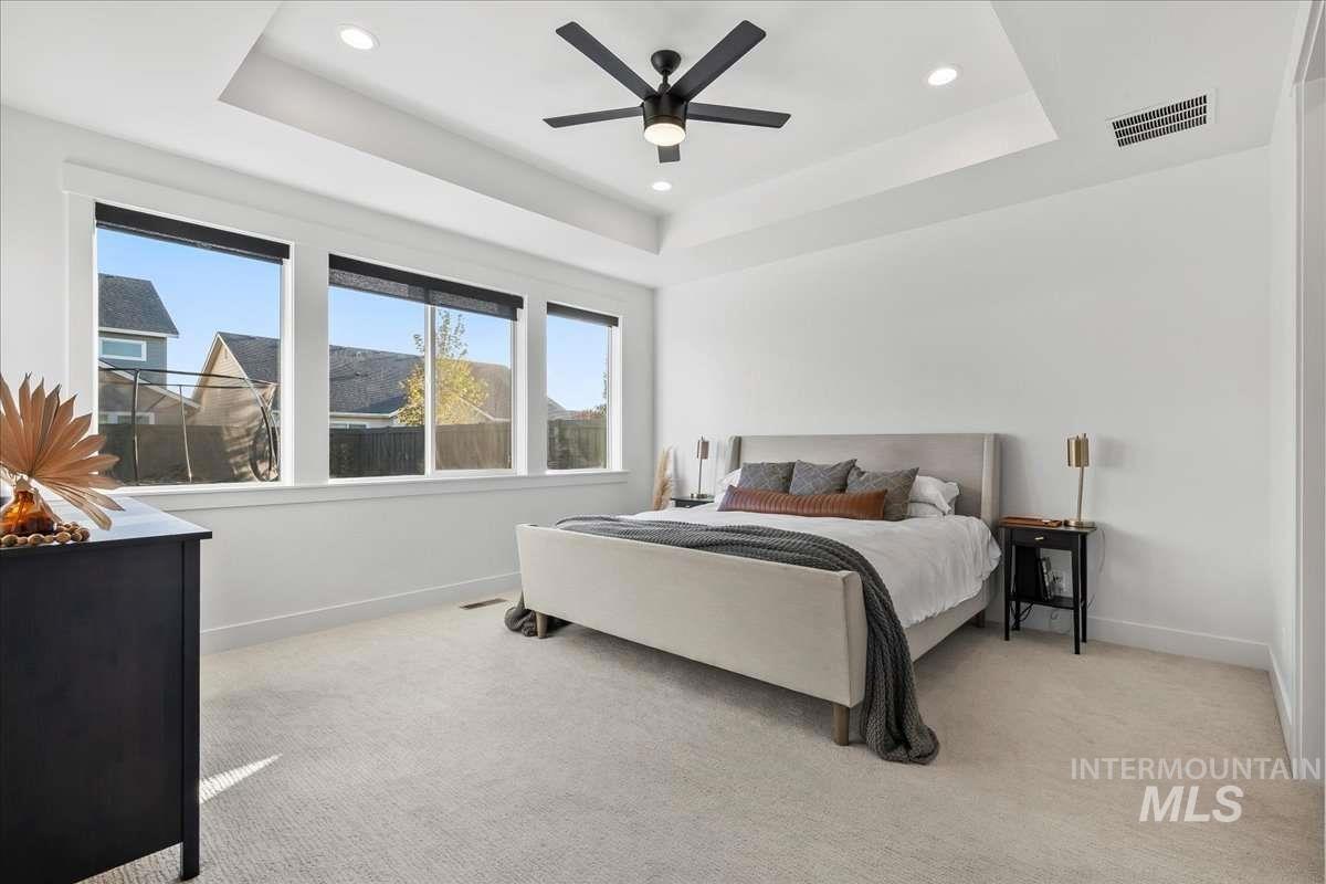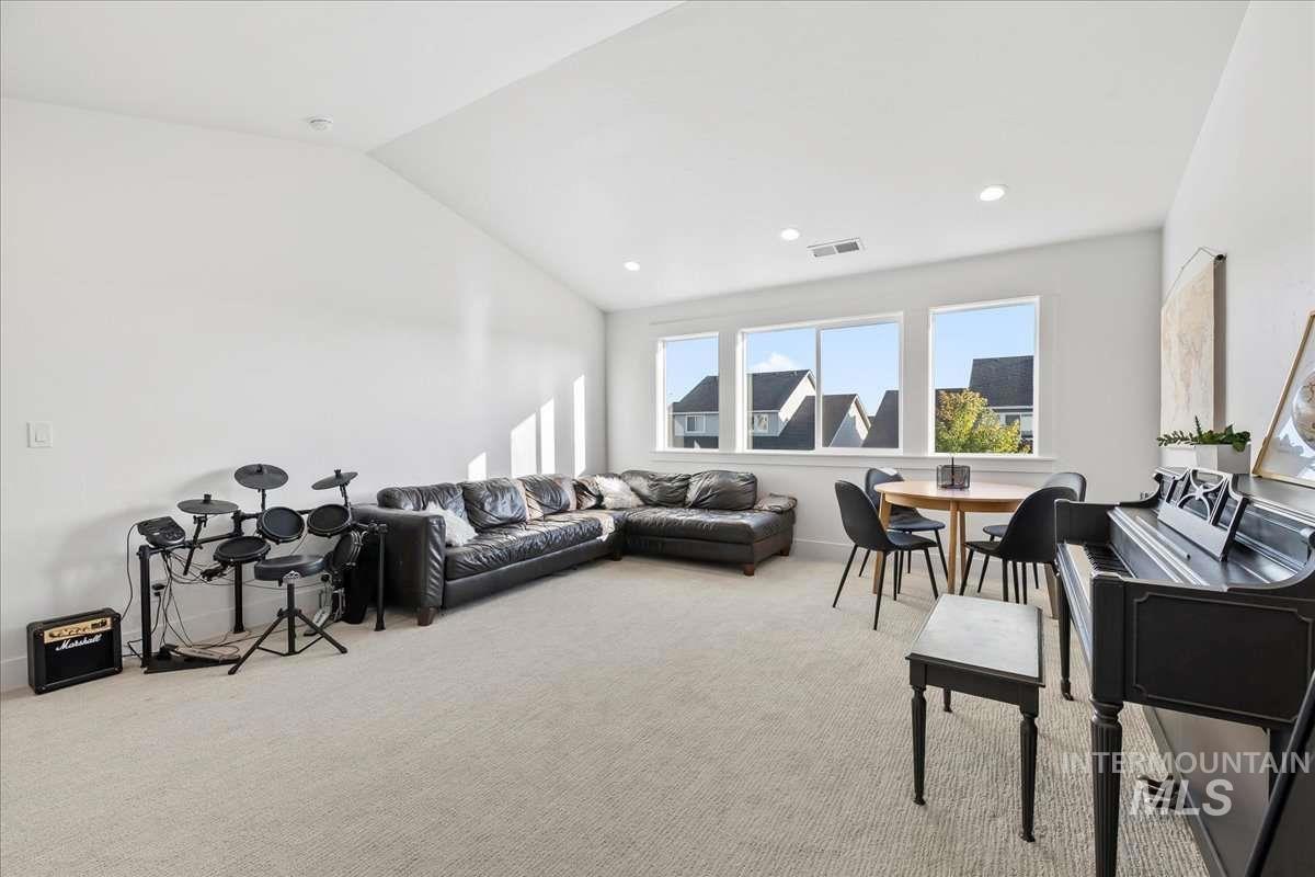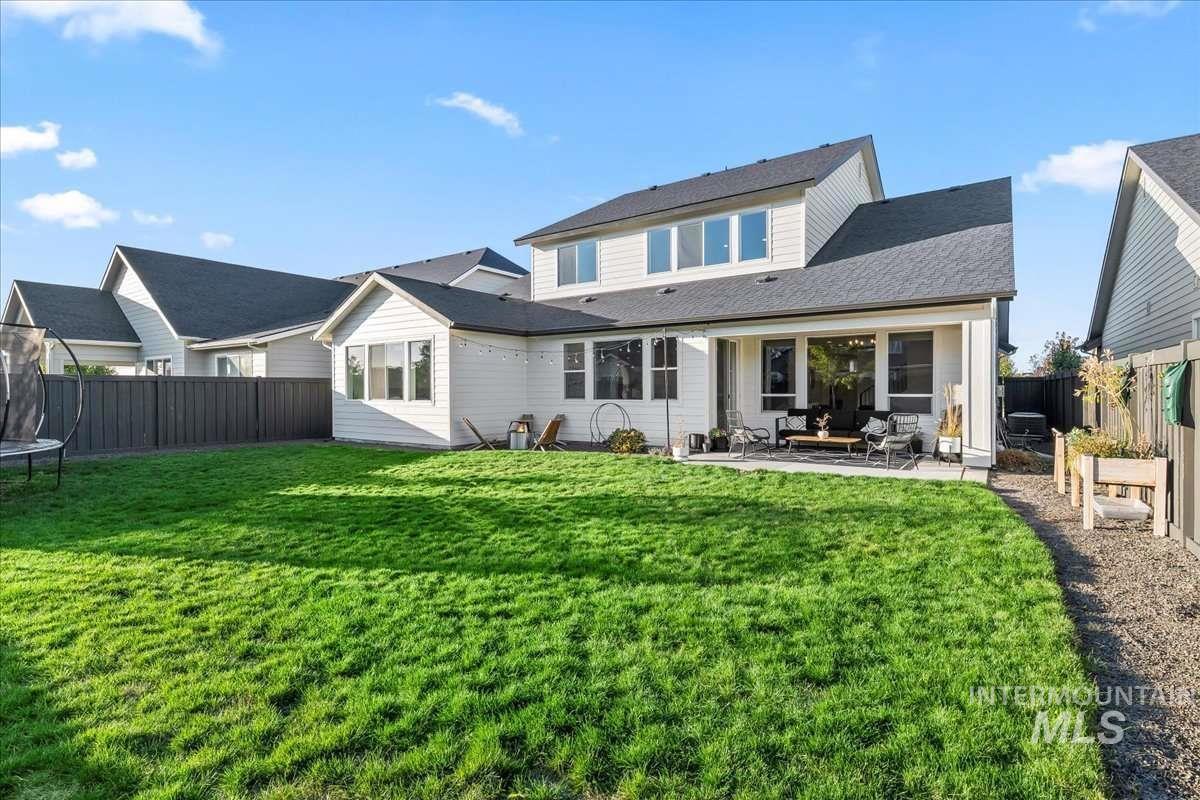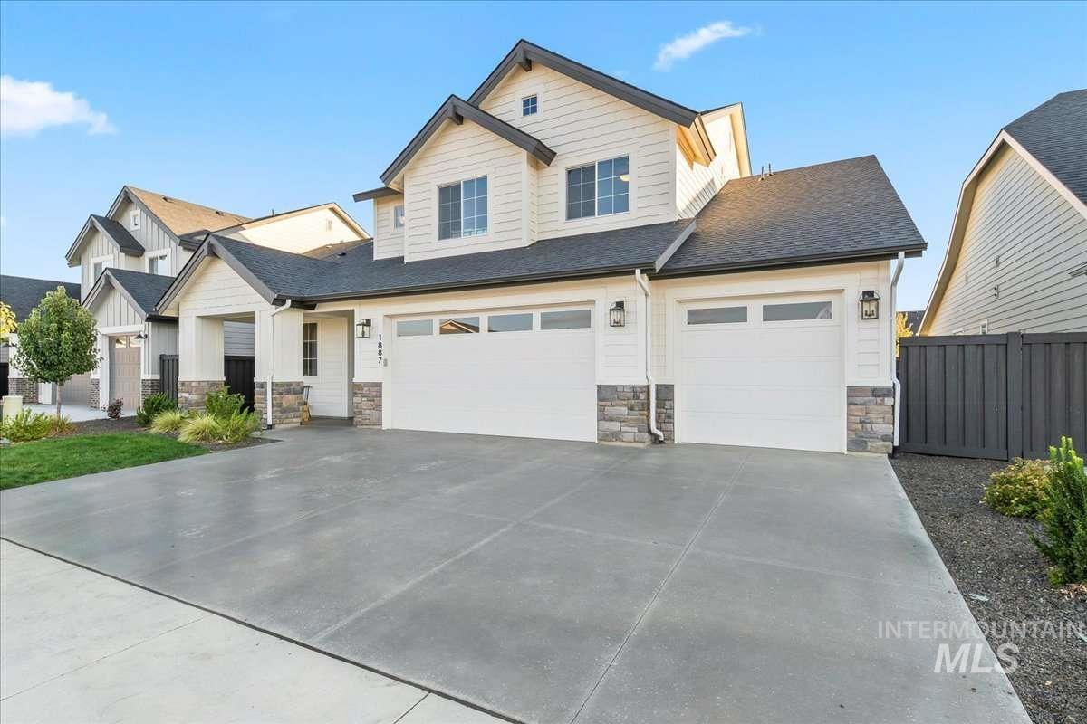 This 2023 Latah model by Alturas Homes in Pinnacle offers 2,927 square feet of well-designed space in South Meridian. Meticulously maintained and in exceptional condition. Main floor: primary suite with en suite bath, dedicated office, powder room, open kitchen with Bosch appliances and walk-in pantry. Great room with south-facing windows. Covered patio with gas stub-out, spacious yard, three-car garage. Upper level: three bedrooms (one with en suite bath), full bath, large recreation room. The location stands out for its proximity to the community pool and clubhouse. Discovery Park connects via direct path - splash pad, bike park, skate park, tennis, pickleball, ninja course. Walk to the new library or weekly farmer`s market. Gem Prep Academy sits at the neighborhood entrance. Pinnacle homes this close to the park and community amenities move quickly. This one is ready now.