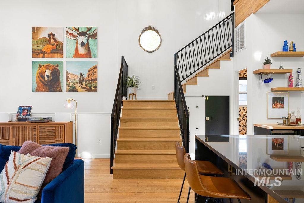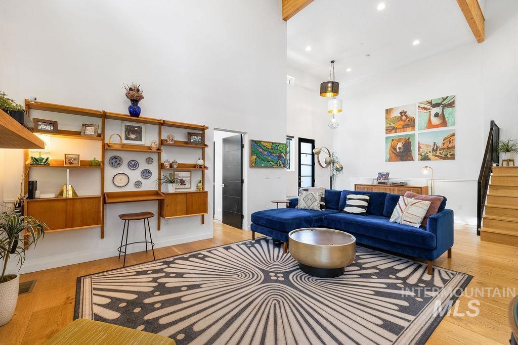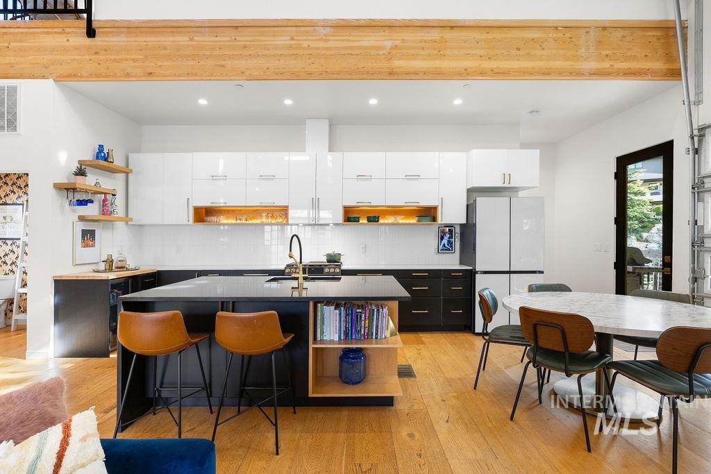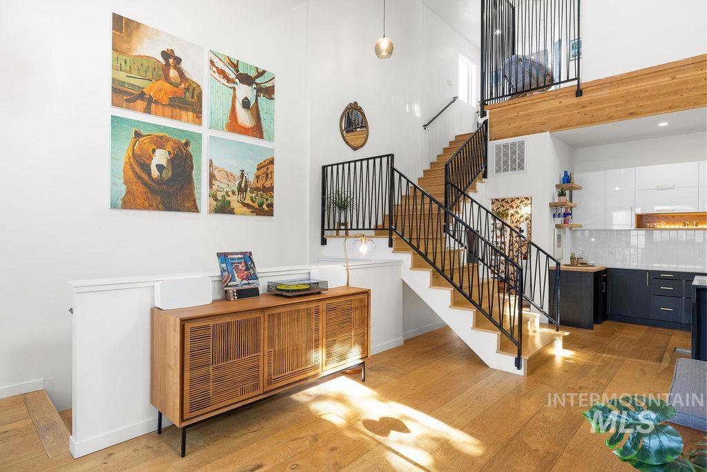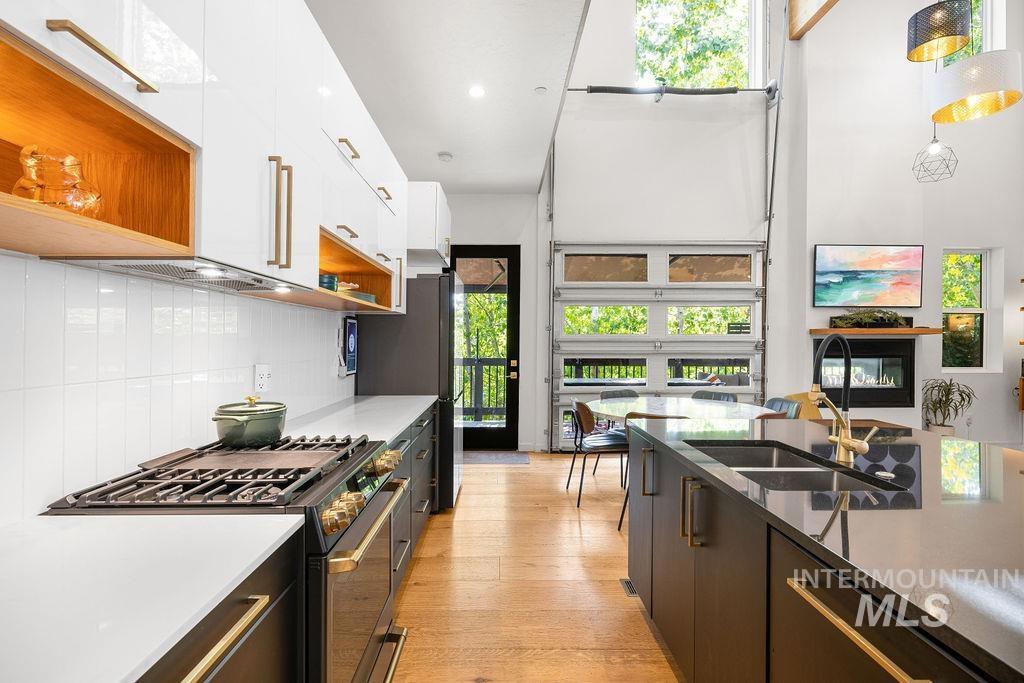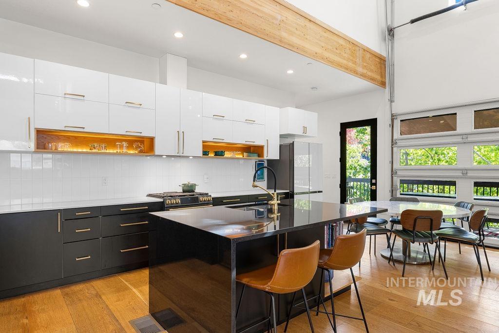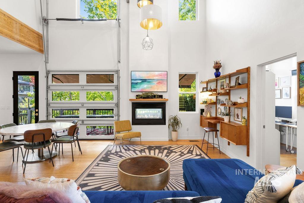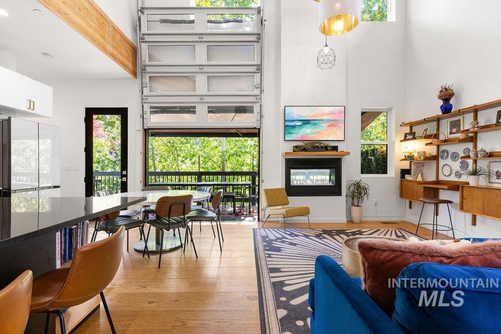 Gorgeous contemporary home nestled in Boise’s coveted North End Foothills! Prime location near Hyde Park’s charming shops and restaurants, downtown, parks and endless trails. Step inside to soaring 20-ft beamed ceilings, wide-plank white oak floors, curated lighting fixtures and abundant natural light throughout. The open layout features a sleek chef’s kitchen with quartz waterfall island and new gas range. The great room’s roll-up garage door and double-sided fireplace open to a private deck for seamless indoor-outdoor living and entertaining. Main-level primary is a true retreat with a sitting/reading nook, direct deck access, luxurious spa bath with heated tile floors and glass-enclosed shower/soaking tub, and a custom California Closet system with laundry hookups. Upstairs offers a bonus/loft area, 2 bedrooms with custom closets, a full bath and laundry. The versatile lower-level, with 9-ft ceilings and separate entry, functions as a guest suite, in-law apt., or family/media room with kitchenette, dining space, bedroom, bath, closets, laundry and deck. Neighborhood hilltop trail across the street for spectacular sunset and downtown skyline views! Main-level office, fenced backyard, insulated garage. Zoned for great schools!