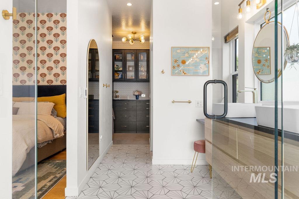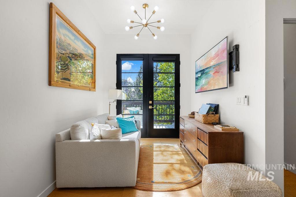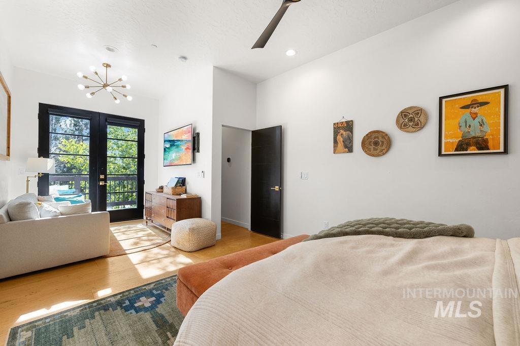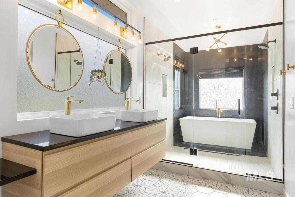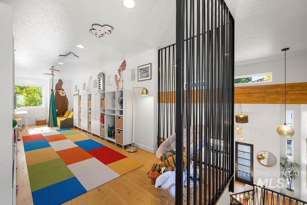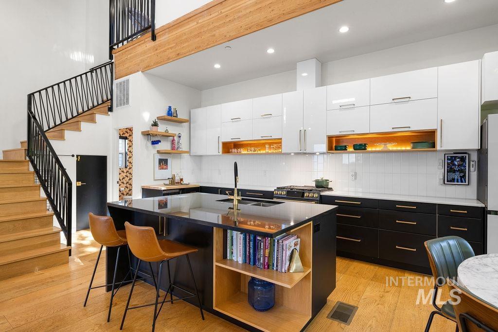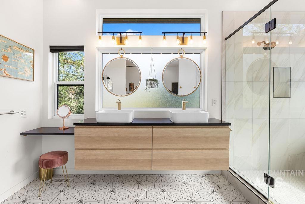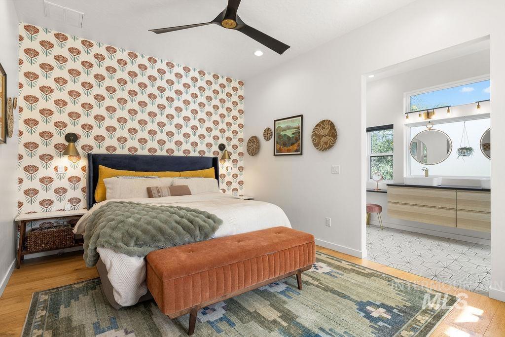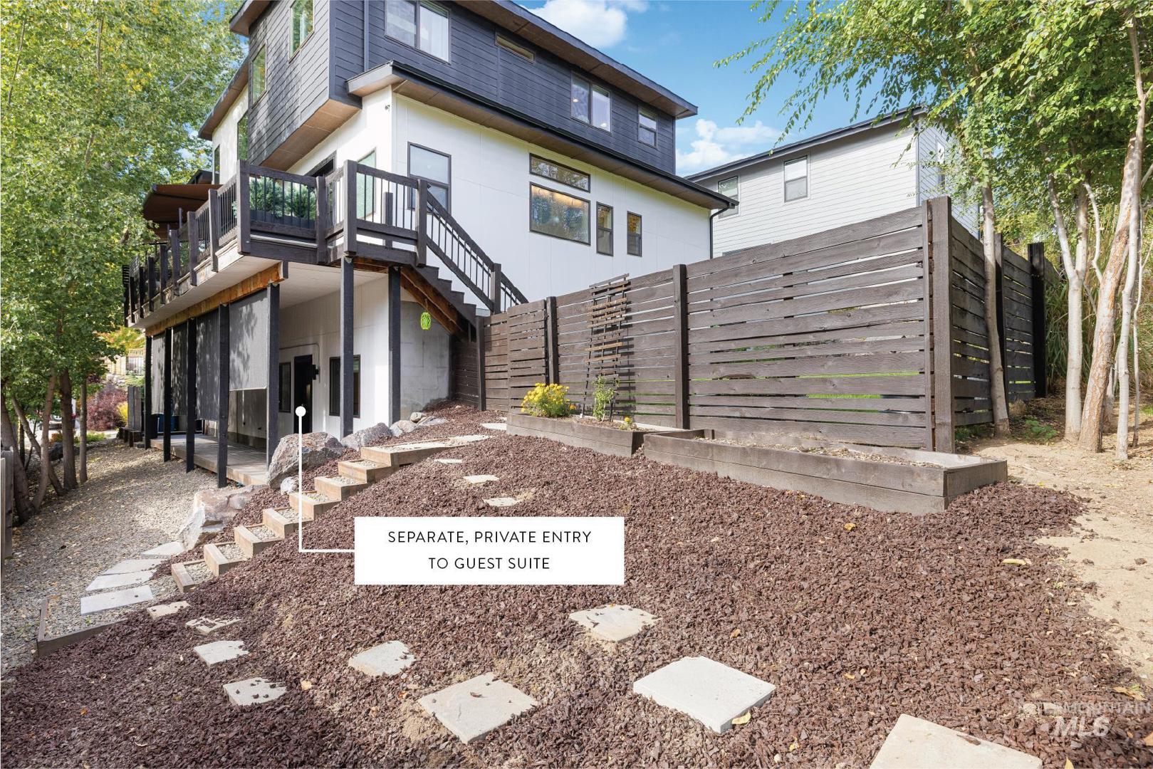 Gorgeous contemporary home nestled in Boise’s coveted North End Foothills! Prime location near Hyde Park’s charming shops and restaurants, downtown, parks and endless trails. Step inside to soaring 20-ft beamed ceilings, wide-plank white oak floors, curated lighting fixtures and abundant natural light throughout. The open layout features a sleek chef’s kitchen with quartz waterfall island and new gas range. The great room’s roll-up garage door and double-sided fireplace open to a private deck for seamless indoor-outdoor living and entertaining. Main-level primary is a true retreat with a sitting/reading nook, direct deck access, luxurious spa bath with heated tile floors and glass-enclosed shower/soaking tub, and a custom California Closet system with laundry hookups. Upstairs offers a bonus/loft area, 2 bedrooms with custom closets, a full bath and laundry. The versatile lower-level, with 9-ft ceilings and separate entry, functions as a guest suite, in-law apt., or family/media room with kitchenette, dining space, bedroom, bath, closets, laundry and deck. Neighborhood hilltop trail across the street for spectacular sunset and downtown skyline views! Main-level office, fenced backyard, insulated garage. Zoned for great schools!