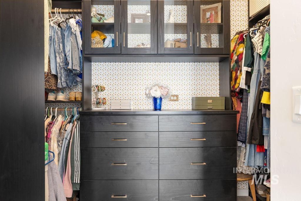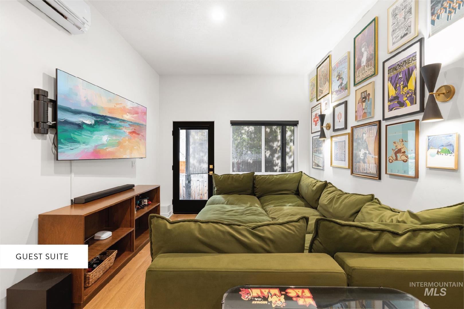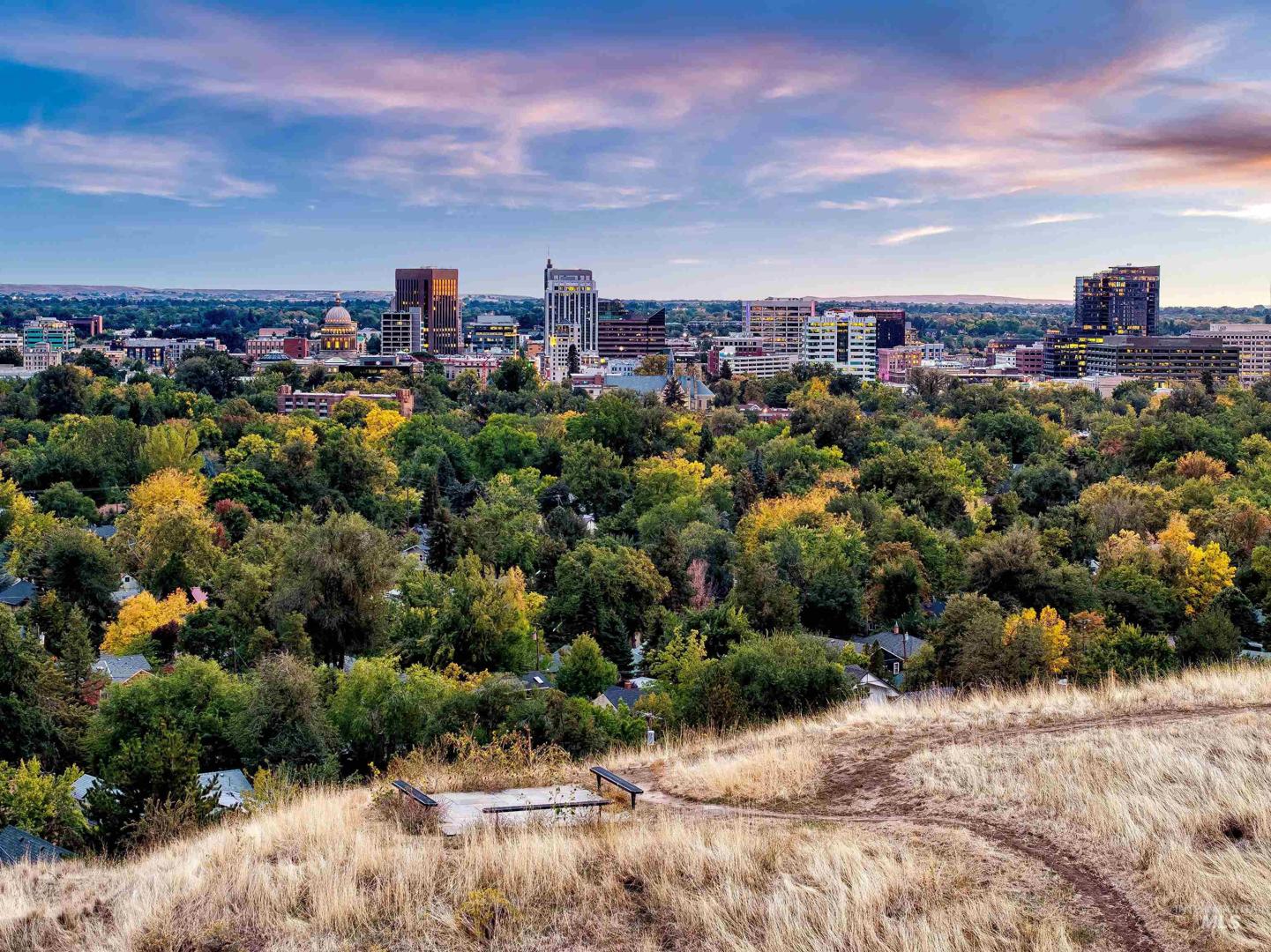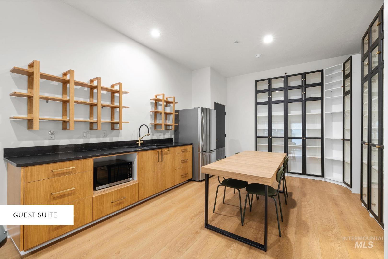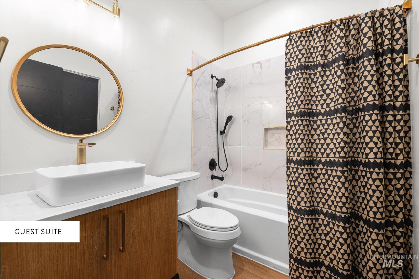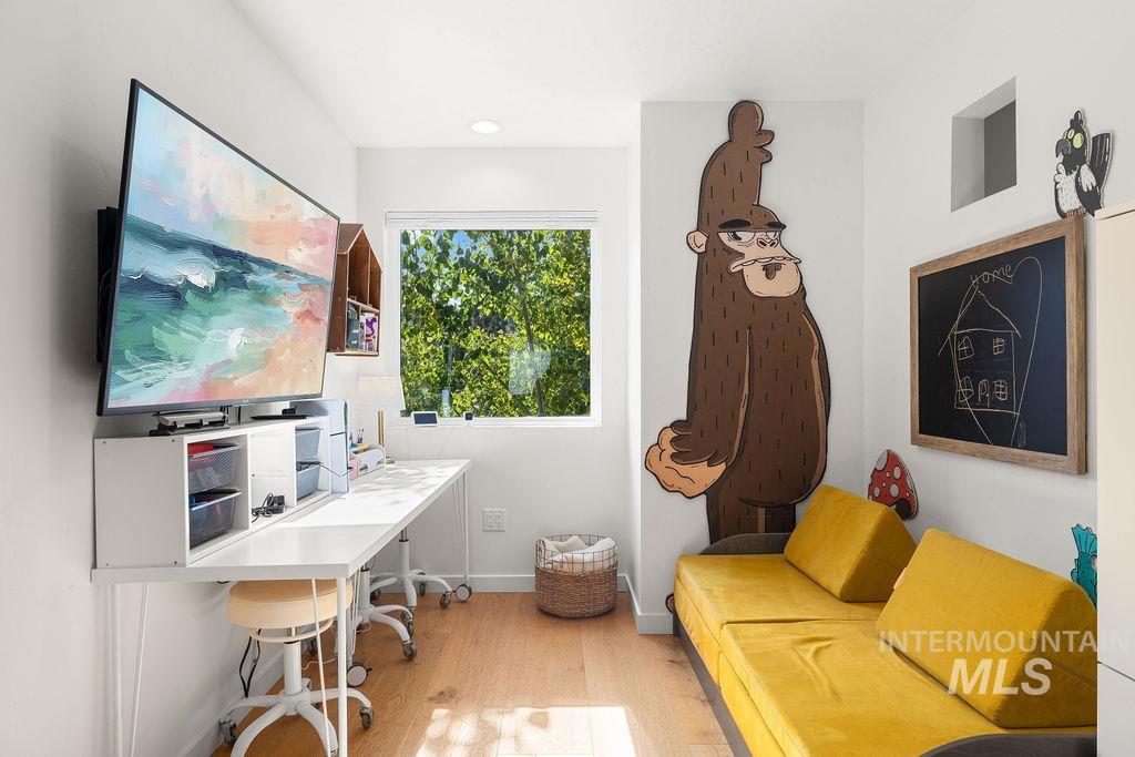 Gorgeous contemporary home nestled in Boise’s coveted North End Foothills! Prime location near Hyde Park’s charming shops and restaurants, downtown, parks and endless trails. Step inside to soaring 20-ft beamed ceilings, wide-plank white oak floors, curated lighting fixtures and abundant natural light throughout. The open layout features a sleek chef’s kitchen with quartz waterfall island and new gas range. The great room’s roll-up garage door and double-sided fireplace open to a private deck for seamless indoor-outdoor living and entertaining. Main-level primary is a true retreat with a sitting/reading nook, direct deck access, luxurious spa bath with heated tile floors and glass-enclosed shower/soaking tub, and a custom California Closet system with laundry hookups. Upstairs offers a bonus/loft area, 2 bedrooms with custom closets, a full bath and laundry. The versatile lower-level, with 9-ft ceilings and separate entry, functions as a guest suite, in-law apt., or family/media room with kitchenette, dining space, bedroom, bath, closets, laundry and deck. Neighborhood hilltop trail across the street for spectacular sunset and downtown skyline views! Main-level office, fenced backyard, insulated garage. Zoned for great schools!
