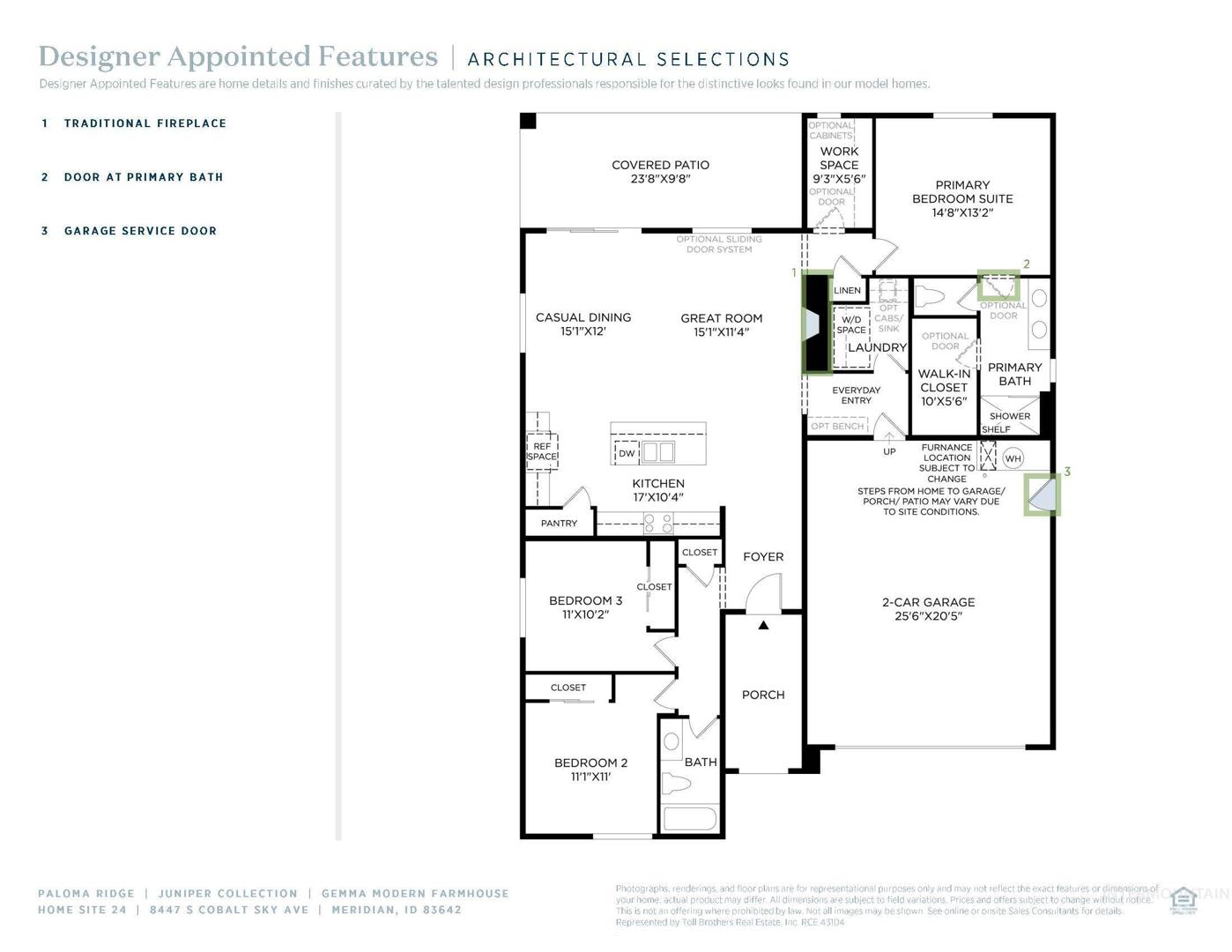 "The Gemma" This open floor plan seamlessly connects foyer, great room with cozy fireplace, casual dining, and kitchen. Entertaining is made easy with the adjacent casual dining area that opens up to a covered patio, ideal for indoor-outdoor living. Retreat to the private primary suite, complete with a luxurious shower and a separate private water closet. Two additional bedrooms provide ample space for family or guests, while the laundry room and workspace add practicality to everyday life. 2 car garage. BTVAI