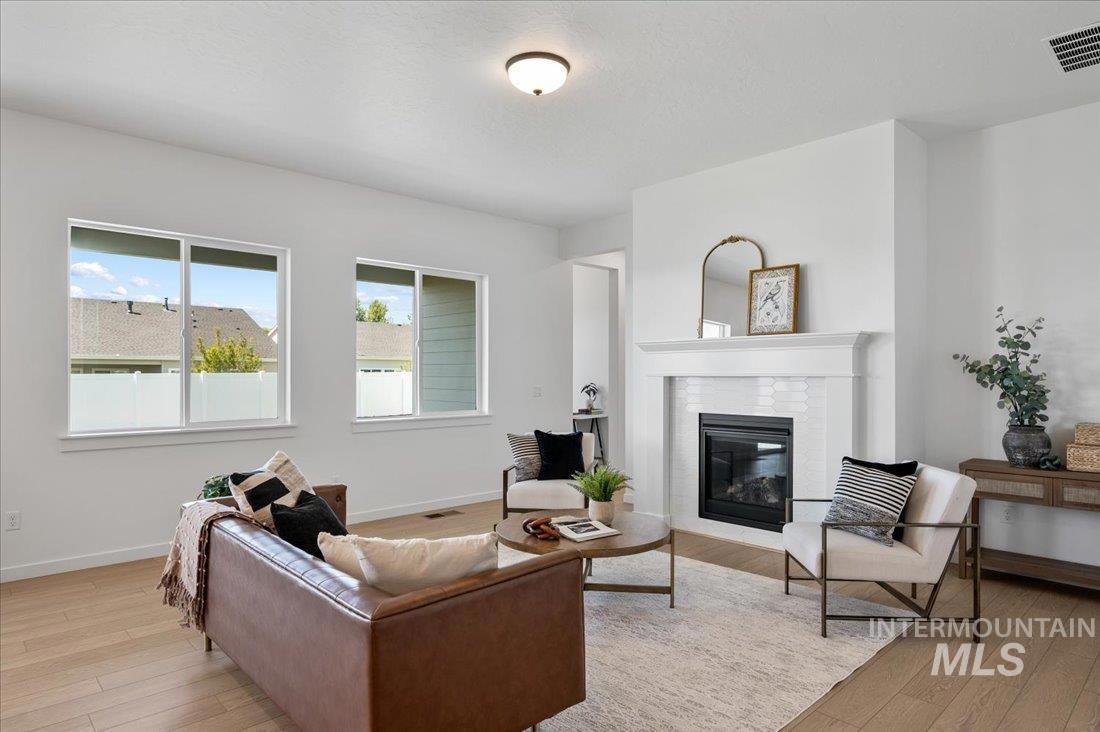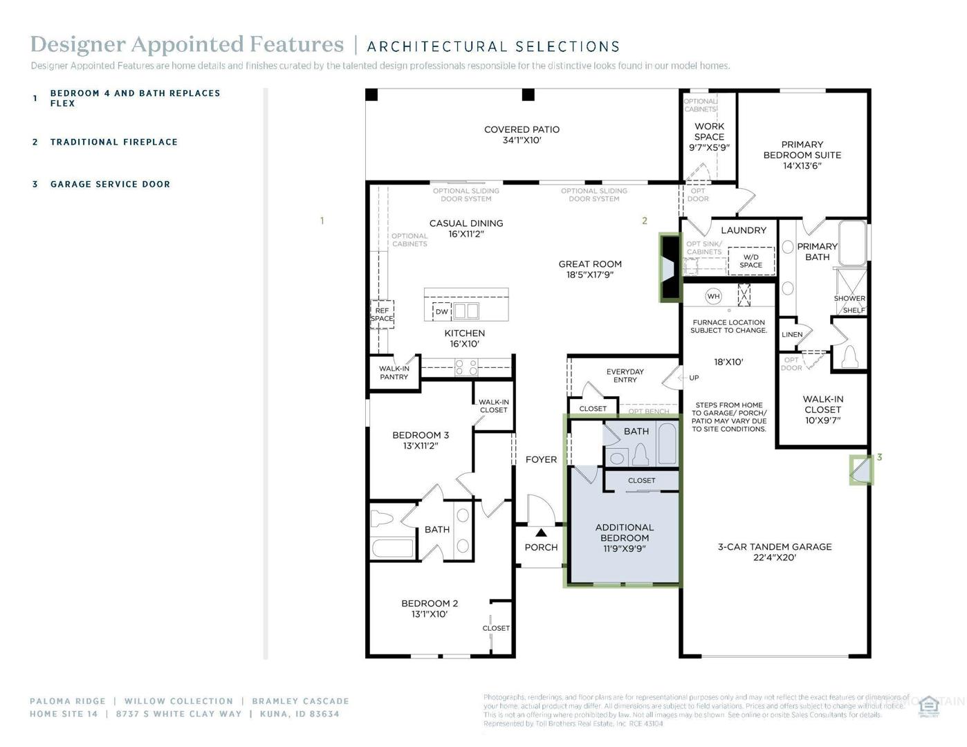 "The Bramley" A welcoming foyer leads to a large great room with 10 foot ceilings, stunning views of the outdoors and access to an expansive covered patio creating a perfect space for indoor-outdoor entertaining. A well-equipped kitchen with island has direct access to the casual dining area boasting ample windows that provide natural light throughout. Two additional bedrooms share a hall bath with a third bedroom having its own bath. Completing the primary suite is a spa-like private bath with dual sink vanity, tile surround shower, separate soaking tub, and spacious walk-in closet. 3 Car garage. Front and rear landscape included. BTVAI.