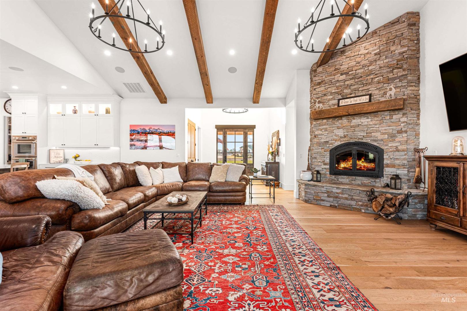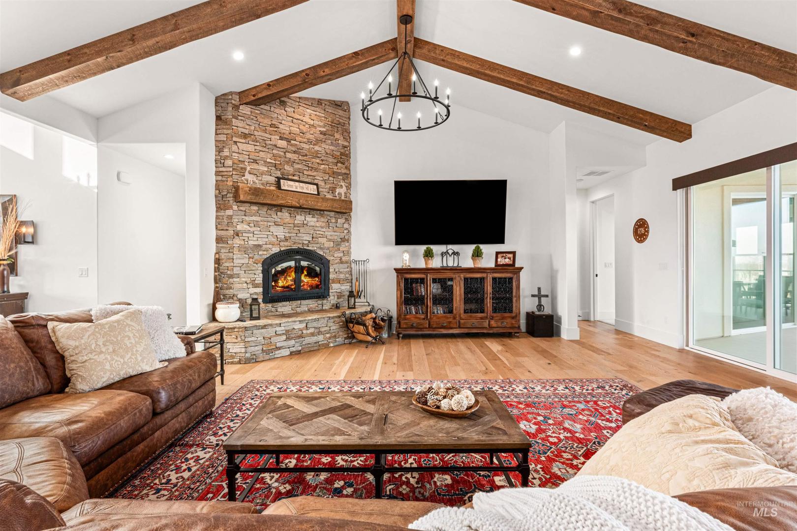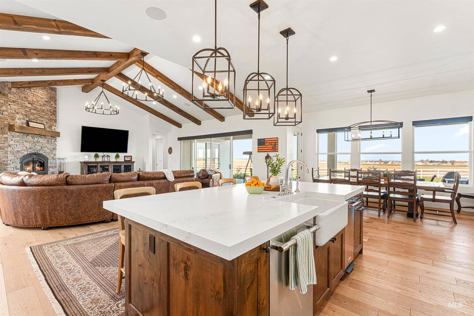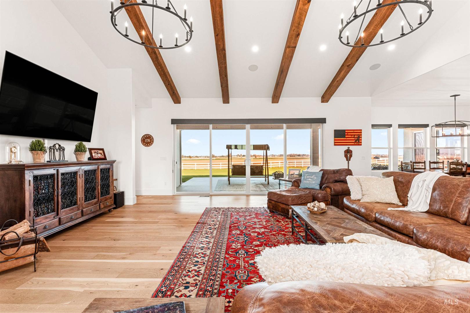 Experience luxury country living in this near-new rambler on 2.18 acres with no backyard neighbors. Set on a quiet dead-end street, this home was built with exceptional attention to detail, featuring 2x6 fully insulated walls inside and out for superior comfort and efficiency. The chef’s kitchen is outfitted with Thermador brand and Sub-Zero brand appliances, tall ceilings, 8-foot knotty alder doors, and expansive windows create a bright, open feel. Enjoy thoughtful upgrades throughout, including surround sound, tank-less water heater, dog shower, security system, and abundant natural light. A home office and bonus room offer flexibility for work and play, while the extra-deep garage easily fits three full-size trucks plus a car. With livestock allowed, this property offers space, freedom, and quiet living rarely found this close to town.