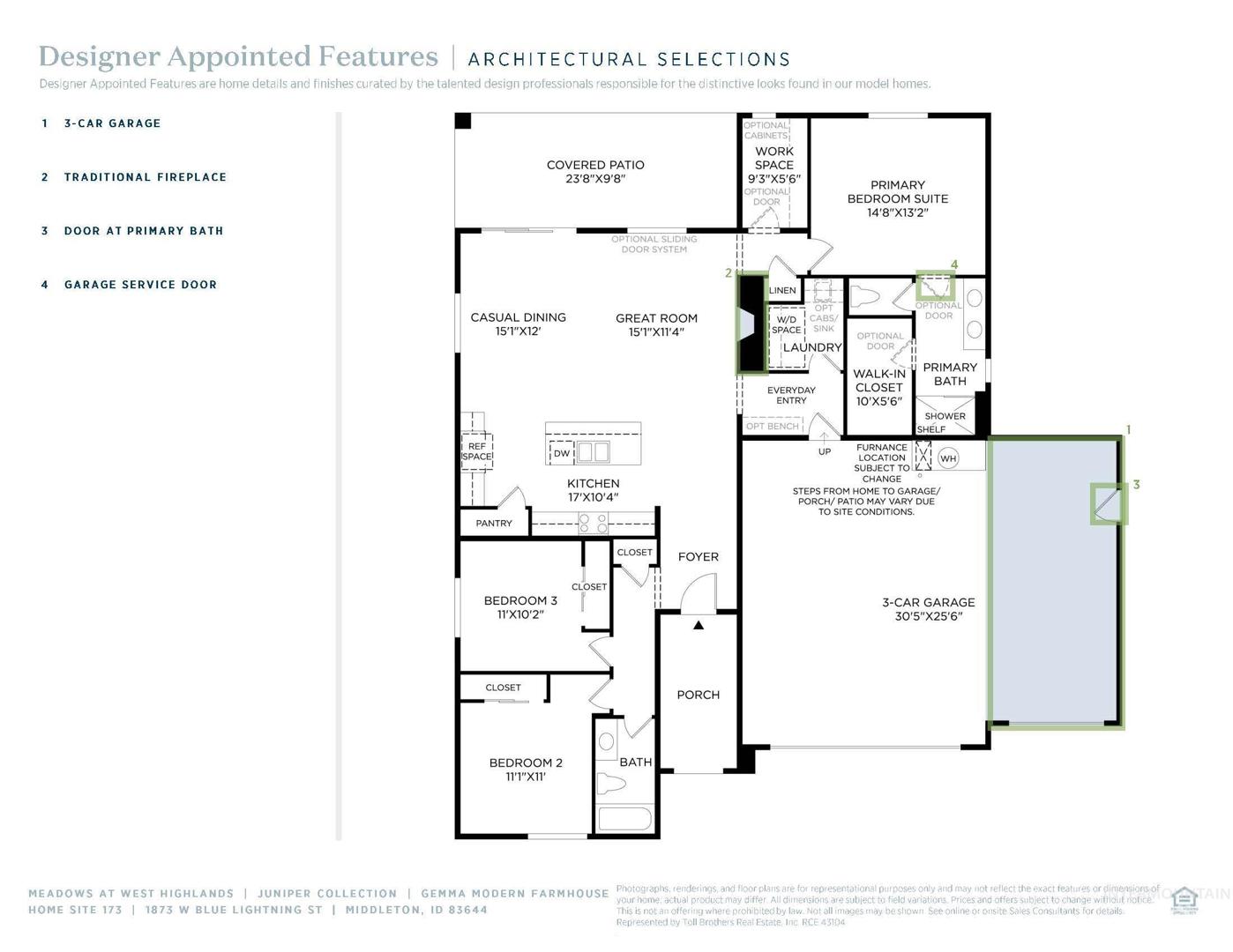 "The Gemma". This single-family residence boasts an open floor plan that creates a seamless flow throughout. As soon as guests enter the welcoming foyer, they are greeted by the spacious great room with fireplace. Entertaining is made easy with the adjacent casual dining area that opens up to a covered patio, ideal for indoor-outdoor living. As well as a well-appointed kitchen that features an island with seating and plenty of counterspace and cabinets. Retreat to the private primary suite, complete with a luxurious shower with seat and a separate private water closet. Two additional bedrooms provide ample space for family or guests, while the laundry room adds practicality to everyday life along with a dedicated workspace near the primary suite. 3 car garage. Front and rear landscape included. Home is under construction. Photos are similar. BTVAI